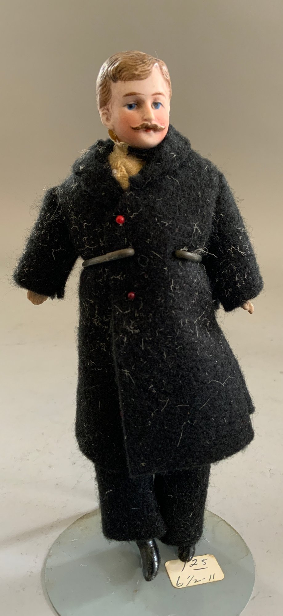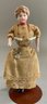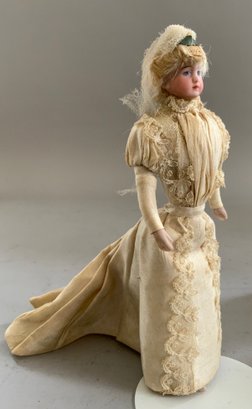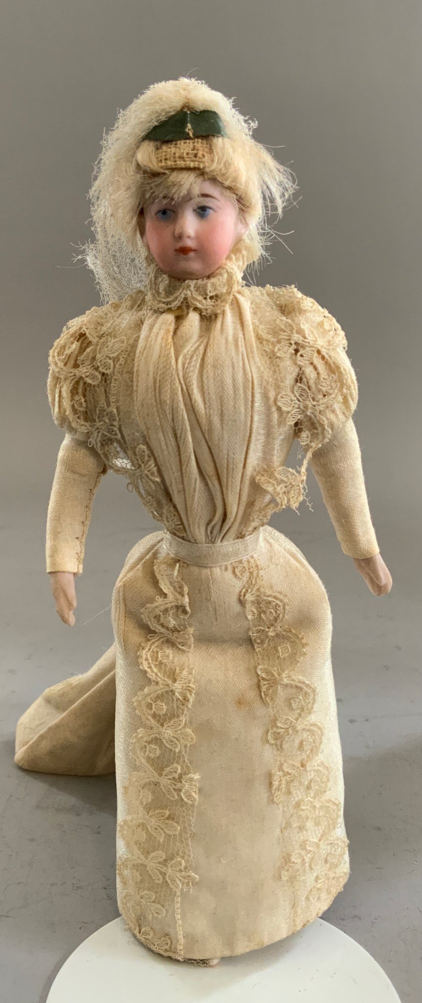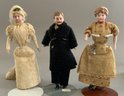 Lot of 3 bisque head, Doll House Dolls, ptd features, cloth bodies w/ bisque limbs, 7” Bride, mohair wig; 6 ½” Maid in original dress w/ chatelaine & 6 ¾” Groom w/ moustache in black suit