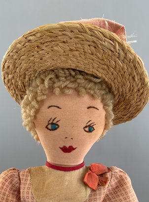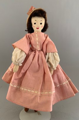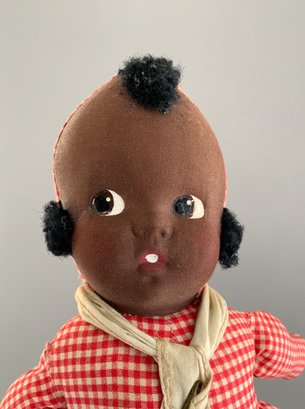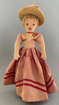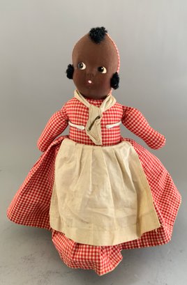 Lot of 3 cloth dolls, 1 – 12” Topsy Turvey, molded mask face, in red check outfit (light stains), painted features, 1 – 15” stitched features, red check dress (faded), & 1 – 14” stitched features, red check dress, brown hair