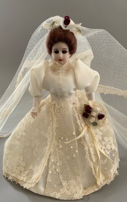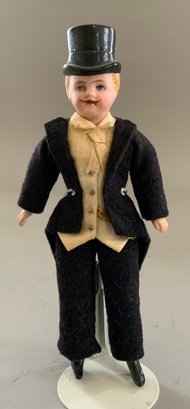 Lot of 3 Doll House Dolls: 2 Brides 5” & 7” glass eyes Mohair, period gowns and a 6” groom in a top hat wearing a Tux… ptd features w/ moustache