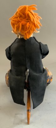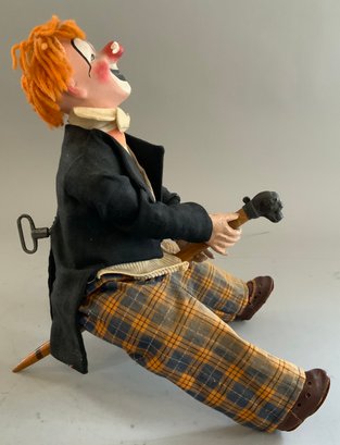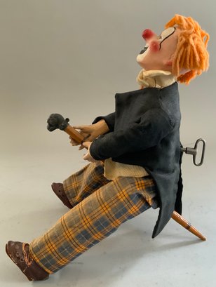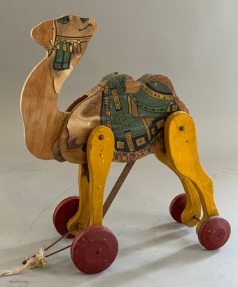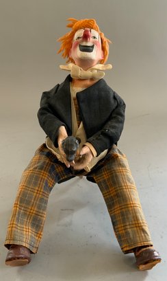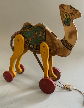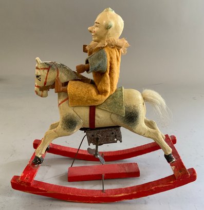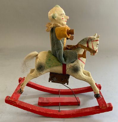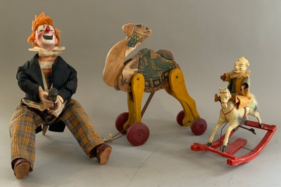 Lot of 3 early toys, 1 – 7 ½” tall key wind clown on a rocking horse, wood & paper mache ( horse has various cracks), 1- 10” Camel pull toy, wood and paper litho (paper loss), & 12” clown on hobby horse (dog head), paper mache, key wind (over wound) (chip on nose)