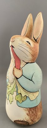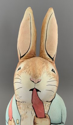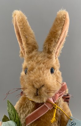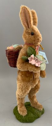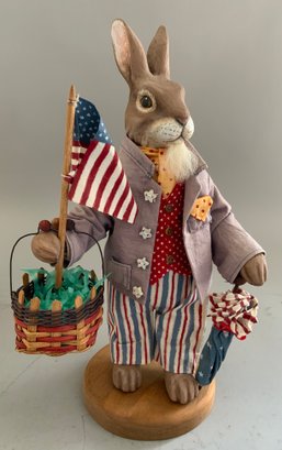 Lot of 3 Easter rabbits, 16” Bethany Lowe Designs velveteen rabbit holding flowers & carrying a basket of eggs, label on basket, 12” patriotic rabbit by Teresa Olson, painted features & 17 ½” cloth Peter rabbit weighted door stop
