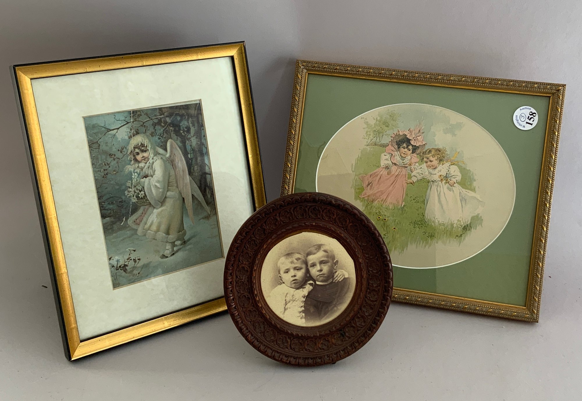 Lot of 3 Framed Prints of children / Babies: Brother & Sister in a (6”) round, carved walnut frame, Gold framed by in Victorian Dress (10 ½” x 9”), & Gold frame early Chromo-litho of an angel in winter (8” x 10”)