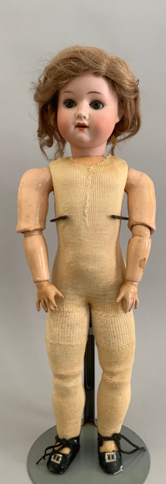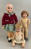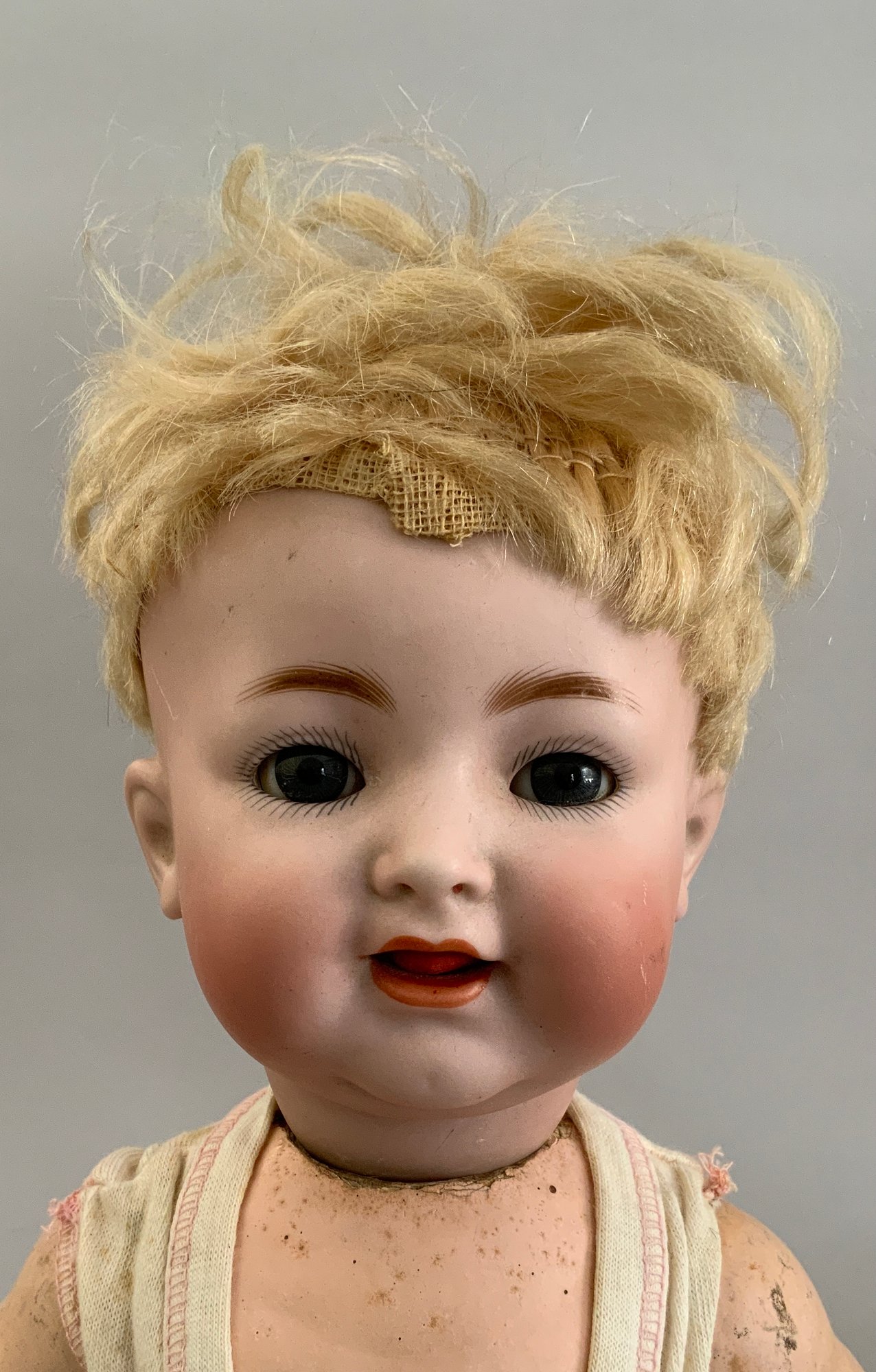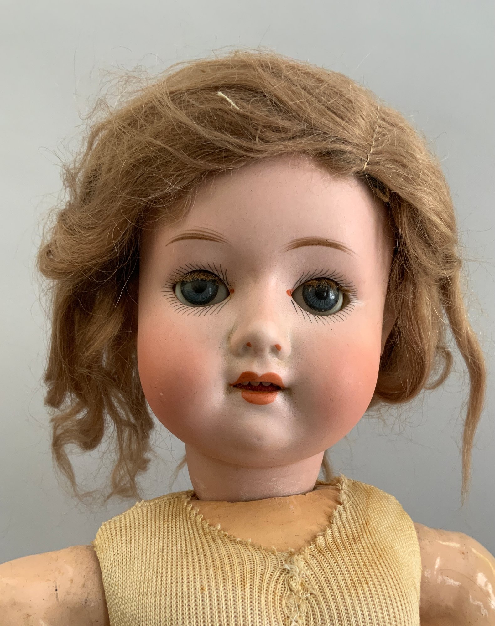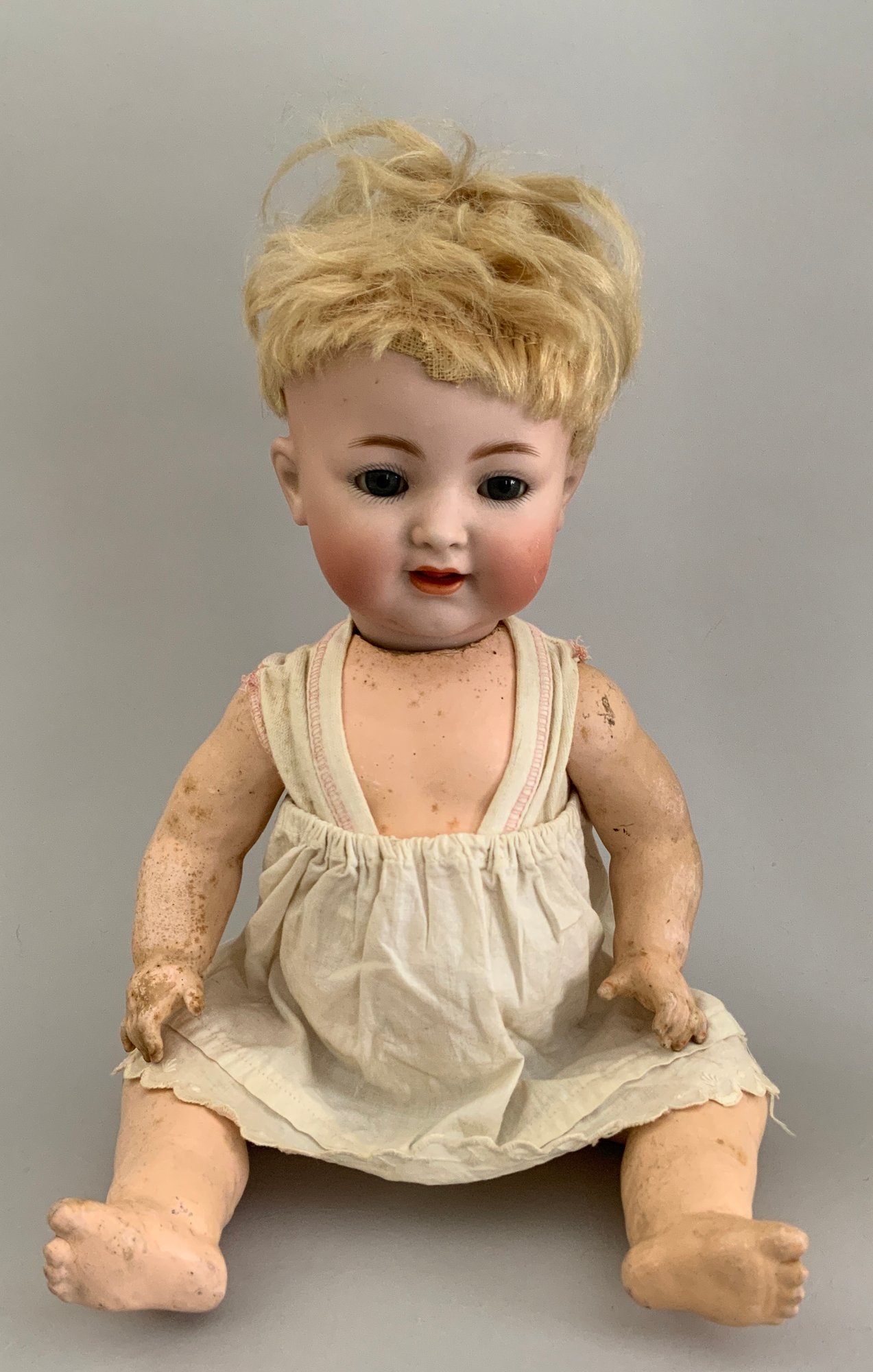 Lot of 3 – German bisque head dolls, 1 – 25” KH (Karl Hartmann), brown glass eyes, OM with teeth, no wig, BJCB, blue print dress (face rub, needs restringing), 1 – 19 ½” MOA*200-21/2 (Max Oscar Arnold), blue glass sleep eyes, OM with teeth, brown mohair wig (glued down), BJCB, & 1 – 16” K*R Simon & Halbig 126, blue glass sleep eyes, blonde mohair wig (glued down) OM with teeth & wobble tongue, 5 pc compo baby body as is, stained white outfit