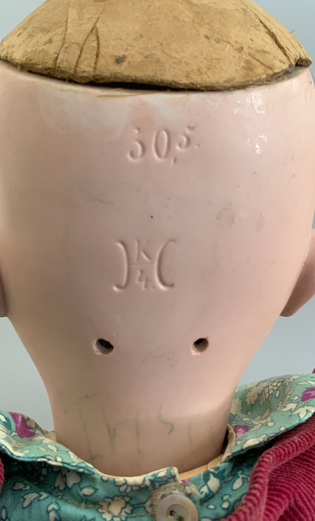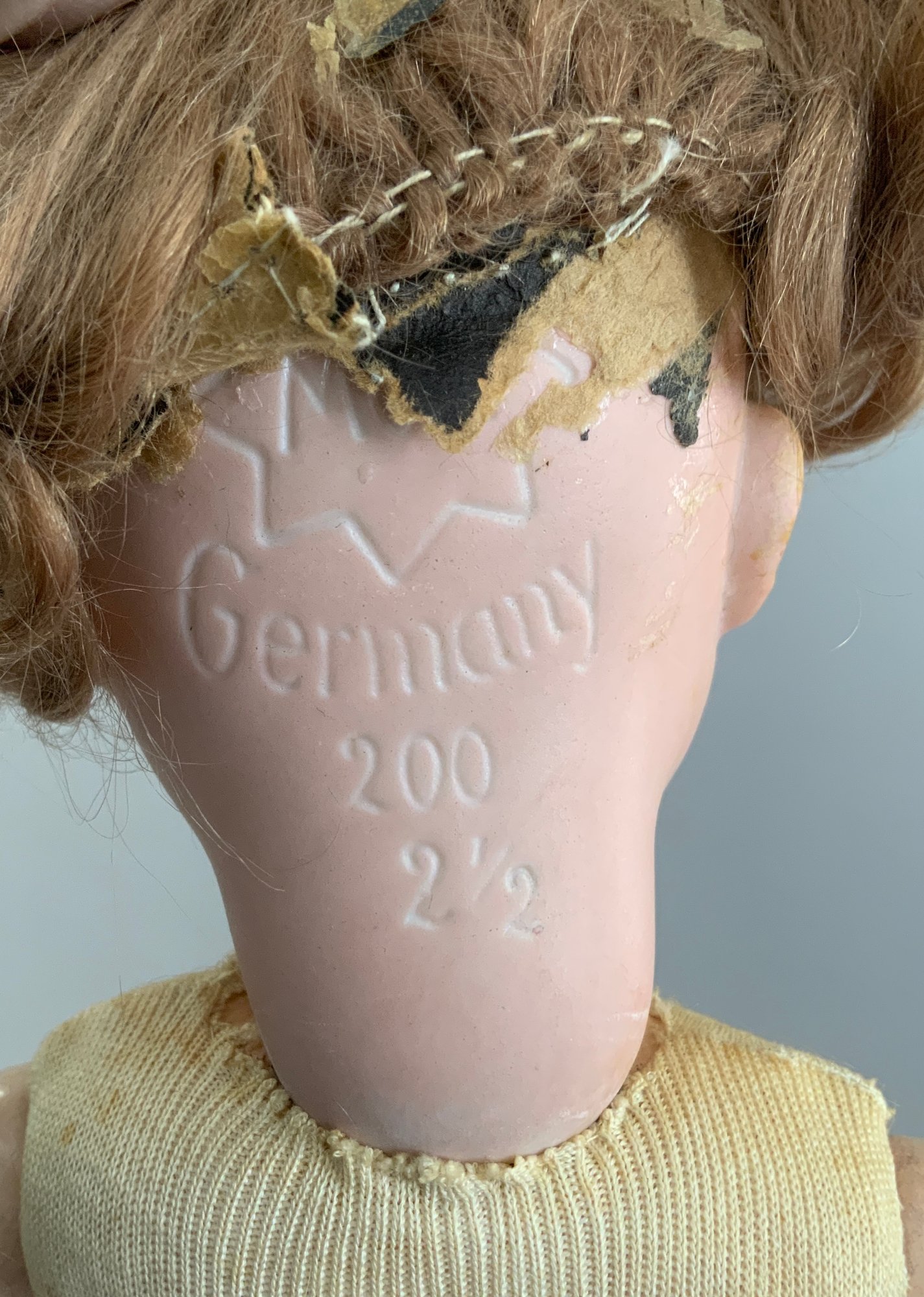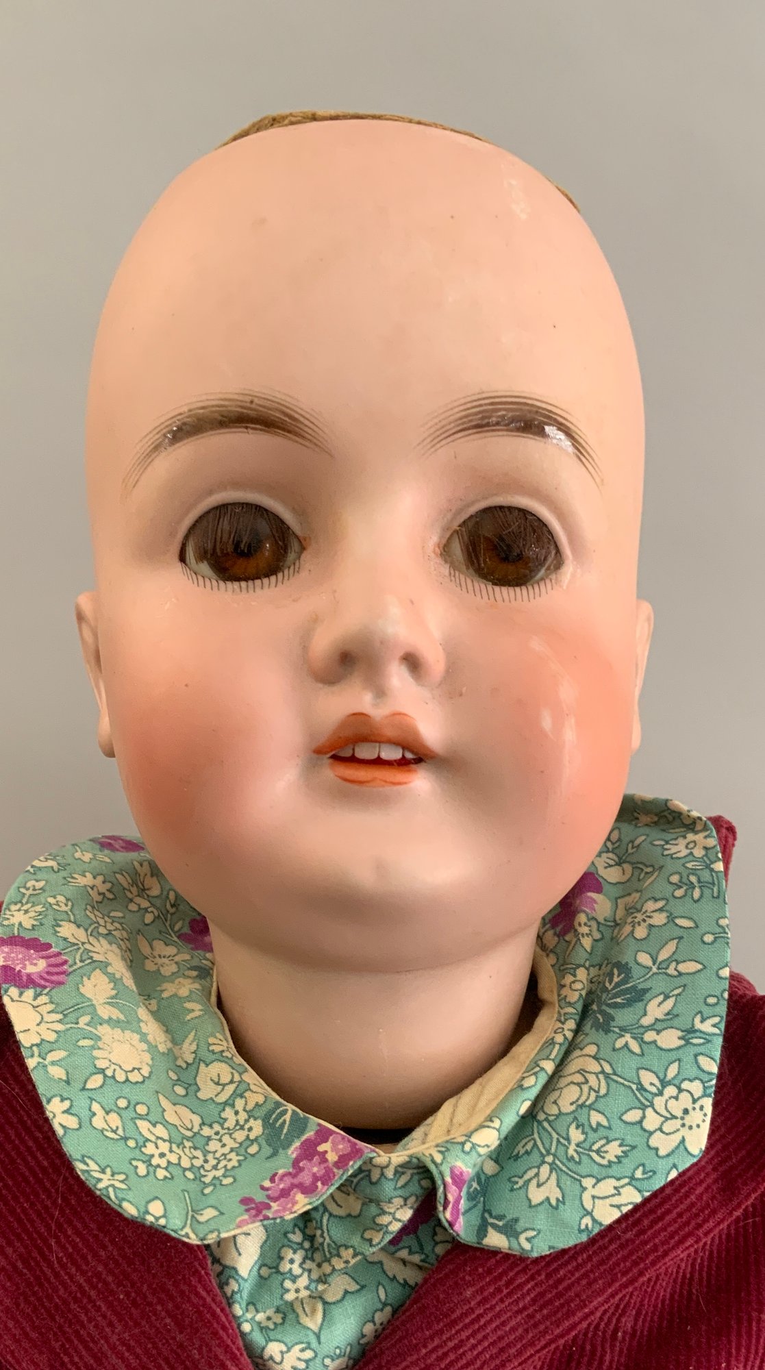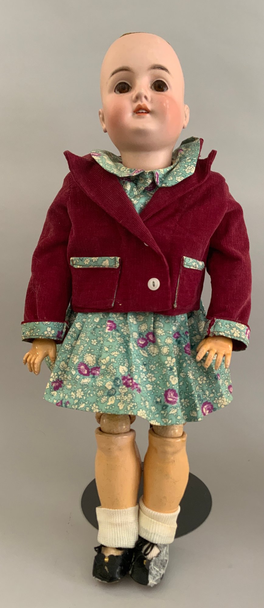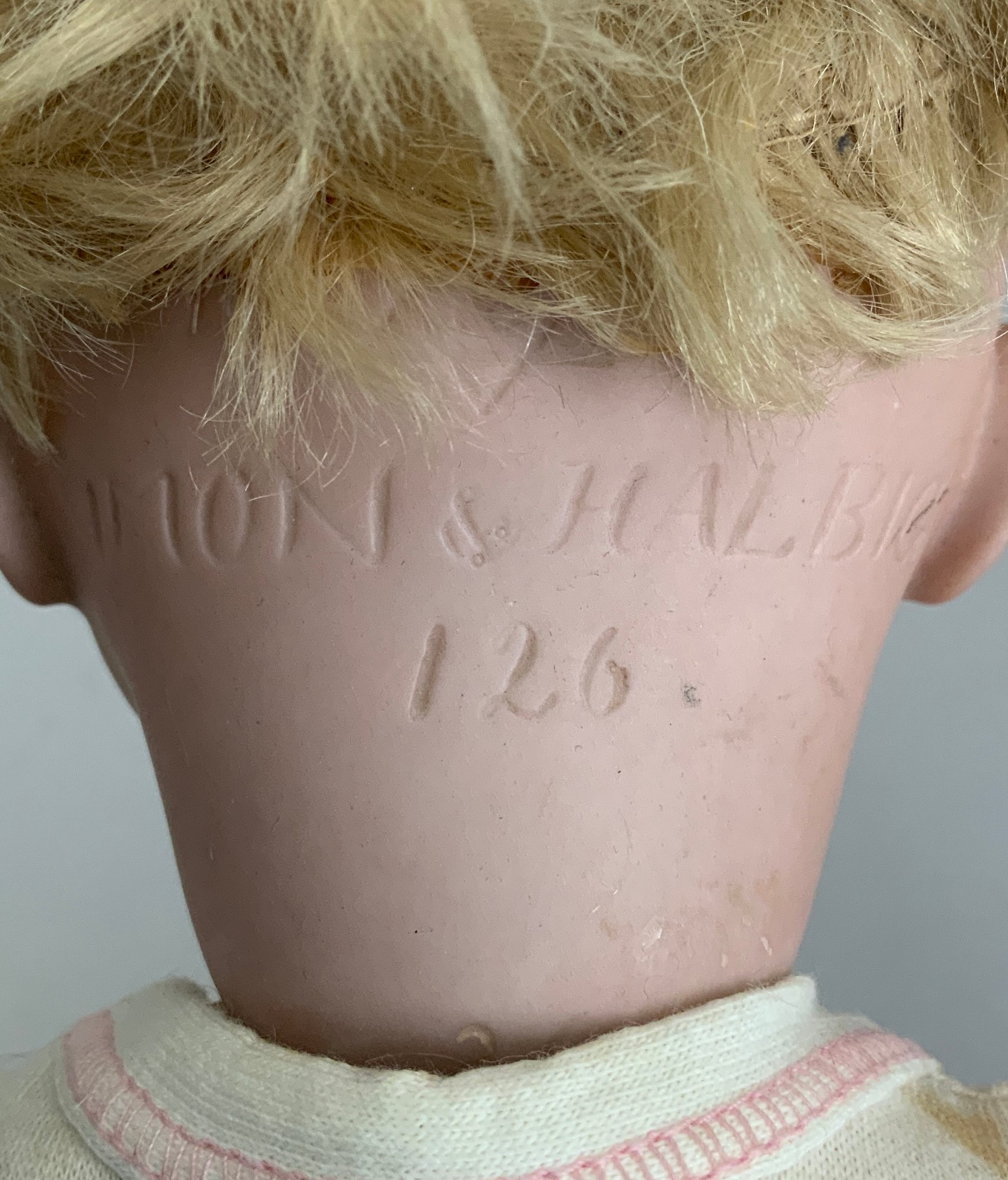 Lot of 3 – German bisque head dolls, 1 – 25” KH (Karl Hartmann), brown glass eyes, OM with teeth, no wig, BJCB, blue print dress (face rub, needs restringing), 1 – 19 ½” MOA*200-21/2 (Max Oscar Arnold), blue glass sleep eyes, OM with teeth, brown mohair wig (glued down), BJCB, & 1 – 16” K*R Simon & Halbig 126, blue glass sleep eyes, blonde mohair wig (glued down) OM with teeth & wobble tongue, 5 pc compo baby body as is, stained white outfit