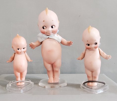 LOT OF 3 GERMAN BISQUE KEWPIE DOLLS - 4 1/2" - 7", JOINTED AT ARMS, SMALLEST DOLL HAS A CHIP TO HIS RIGHT THUMB & A REPAIR AT HIS RIGHT SHOULDER SOCKET