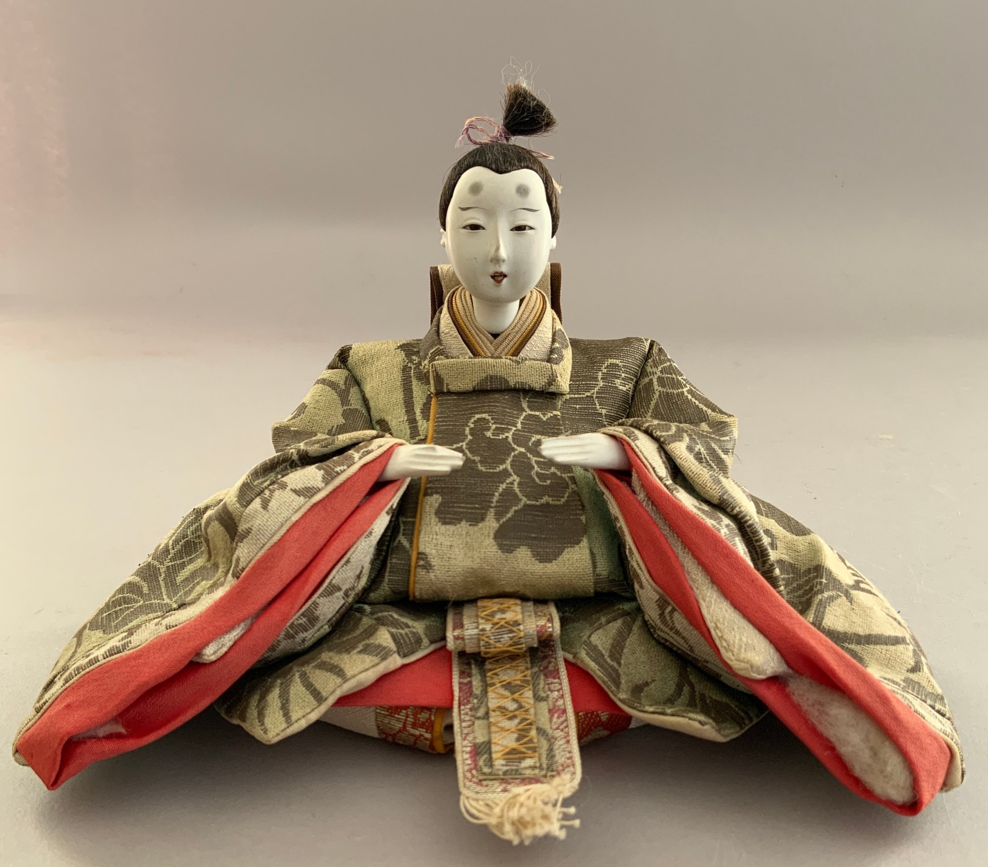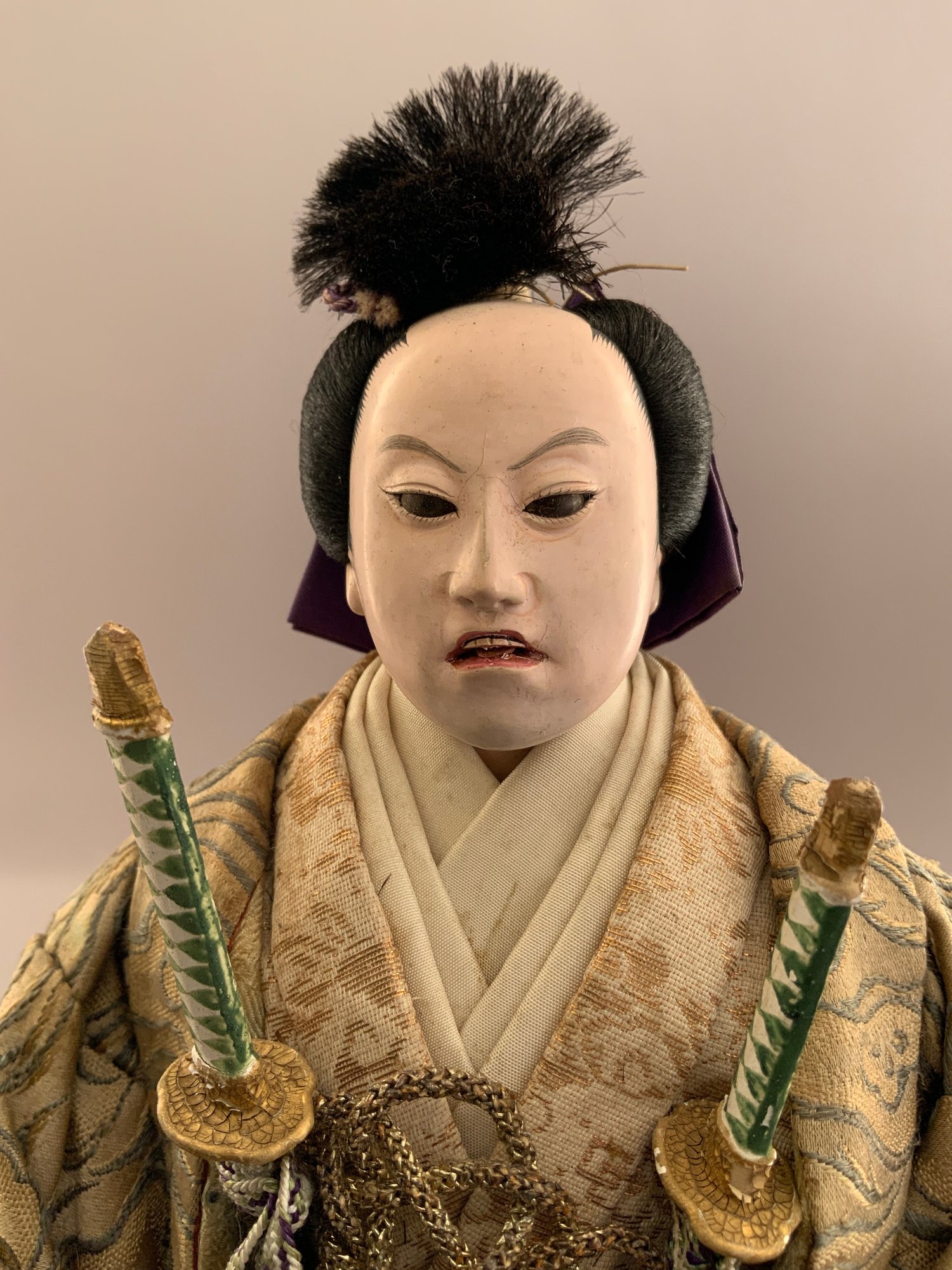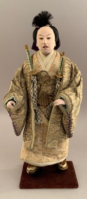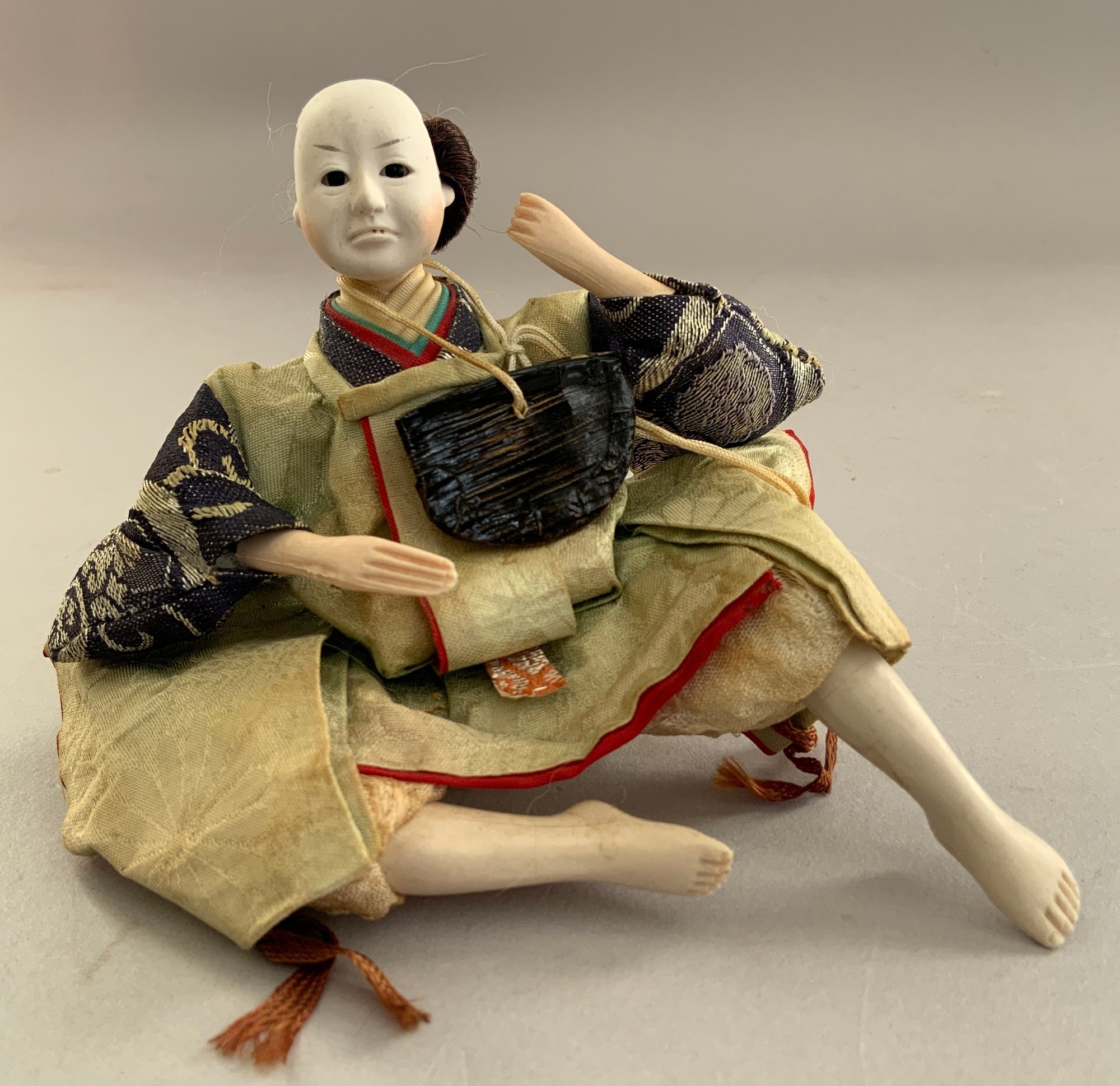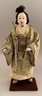 Lot of 3 – Japanese gofun dolls, 1- 13 ½” Samurai with 2 swords, standing on base, 1 – 6” seated lady, 1 – 5” seated man, all in regional costumes