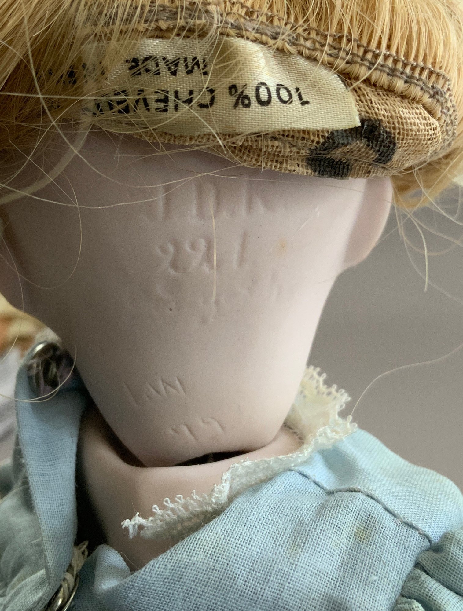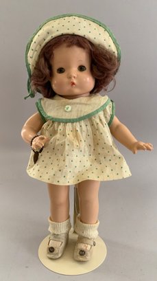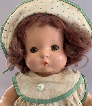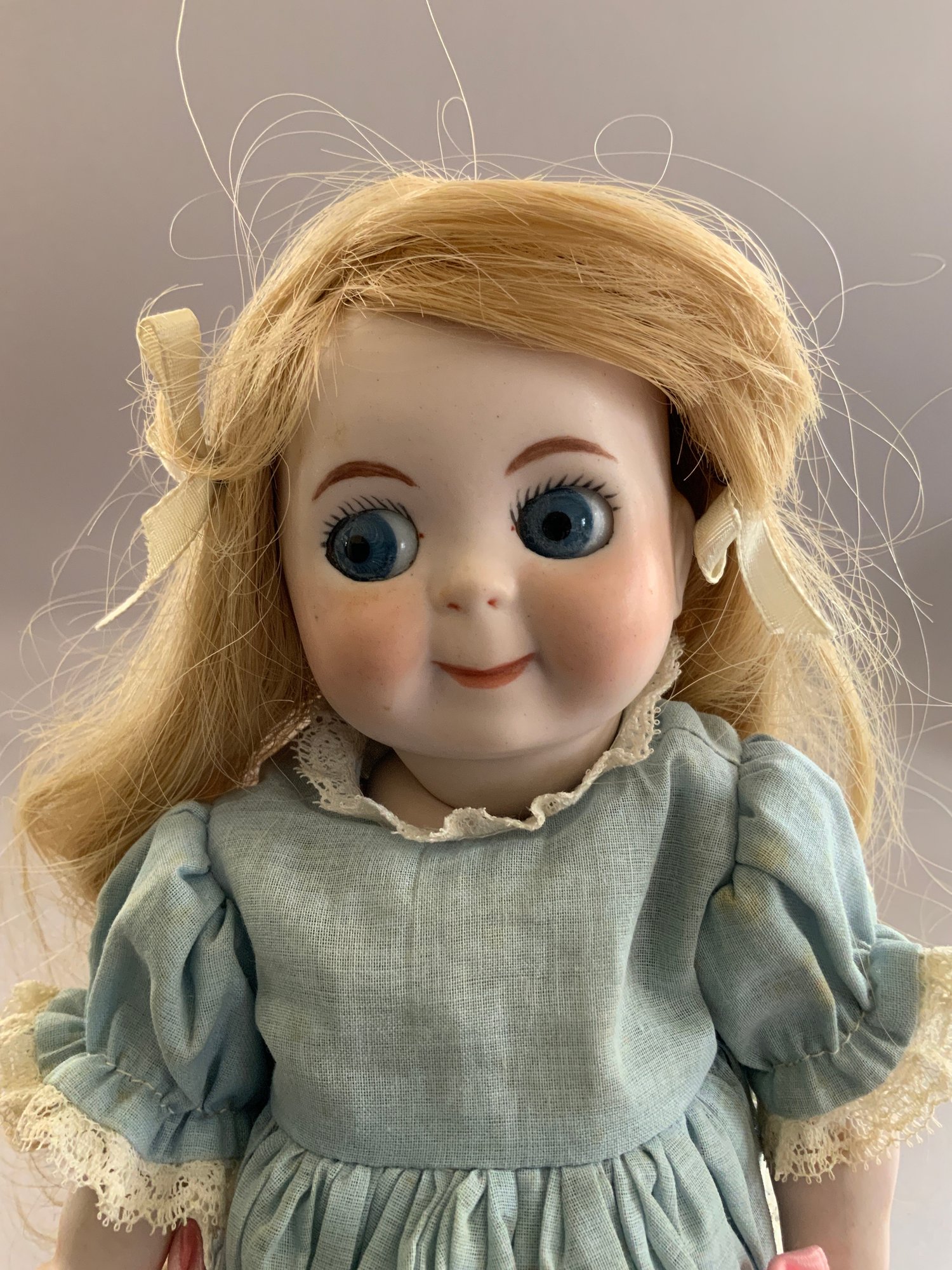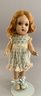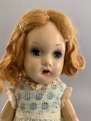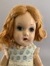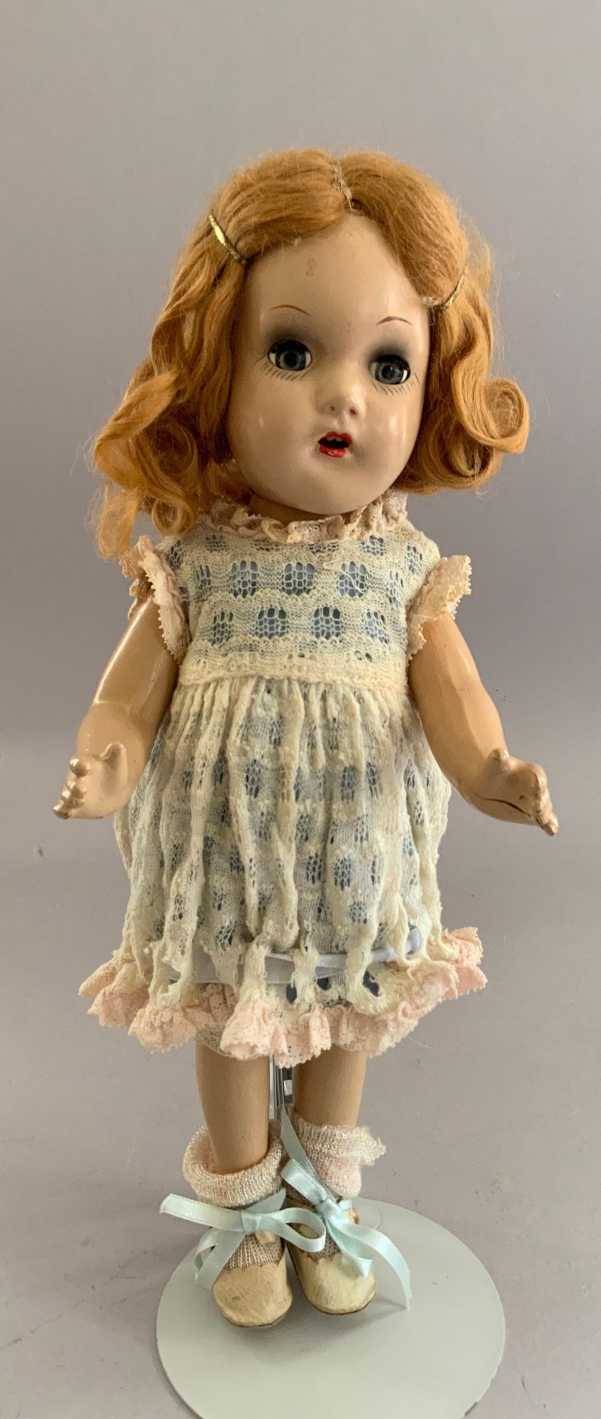 Lot of 3 playmates: 13”Hard plastic girl (left hand surface crack, curly, golden-blonde hair, Lace dress w/ blue slip, O/M 2 teeth, sleep grey eyes, (no mark); 14” Compo child, marked Effanbee Patsy Doll, w/ heart bracelet, Patsy doll, brown sleep eyes, pouty mouth, Lt. brown curly hair, 5-pc compo body, wearing Pin-dot Romper dress & hat; and a 9 ½” all bisque Kestner 221 repro Googly, blue eyes, HH wig, (artist signed IAN-79)