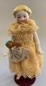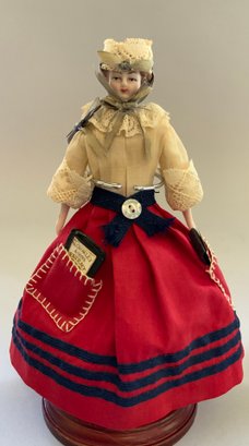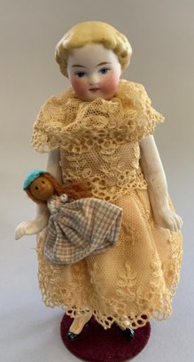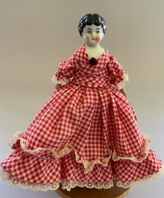 Lot of 3 small dolls, 7” bisque head sewing doll, 6” Black hair china in red check dress, & 5” Parian blonde hair, painted features