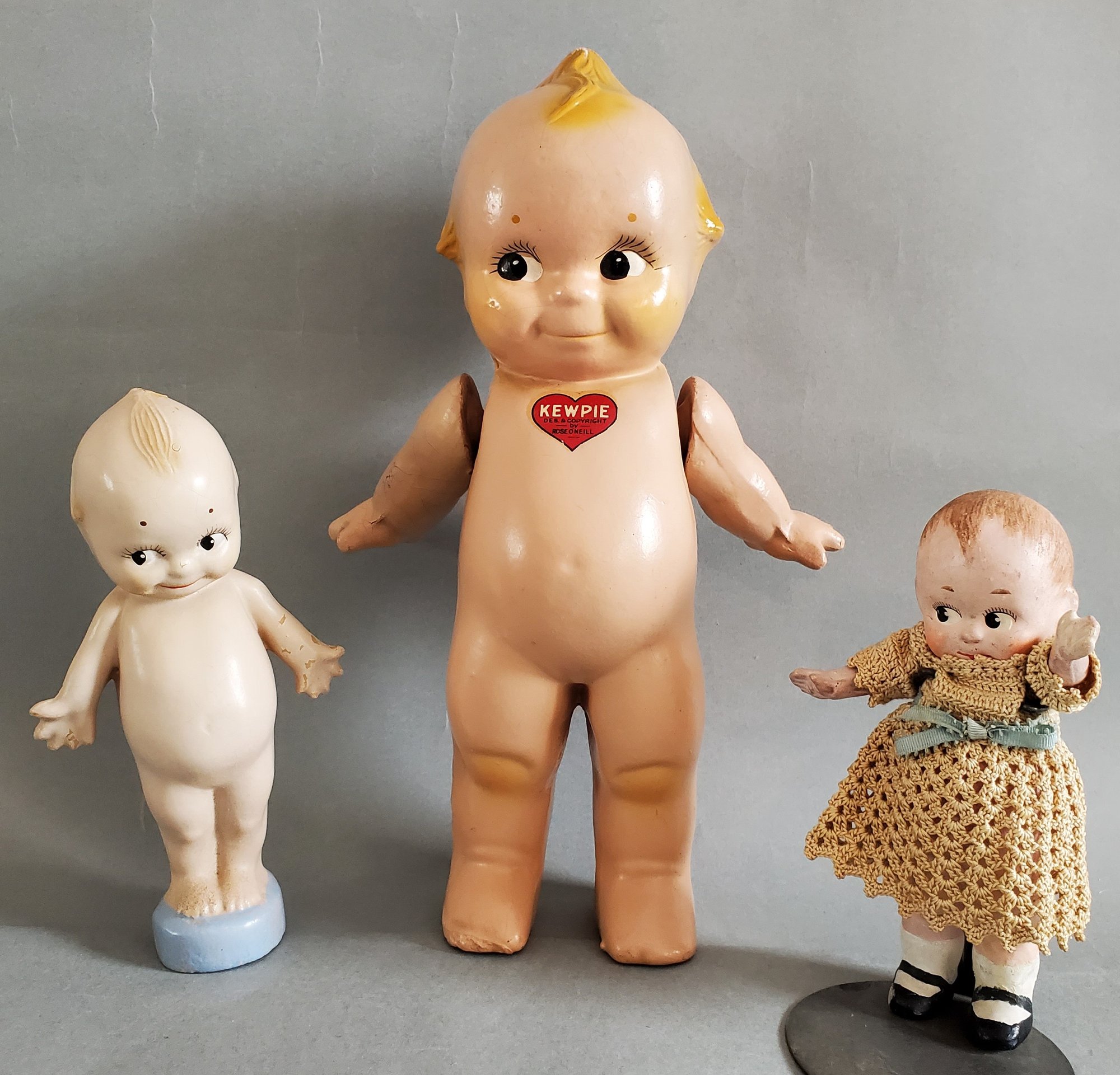 LOT OF 3 VINTAGE COMPOSITION KEWPIE DOLLS - 6" - 11 1/2", PAINT CRACKS & CHIPPING NOTED