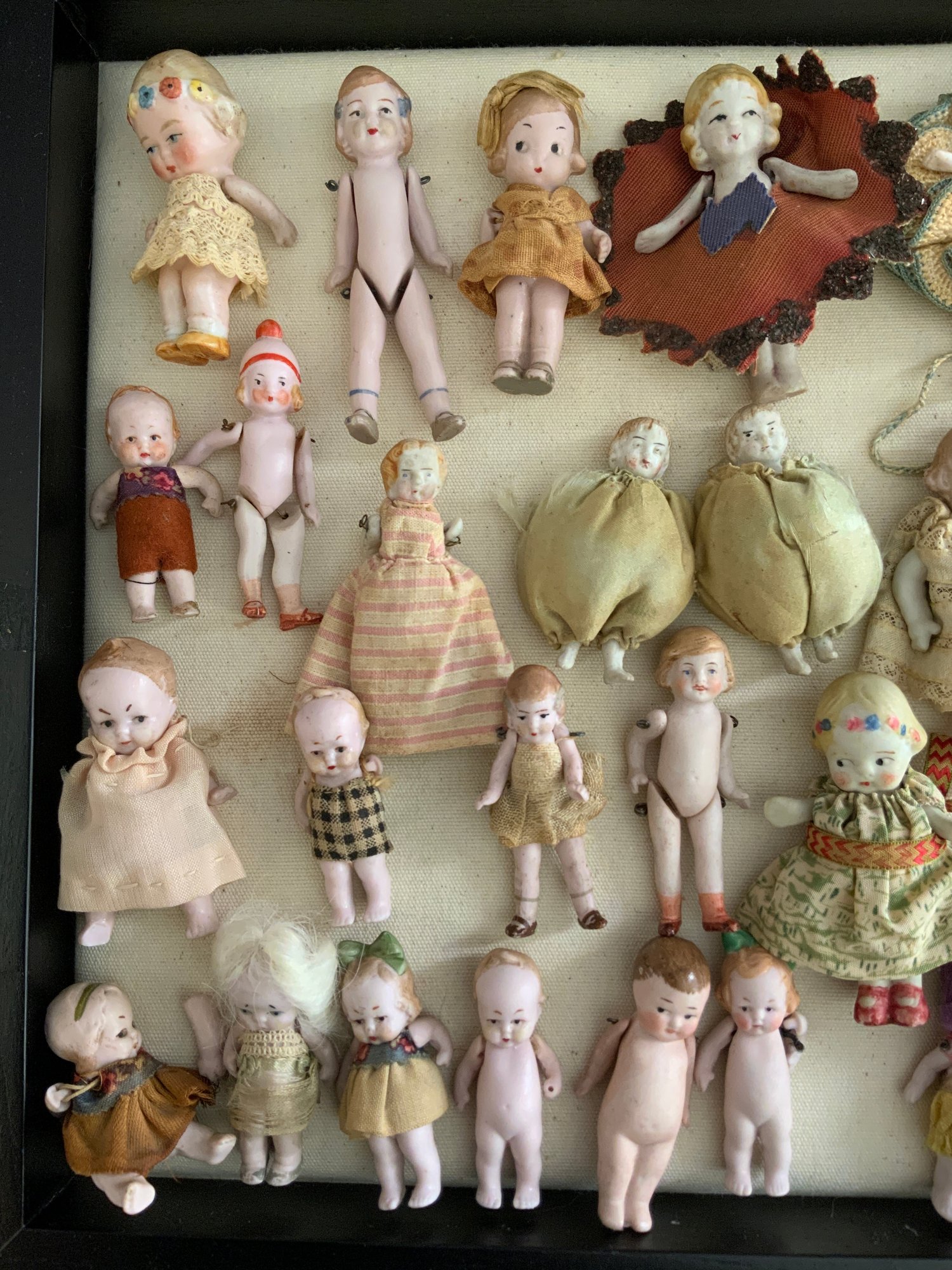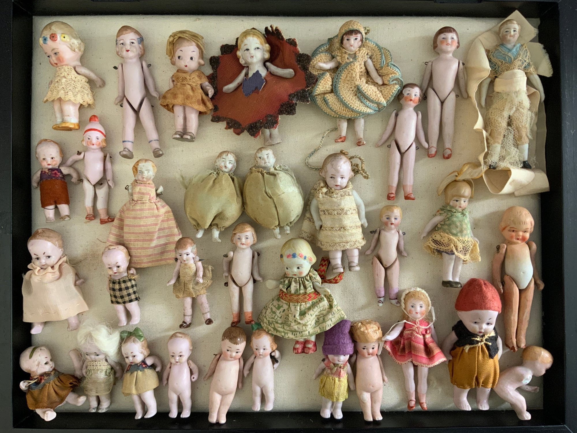 Lot of 30+ small all bisque dolls 2” – 3 ½” long, dressed & undressed