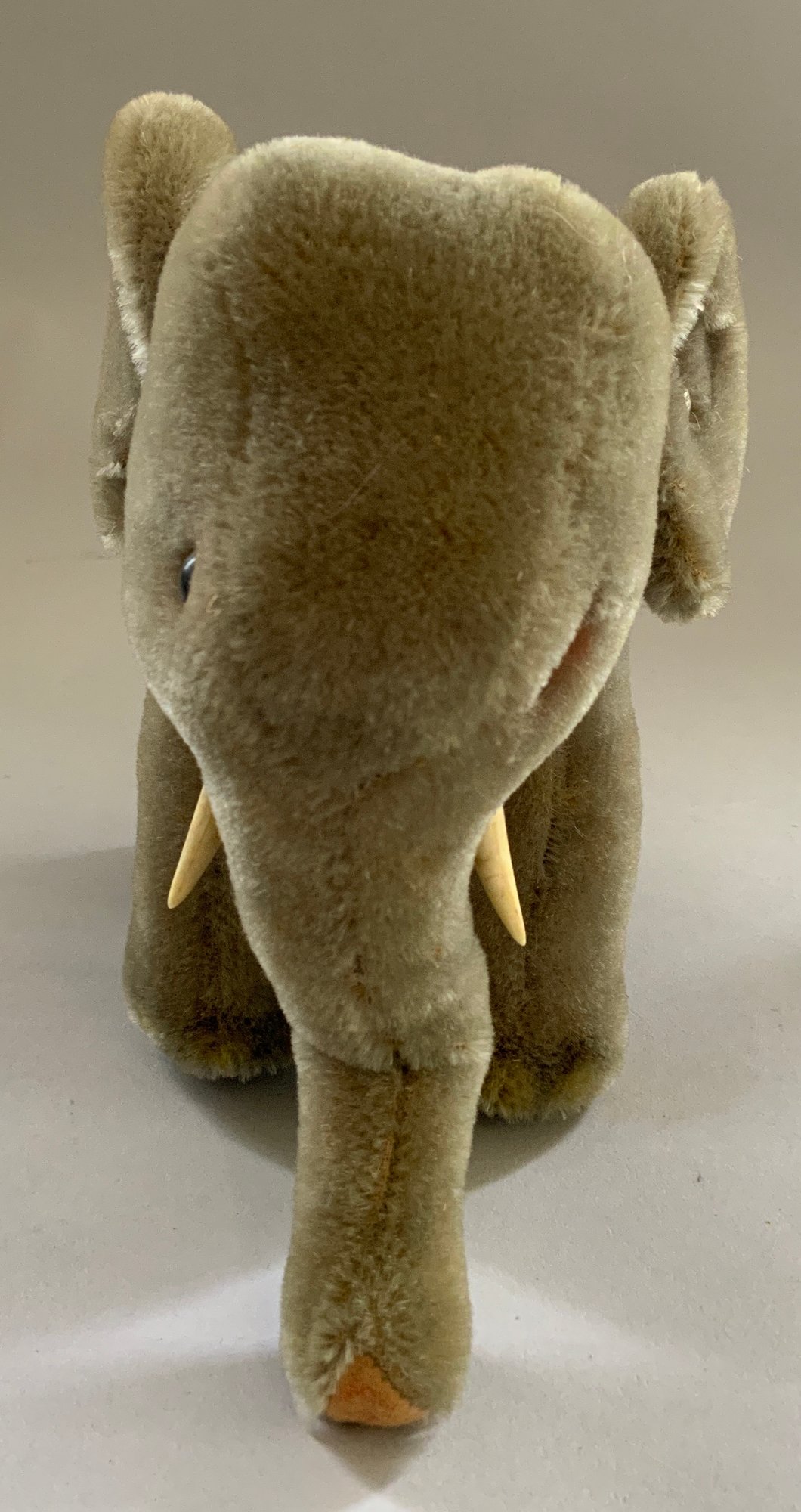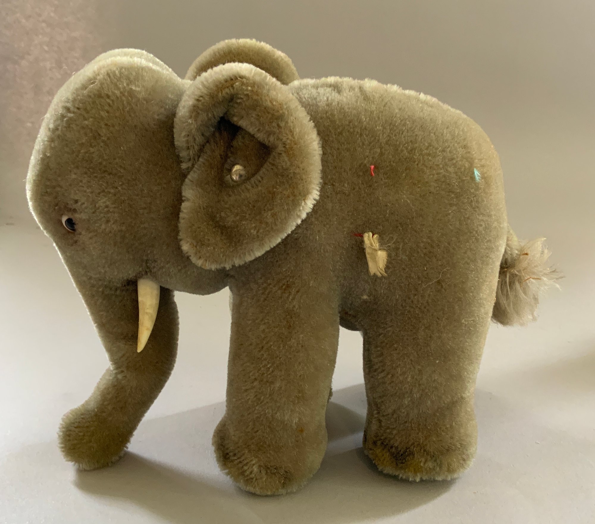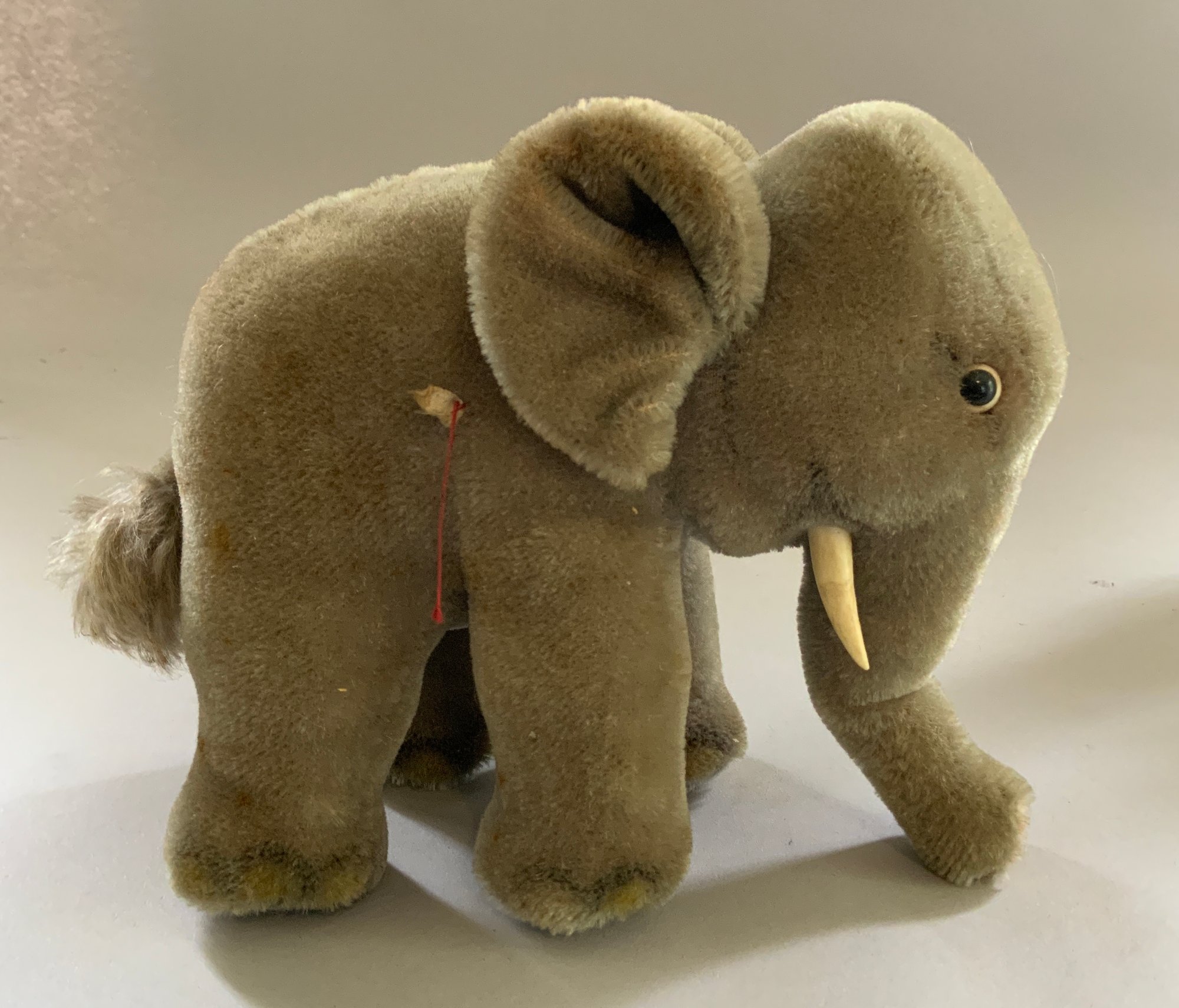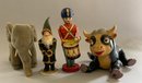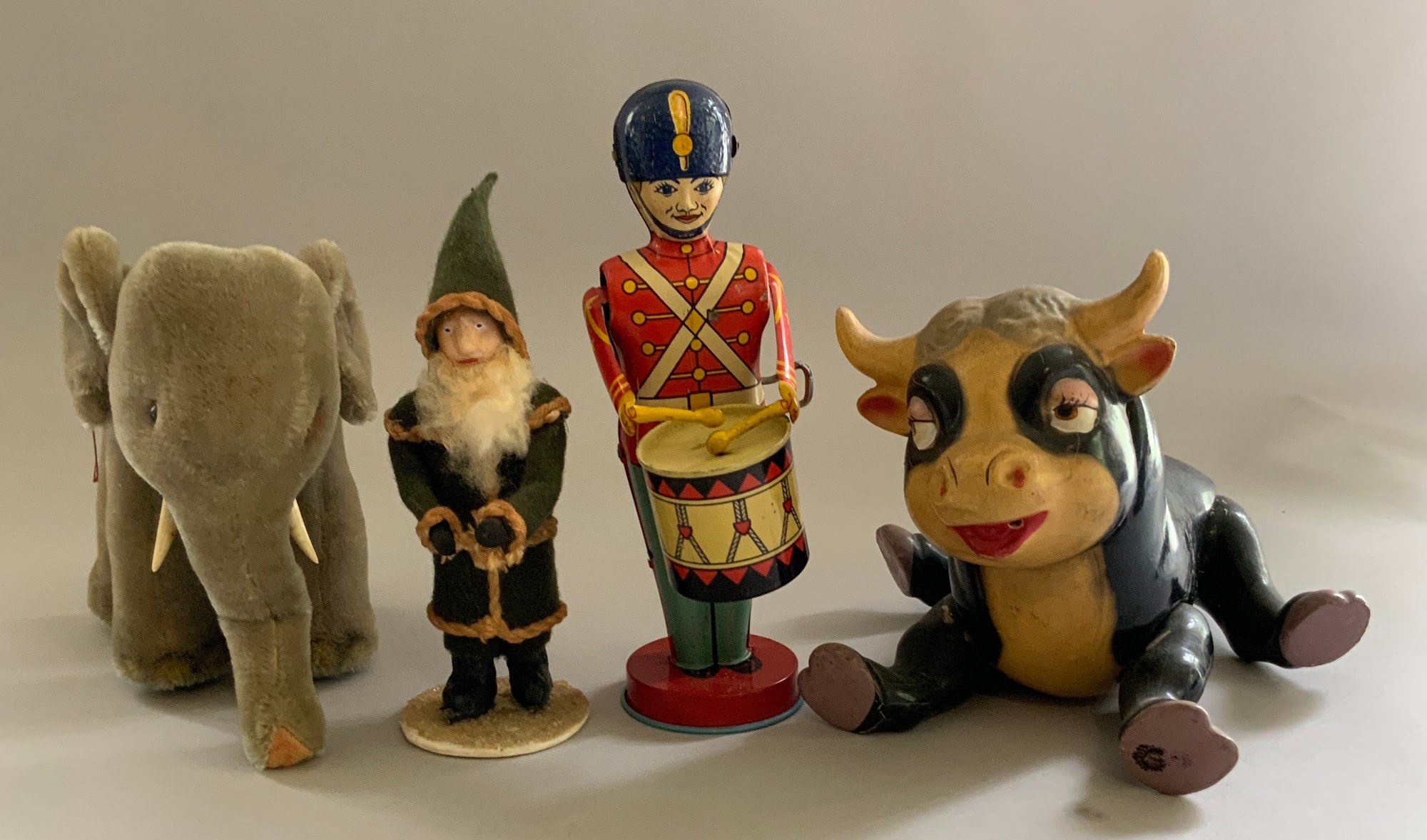 Lot of 4 – 9 ½” long Knickerbocker Disney Ferdinand the Bull,(rubs & crazing), 8” long Steiff Elephant (staining), J Chein & Co drummer boy wind up 8 ½” tall works, & 6 ½” tall green Santa