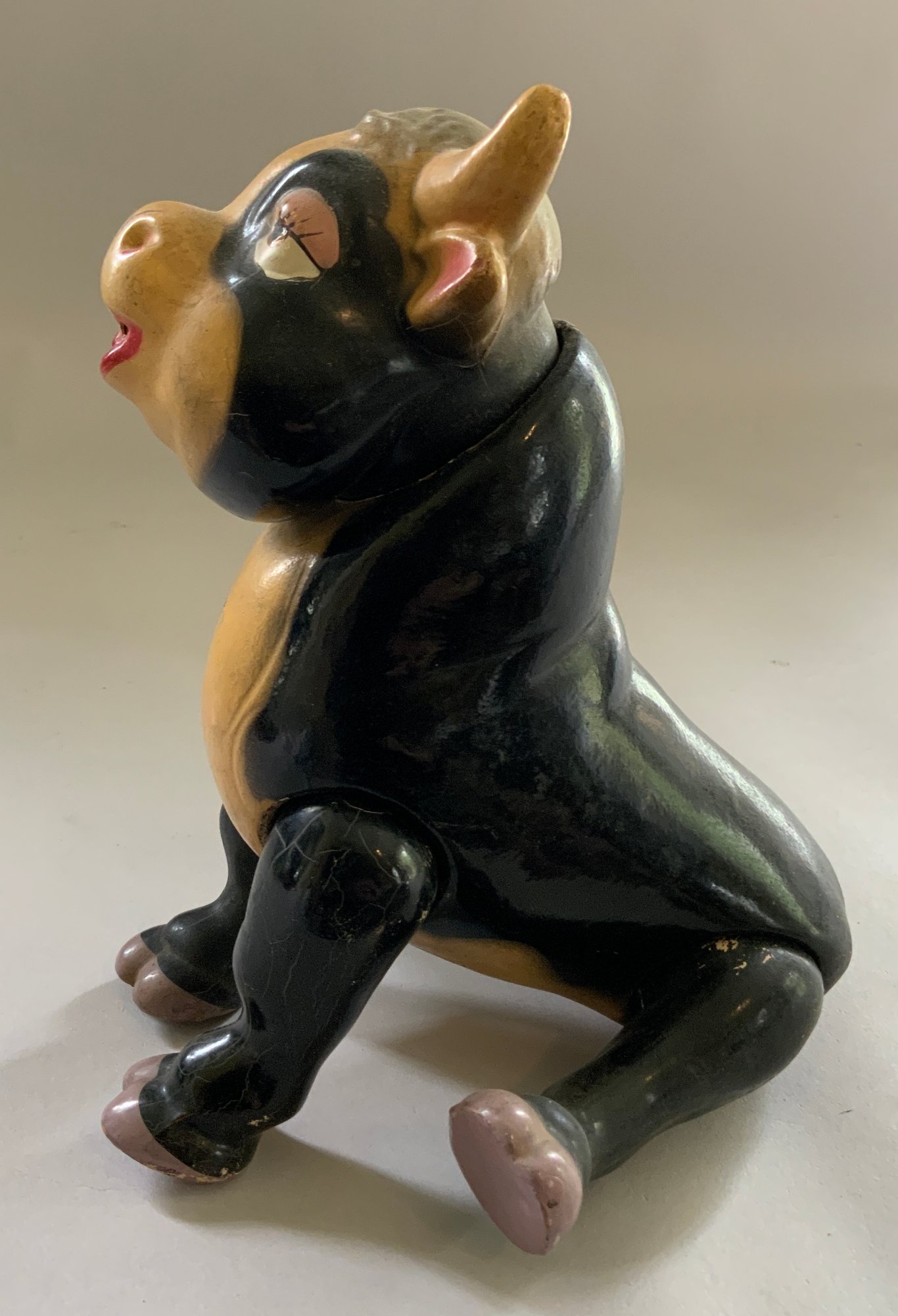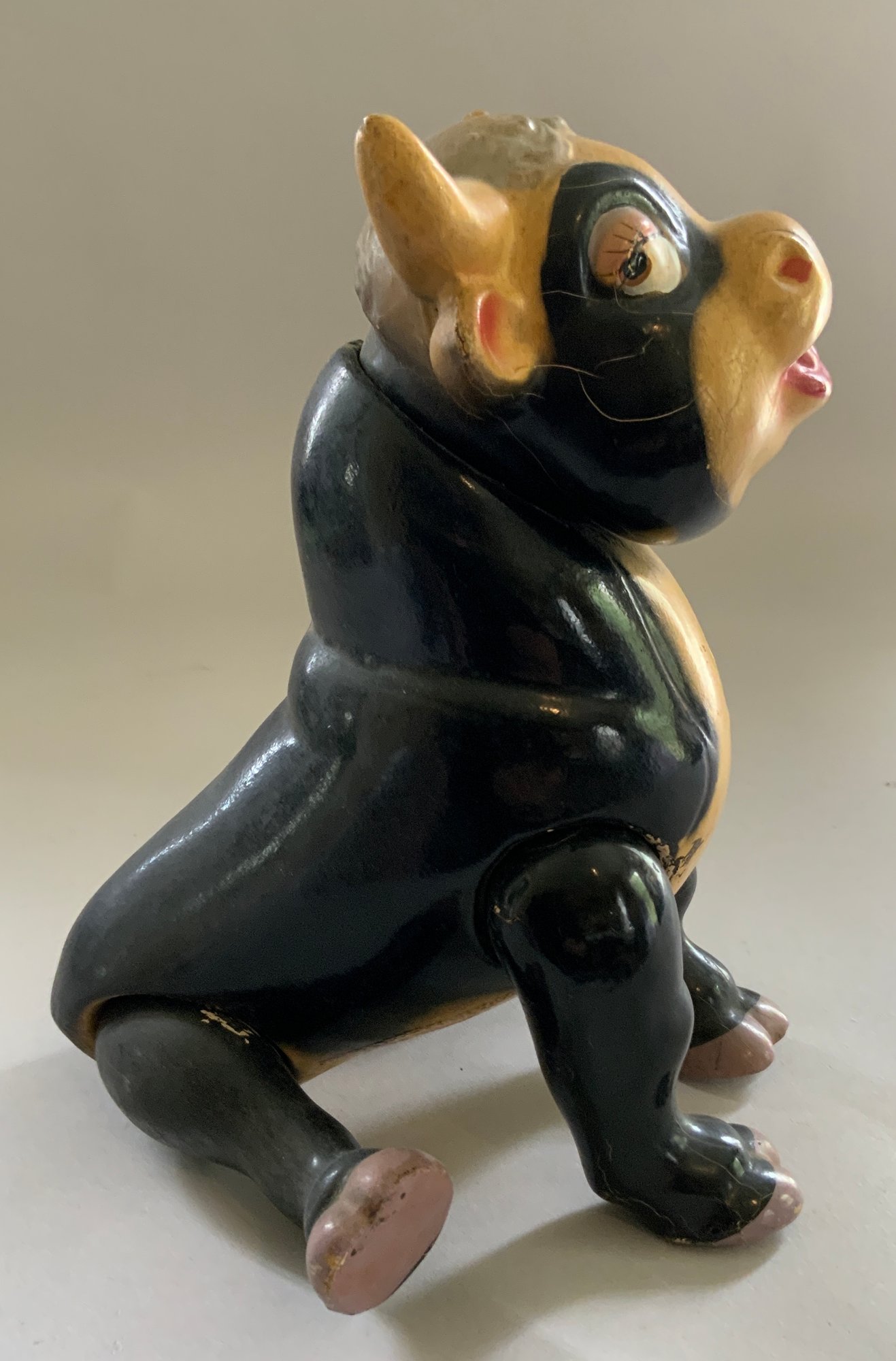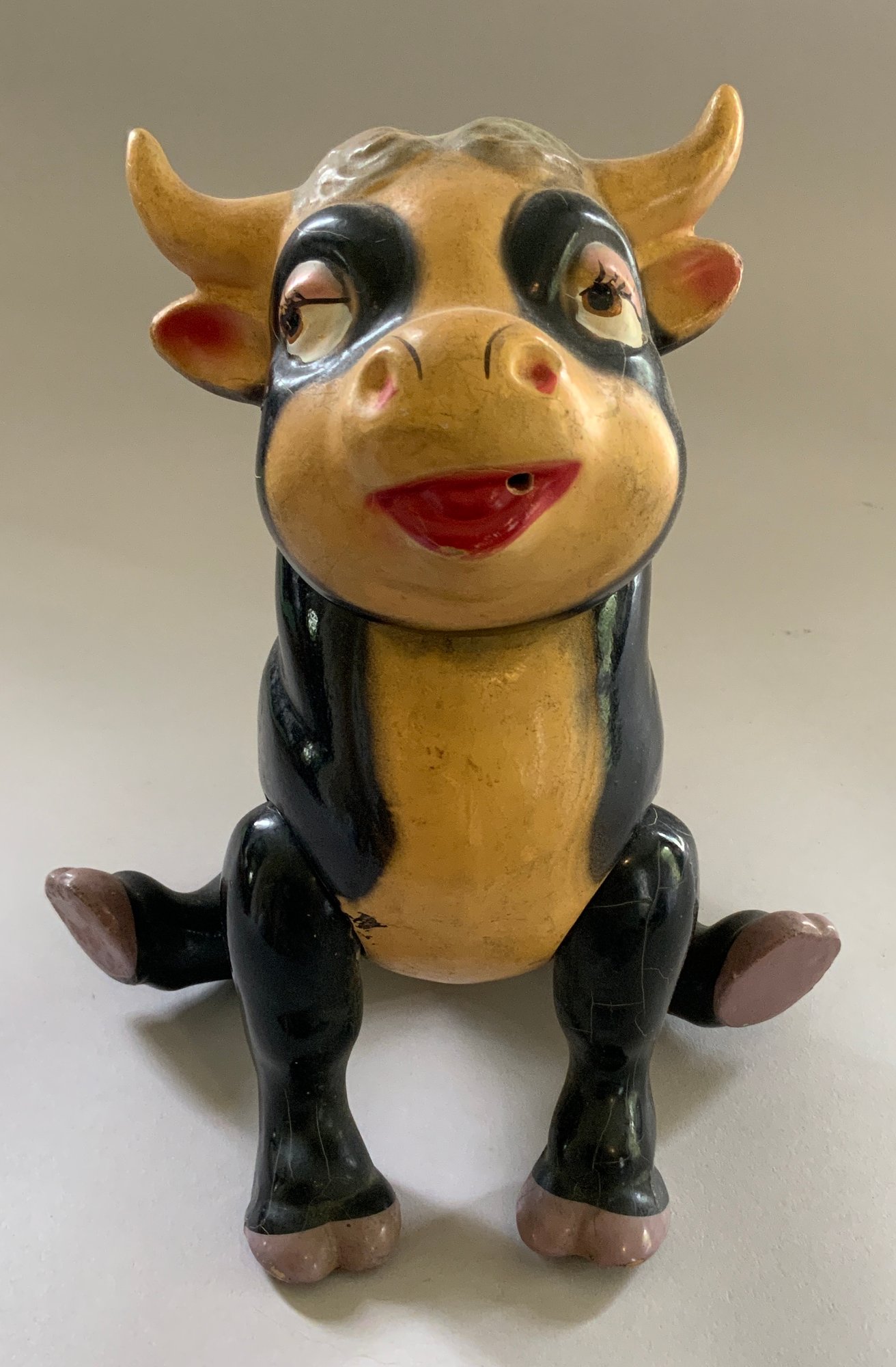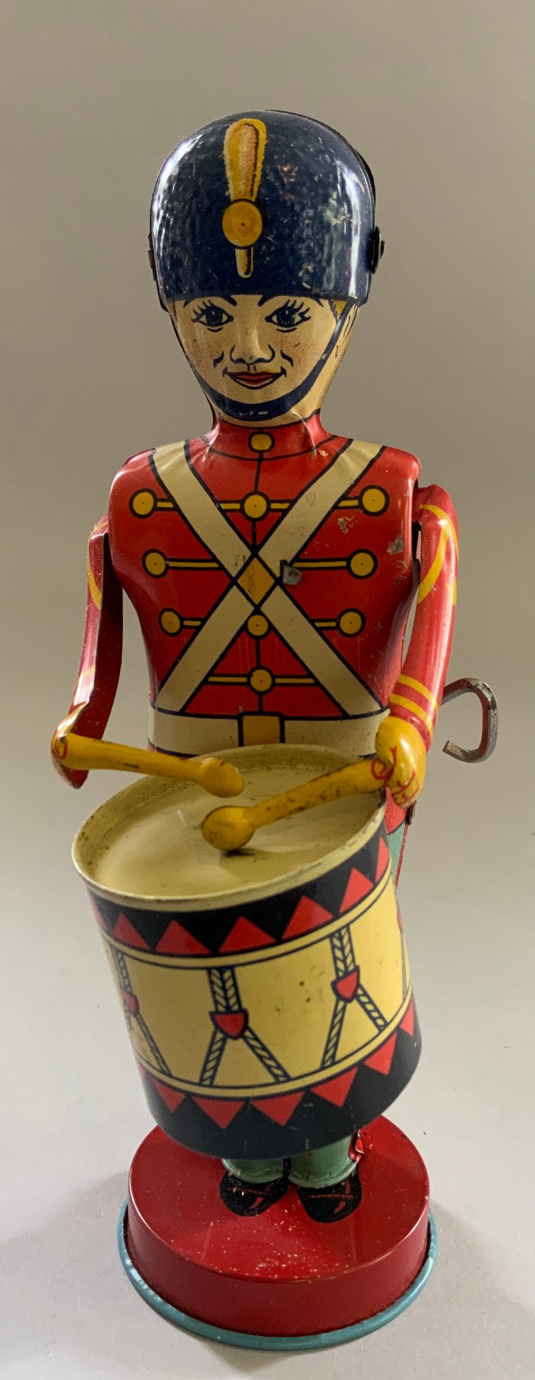 Lot of 4 – 9 ½” long Knickerbocker Disney Ferdinand the Bull,(rubs & crazing), 8” long Steiff Elephant (staining), J Chein & Co drummer boy wind up 8 ½” tall works, & 6 ½” tall green Santa