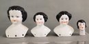LOT OF 4 BLACK HAIR CHINA DOLL HEADS - 2 1/4" - 4 1/2", 1 HAS BROWN EYES, 3 HAVE BLUE EYES, CHIP NOTED TO LEFT SHOULDER PLATE ON HEAD W/ BROWN EYES, SCUFFING NOTED TO HAIR