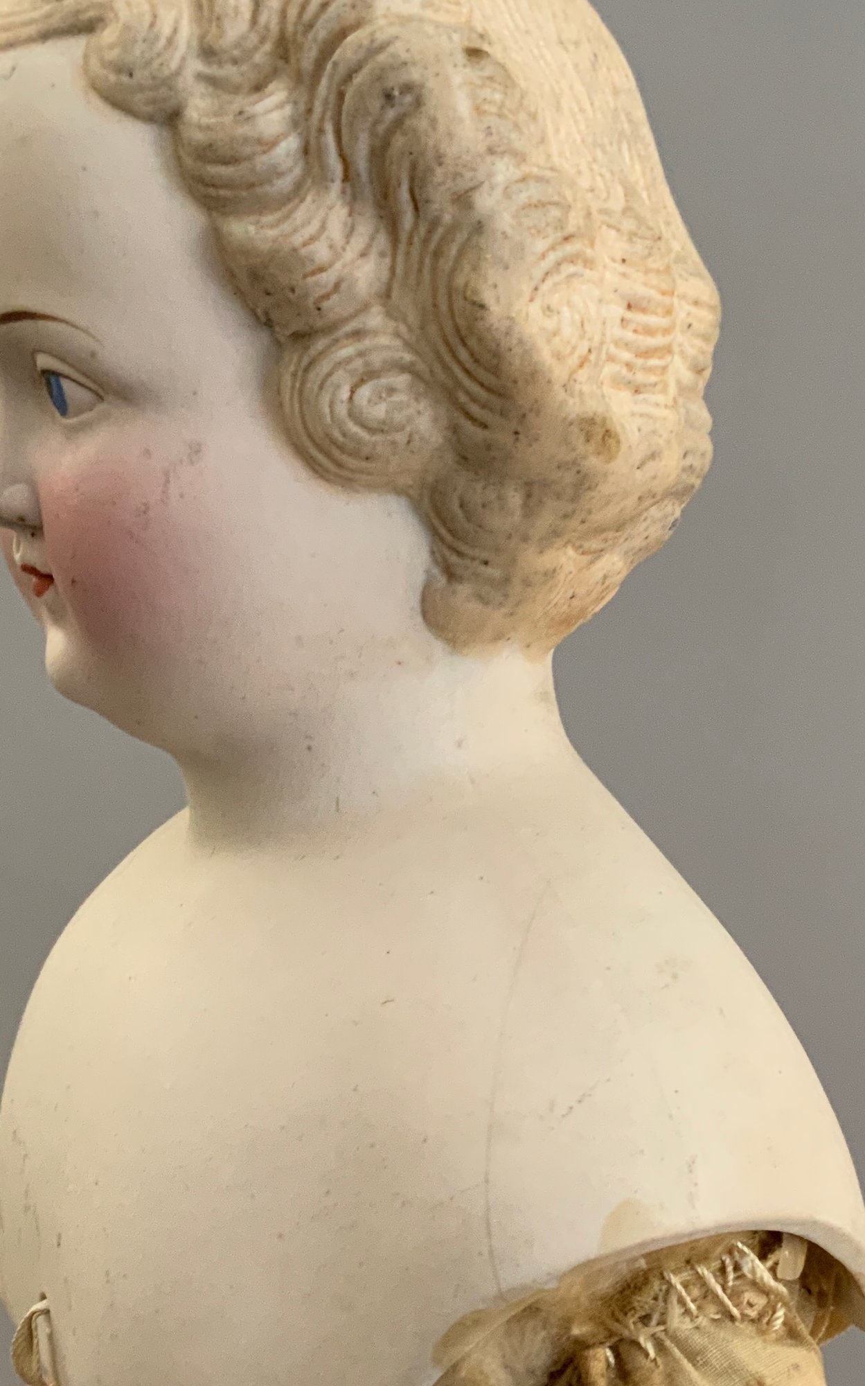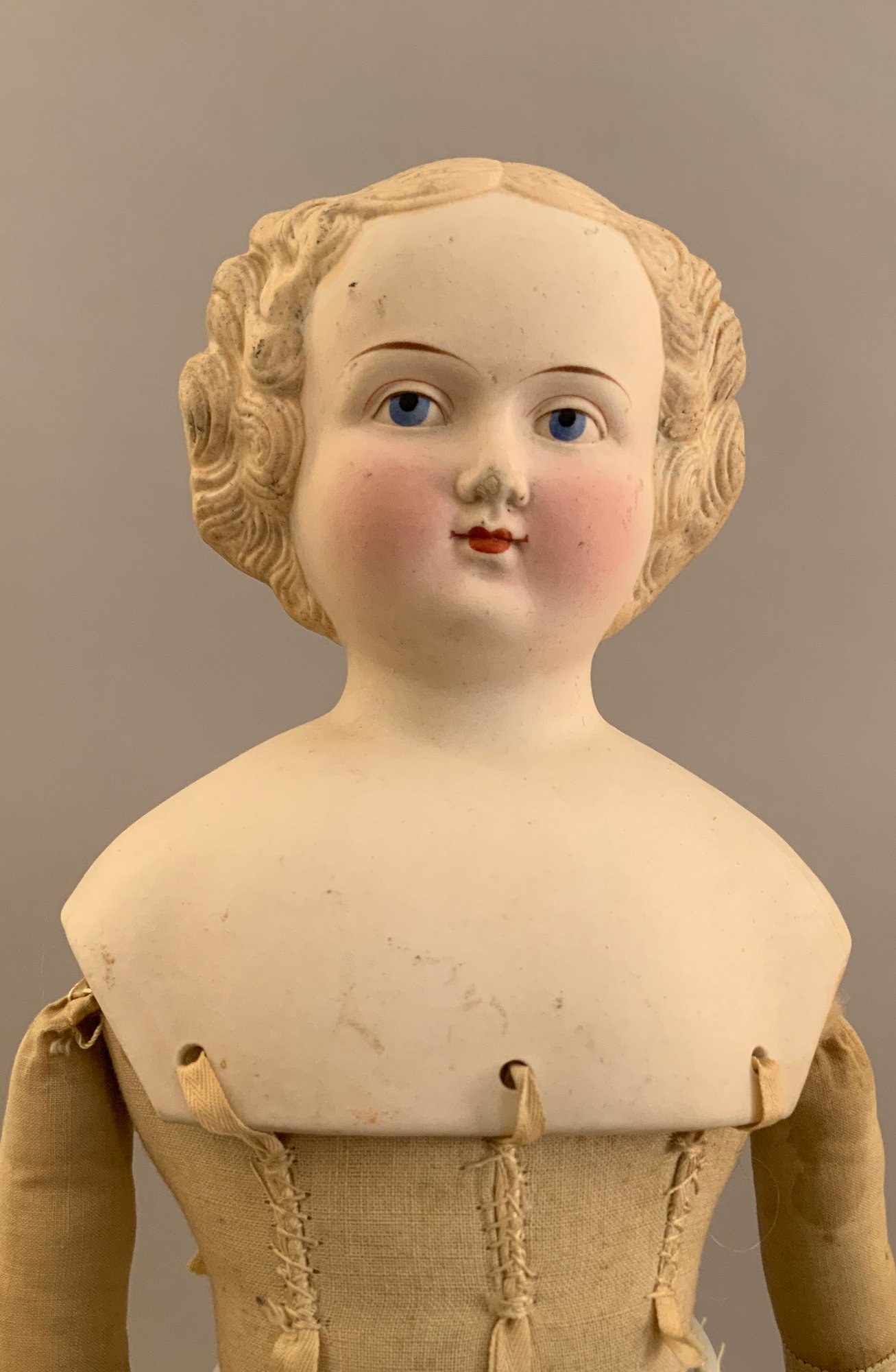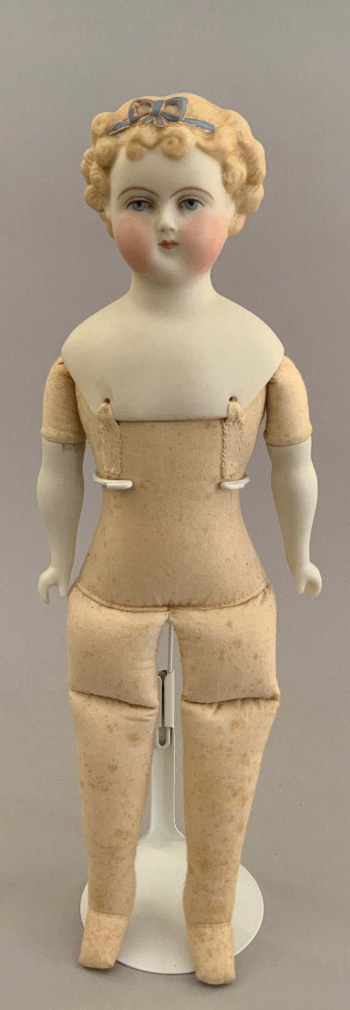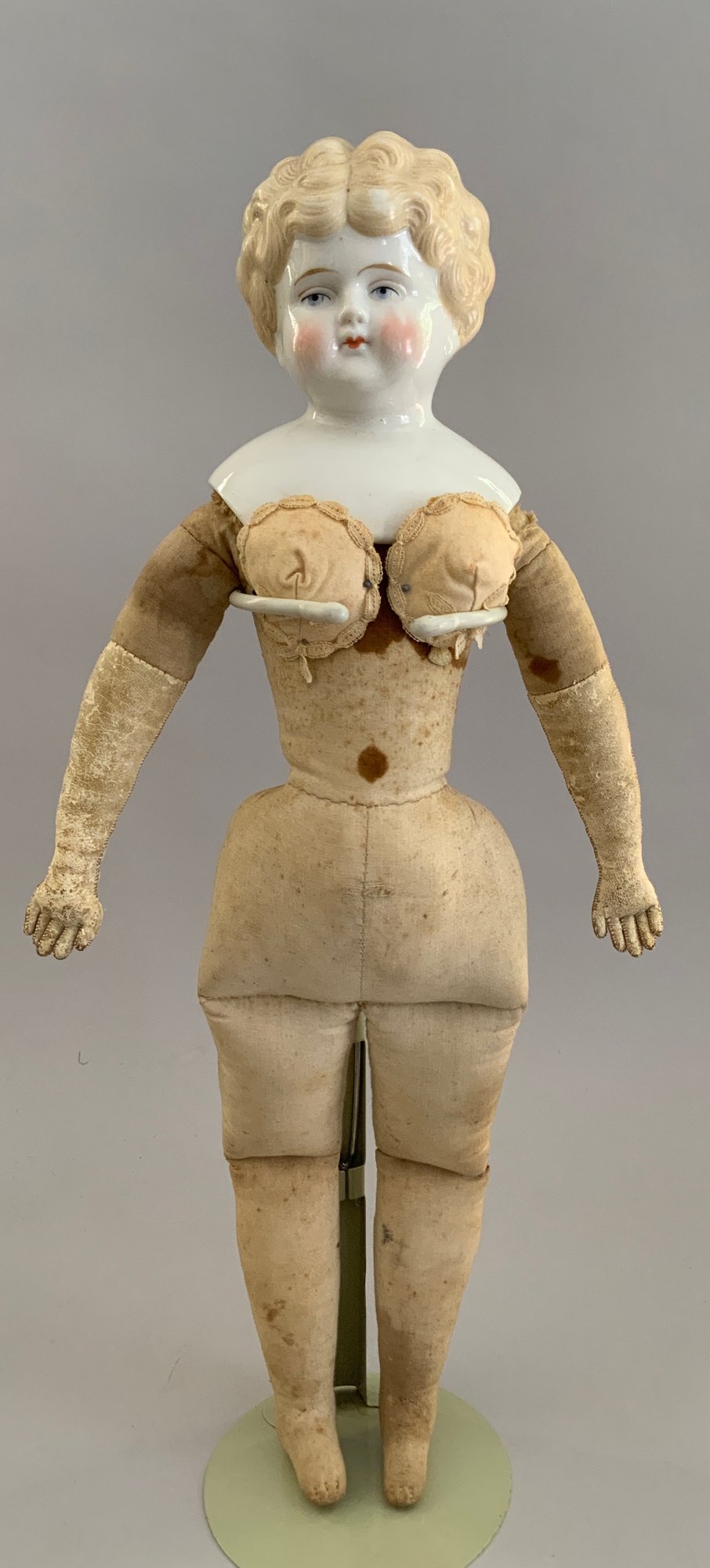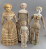 Lot of 4 blonde hair dolls, 1 – 19 ½” Greiner type, painted features, cloth body, white dress (stains), (head rubs & cracks, 1 – 20” Parian, painted features, cloth body (missing right leather arm), 1 – 18” blonde hair china, painted features, cloth body (stains), 1 – 11 ½” artist doll, cloth body