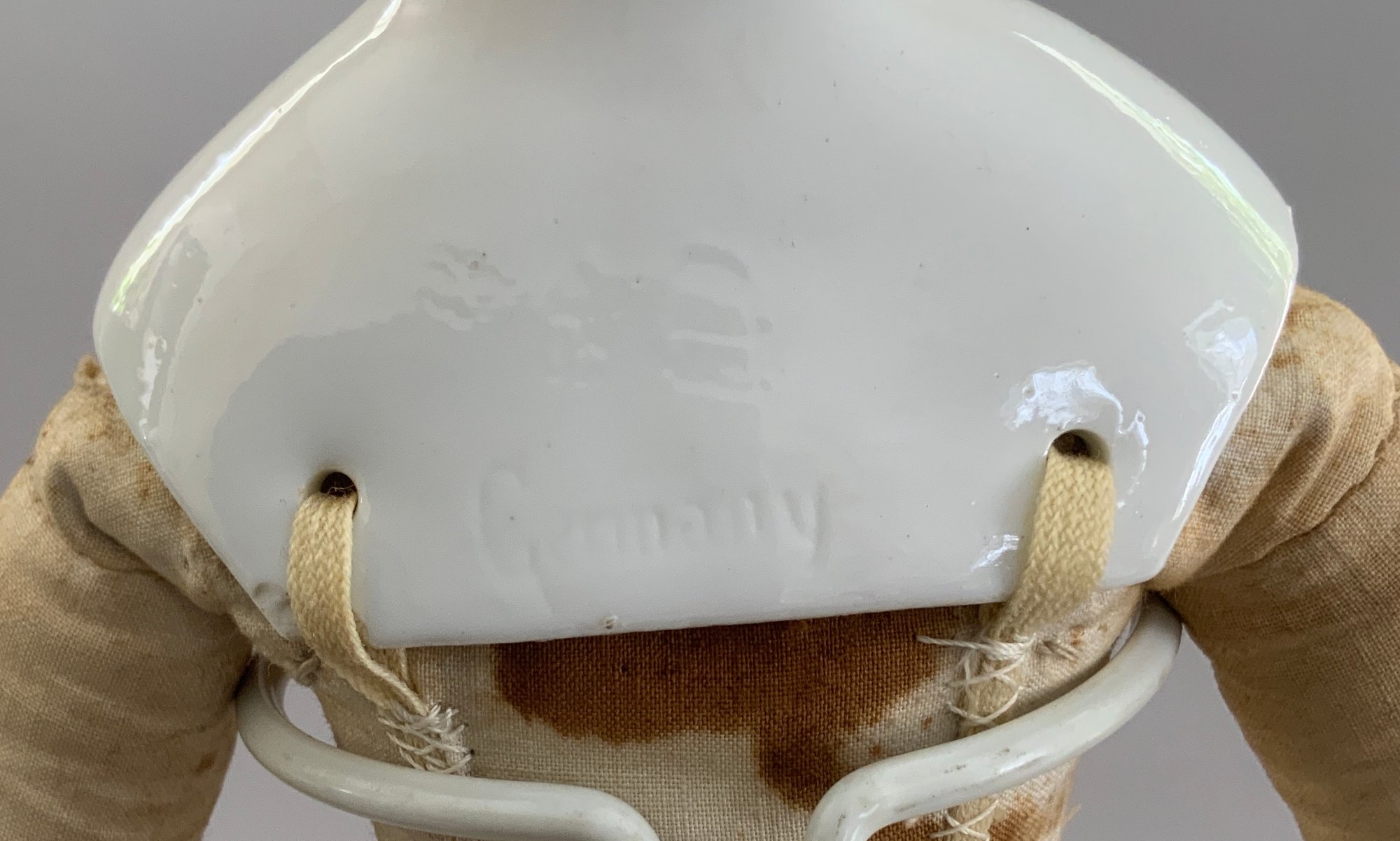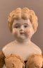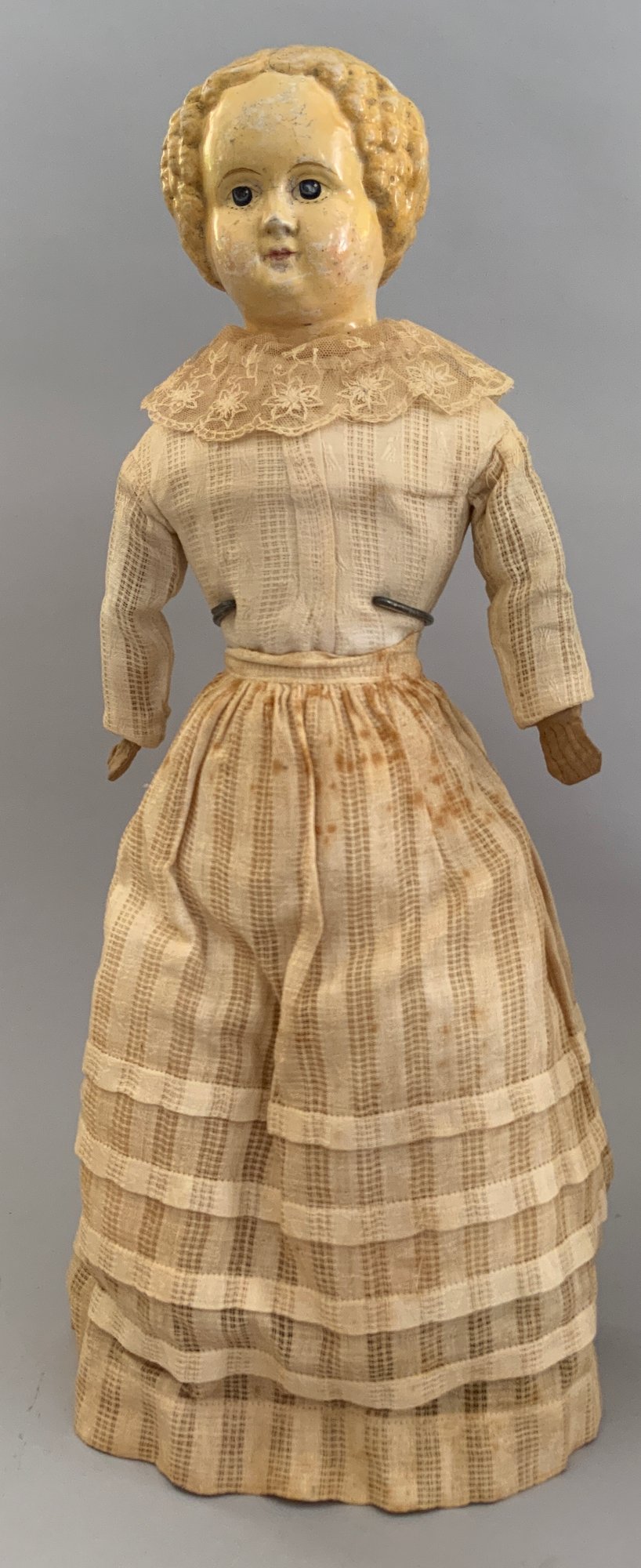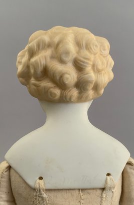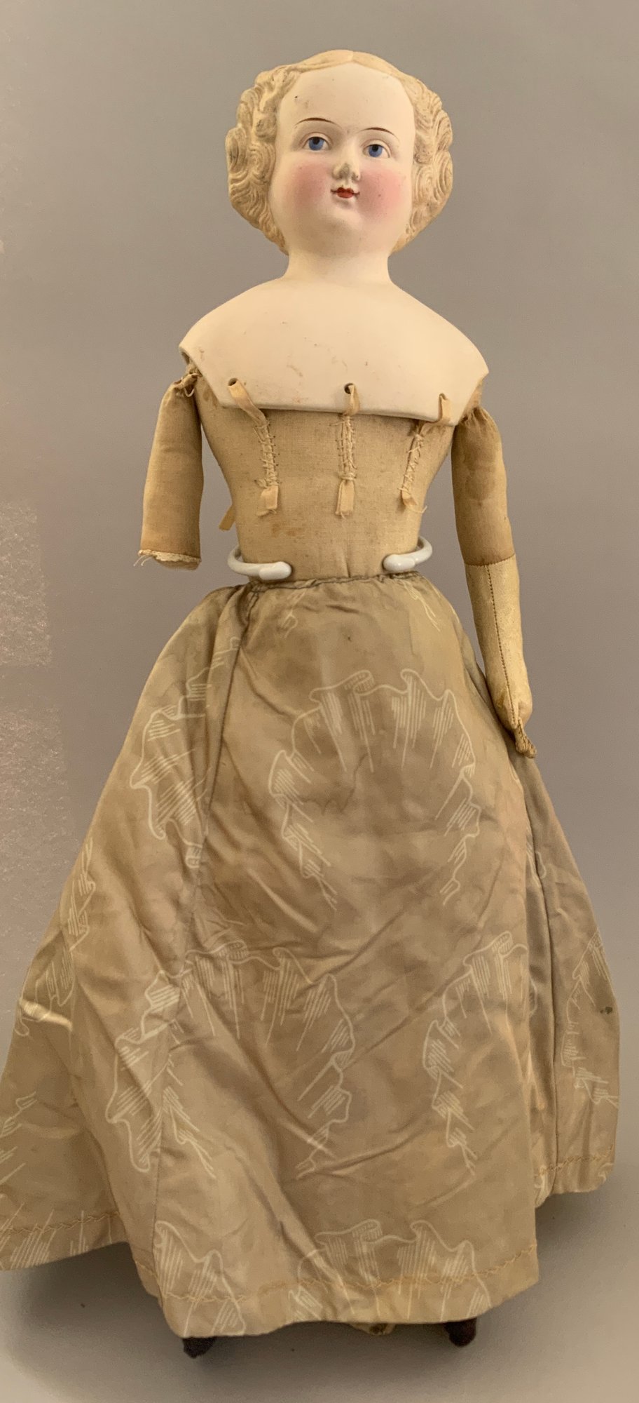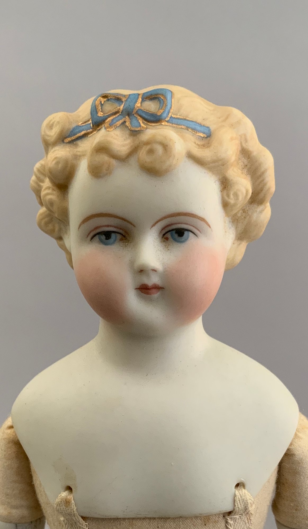 Lot of 4 blonde hair dolls, 1 – 19 ½” Greiner type, painted features, cloth body, white dress (stains), (head rubs & cracks, 1 – 20” Parian, painted features, cloth body (missing right leather arm), 1 – 18” blonde hair china, painted features, cloth body (stains), 1 – 11 ½” artist doll, cloth body