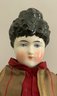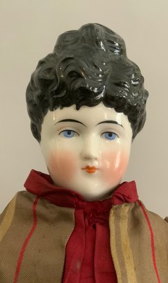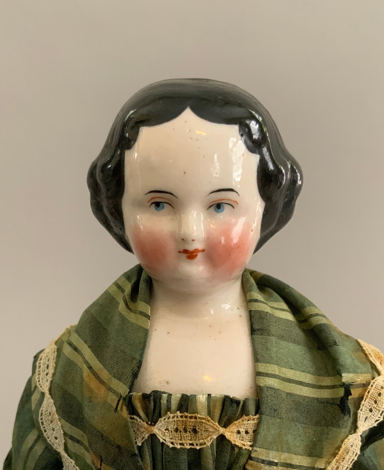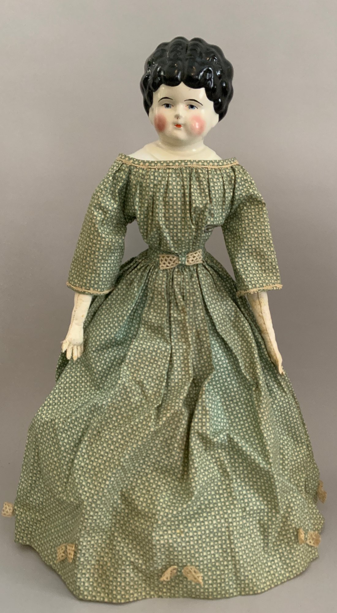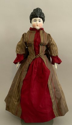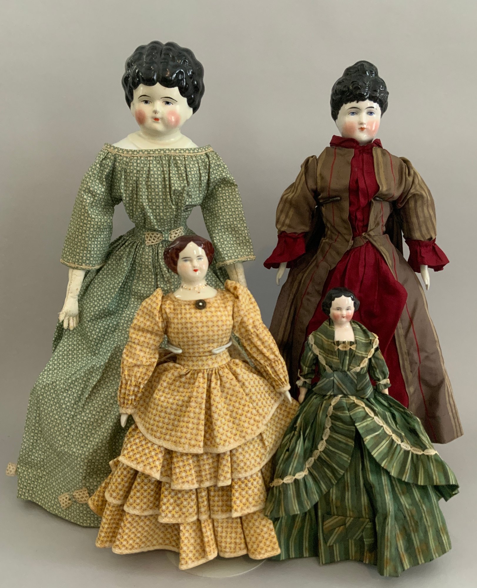 Lot of 4 – China head dolls, 1 – 10” black hair, painted features, cloth body with china arms, green silk dress (stains), 1 – 17” 1254? black hair, painted features, top knot, cloth body with china limbs, brown/red dress, 1 – 21” black hair, painted features, molded neck ware, cloth body with leather arms, green dot dress (facial rubs), & 1 – 13” brown hair, painted features, molded gold necklace, cloth body with china limbs, yellow/brown dress