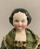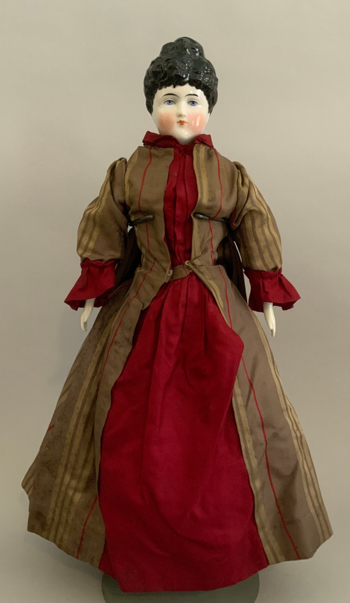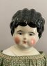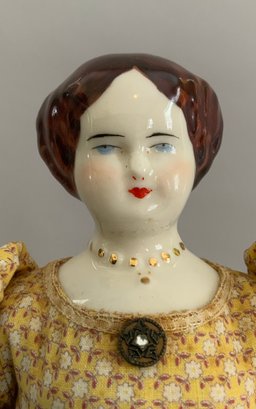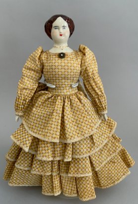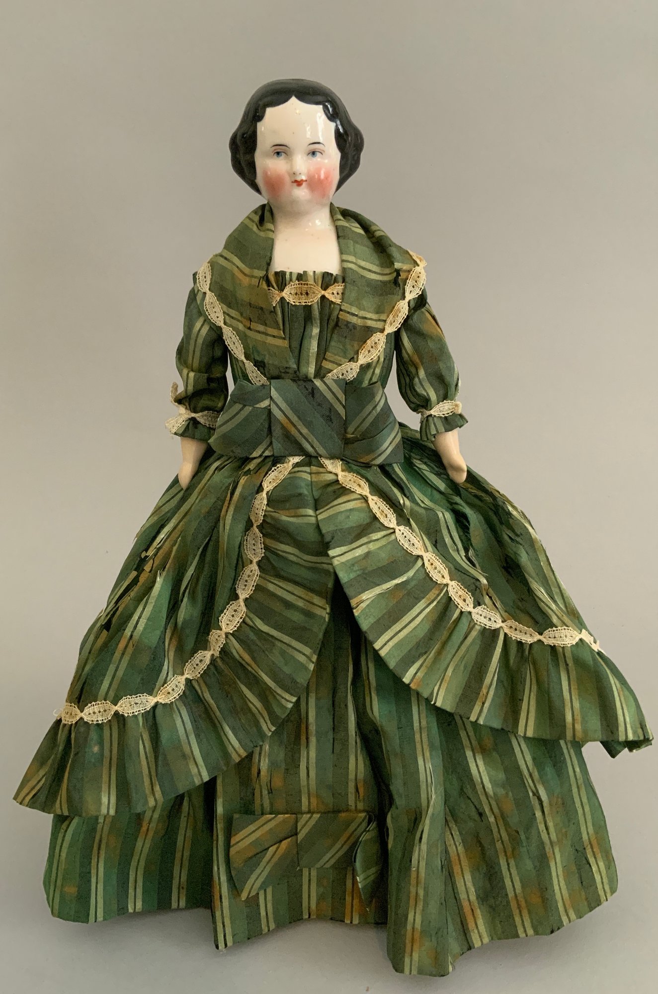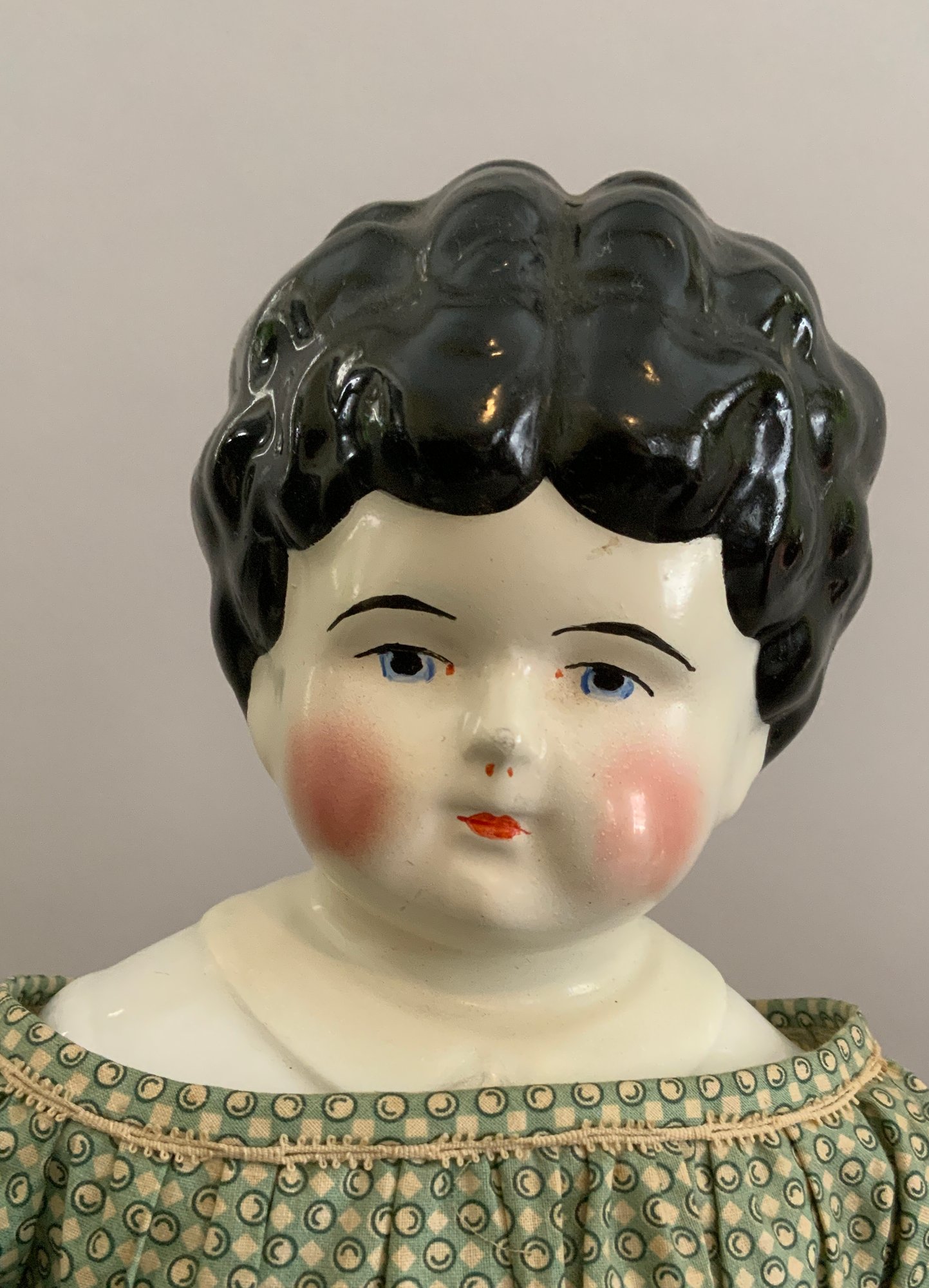Lot of 4 – China head dolls, 1 – 10” black hair, painted features, cloth body with china arms, green silk dress (stains), 1 – 17” 1254? black hair, painted features, top knot, cloth body with china limbs, brown/red dress, 1 – 21” black hair, painted features, molded neck ware, cloth body with leather arms, green dot dress (facial rubs), & 1 – 13” brown hair, painted features, molded gold necklace, cloth body with china limbs, yellow/brown dress