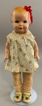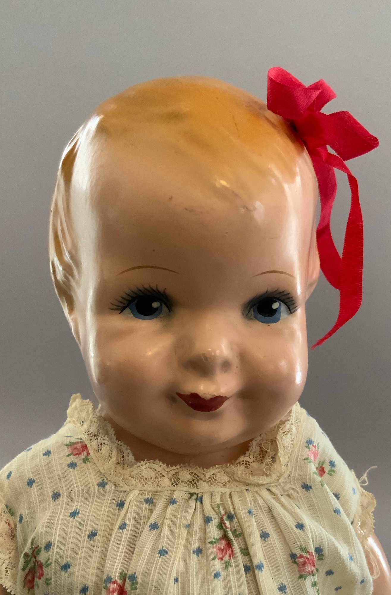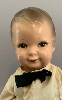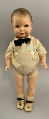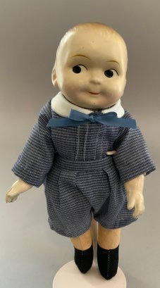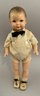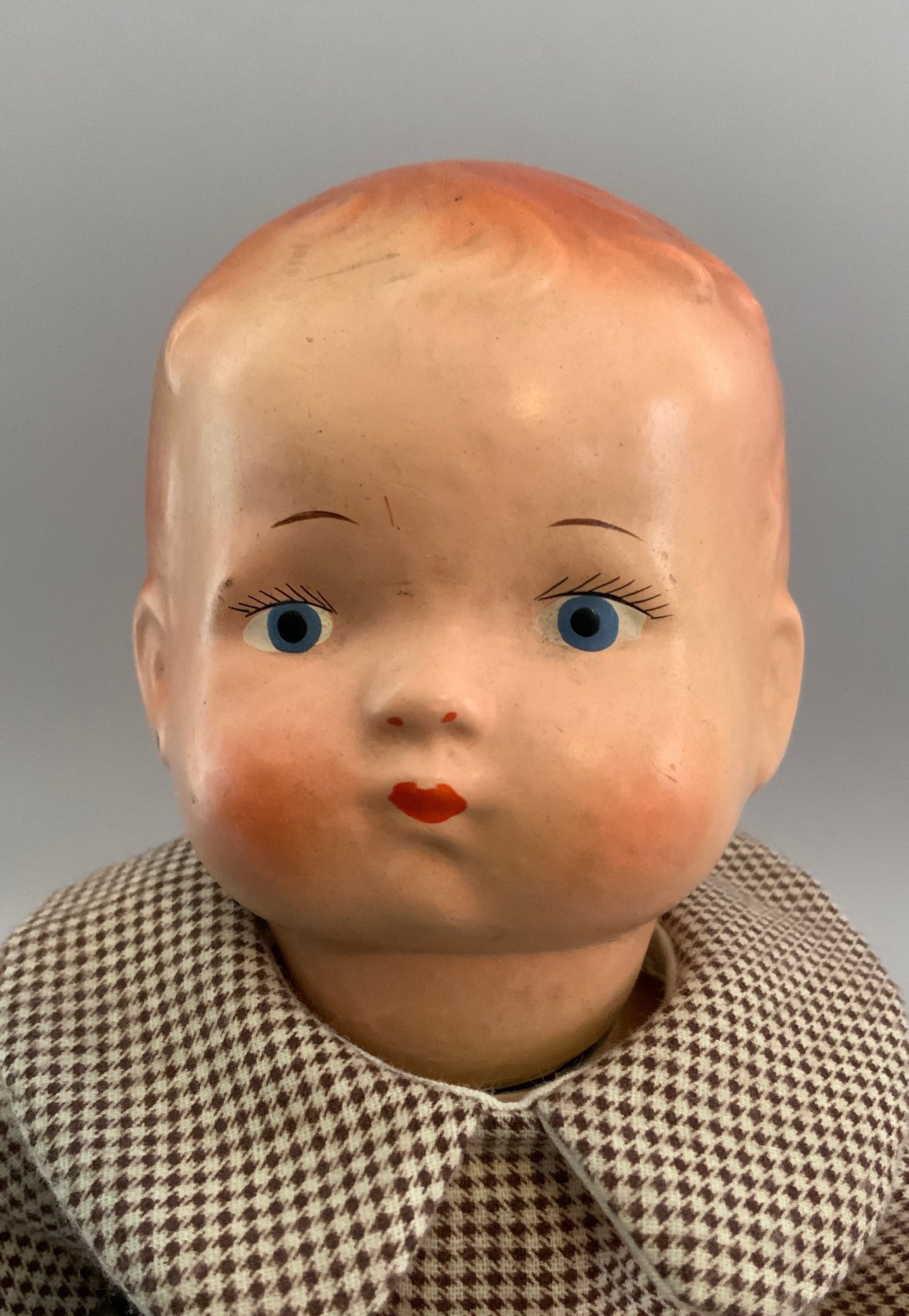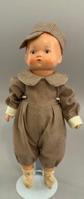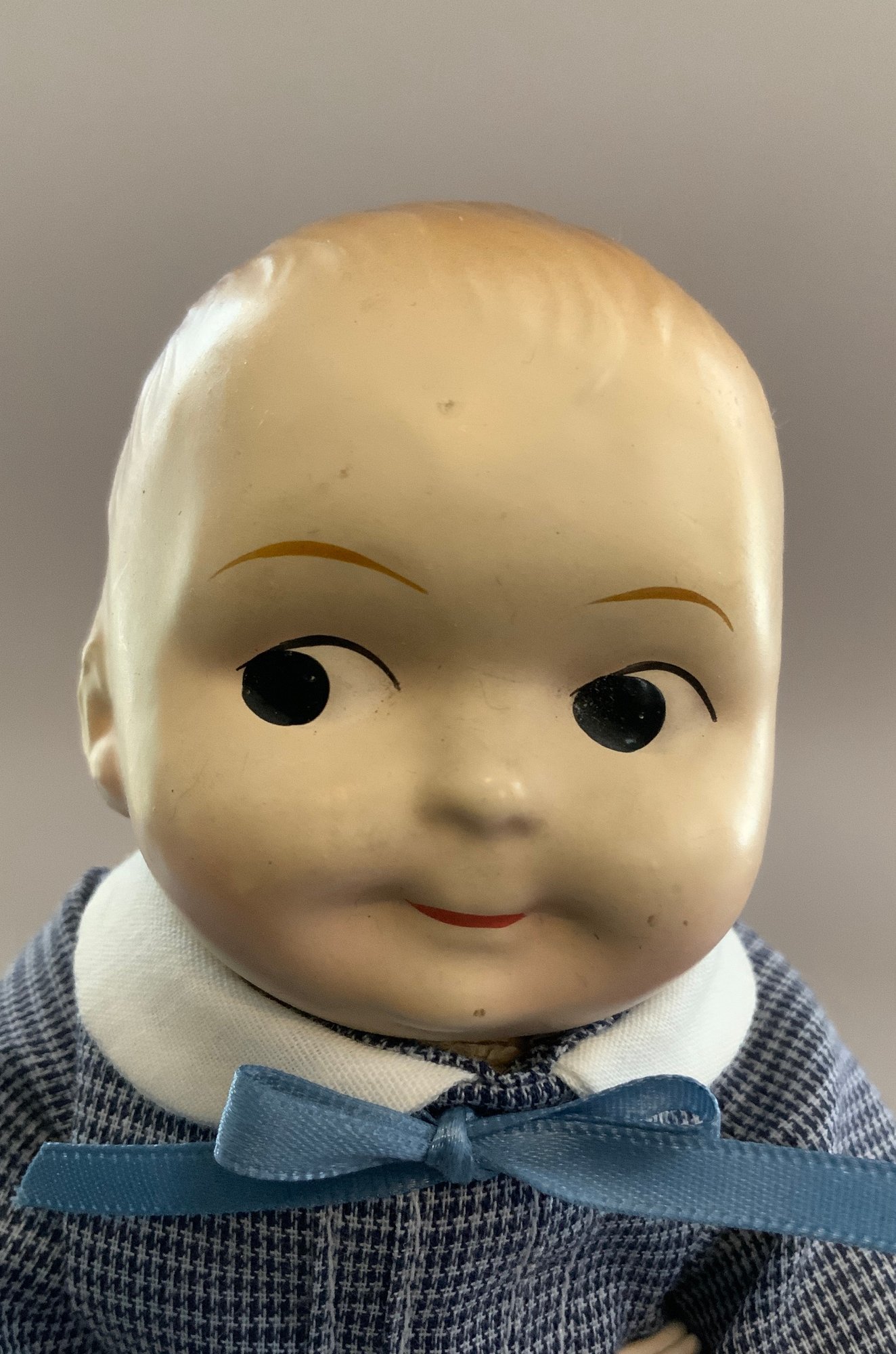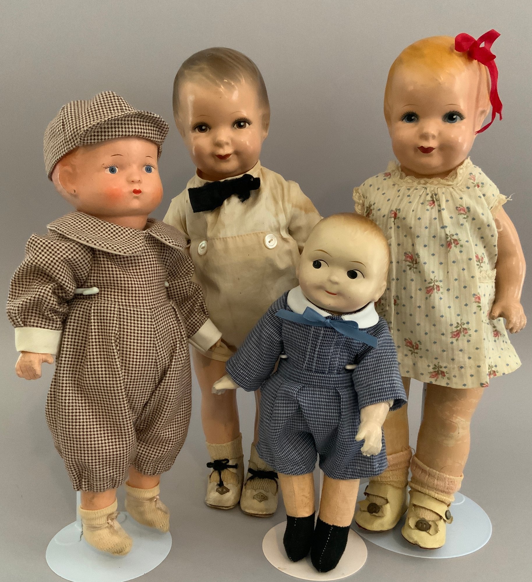 Lot of 4 dolls, 1 – 11” Compo, painted features, brown check suit, 1 – 11” compo, painted features side glancing eyes, cloth body, compo arms, blue suit, 2 – 14” George Averill Little Brother & Sister, compo shoulder plates, cloth bodies, compo limbs, painted features,