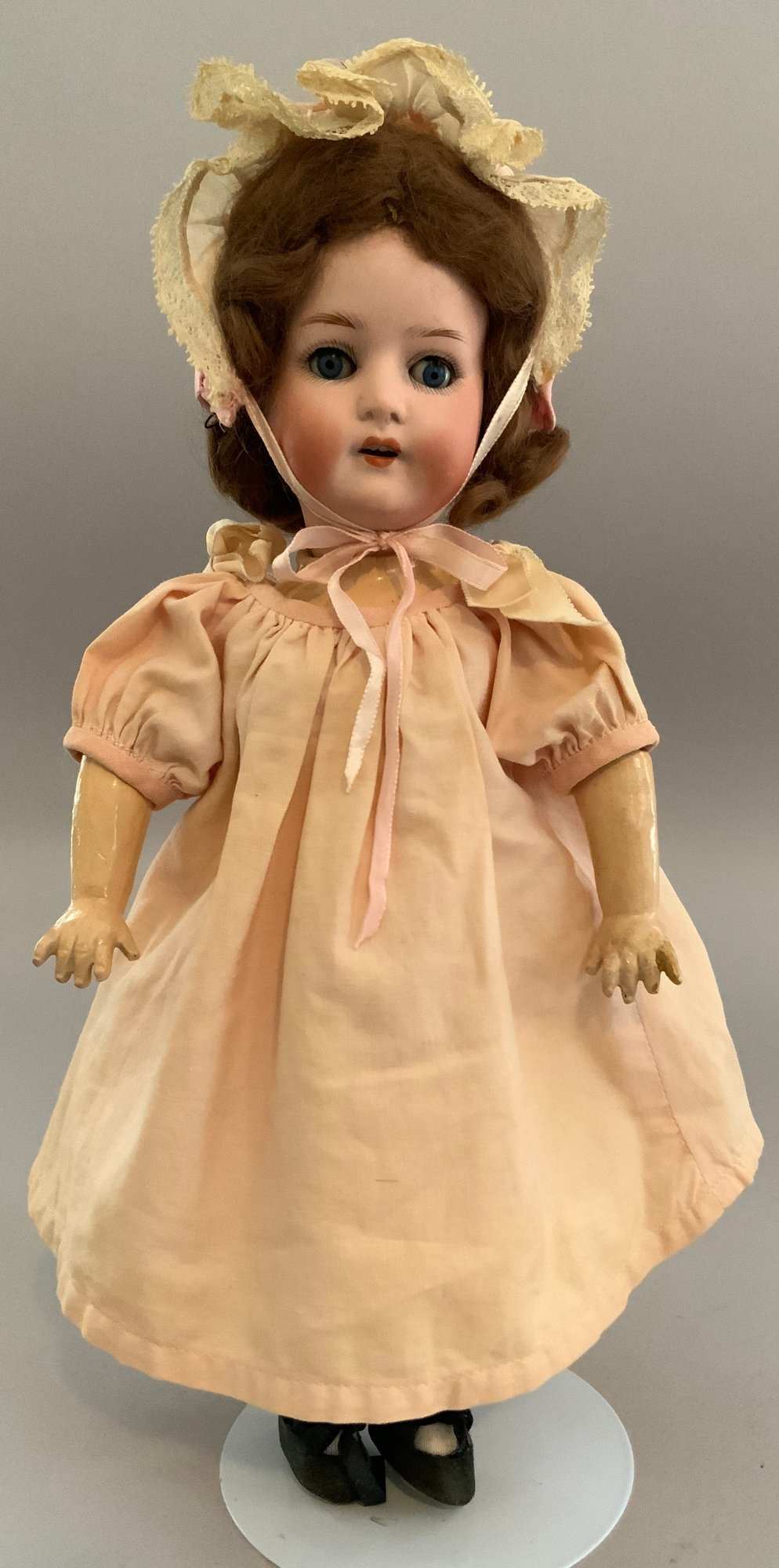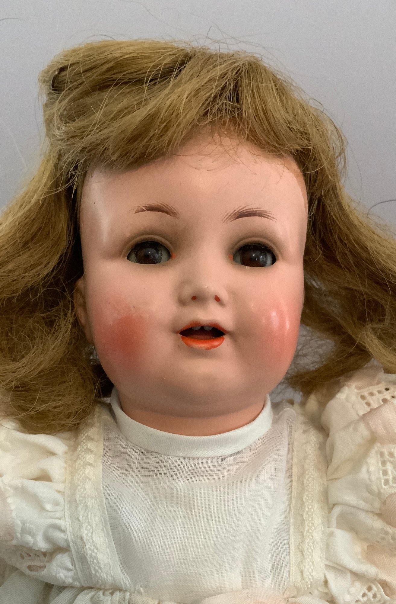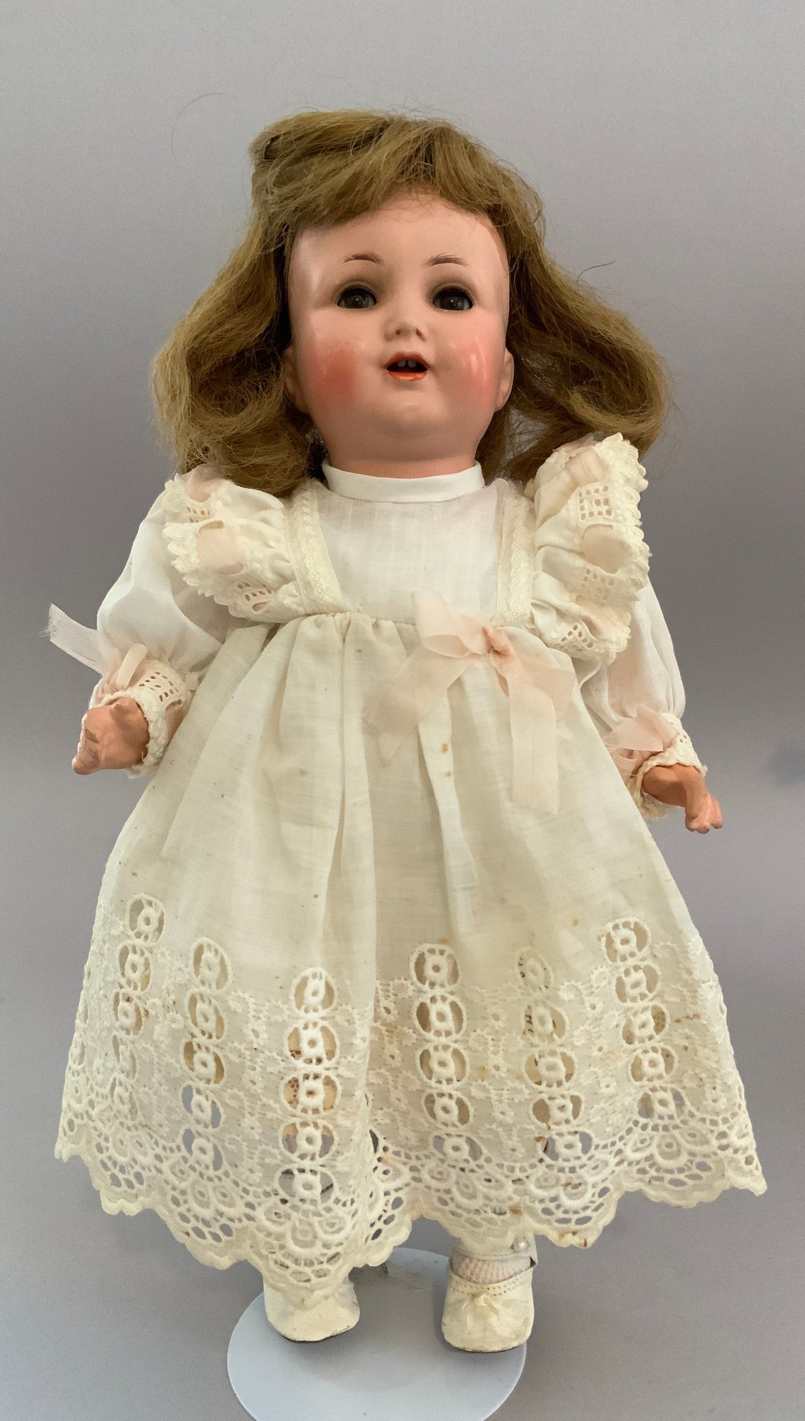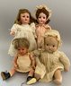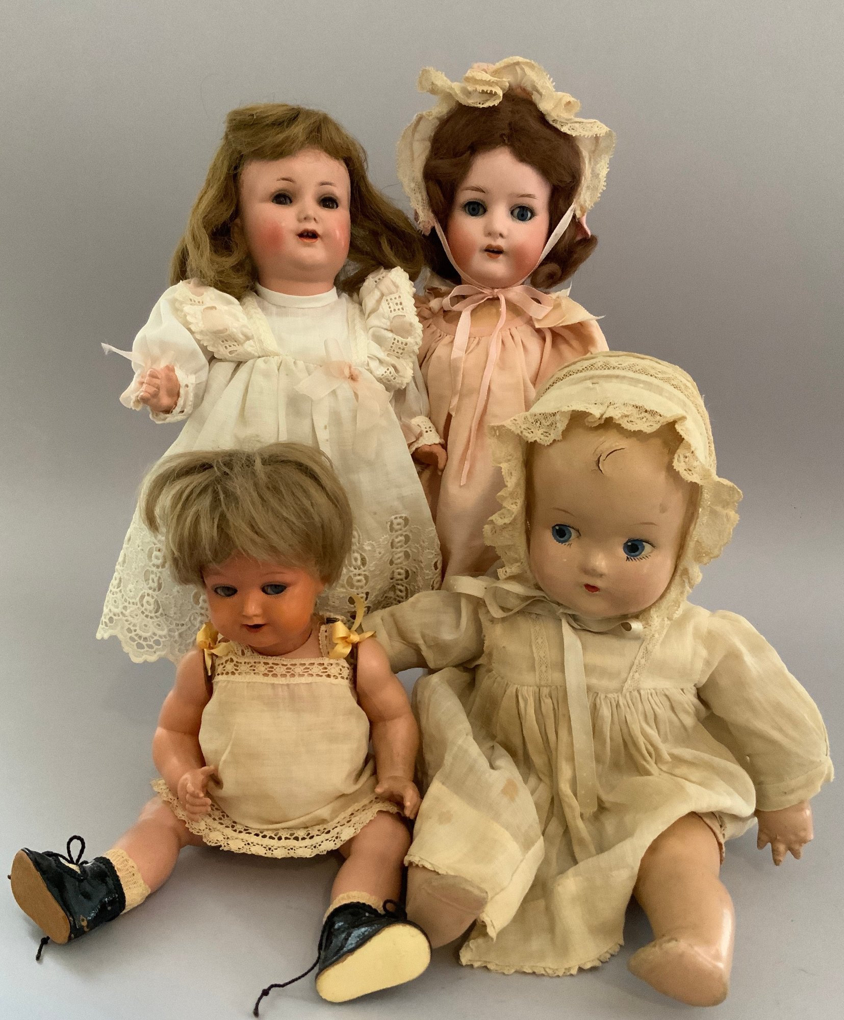 Lot of 4 dolls, 1 – 13” Bisque Ernst Heubach 312, blue glass sleep eyes, OM with teeth, red mohair wig, compo body, peach dress, 1 – 12 ½” painted bisque, brown glass sleep eyes, OM with teeth, blonde mohair wig, compo body, white dress (stains), 1 – 12” Celluloid 728 with K*R body, blonde mohair wig, (head cracks), & 1 – 14” Madame Alexander comp, painted features, cloth crier body, white dress (stains, head crazing)