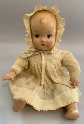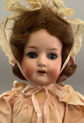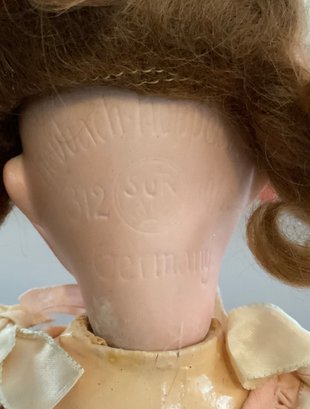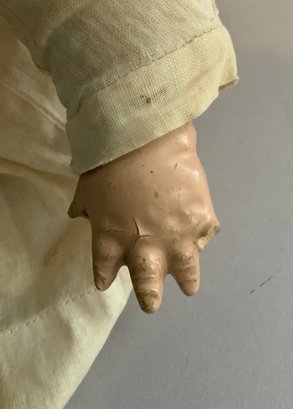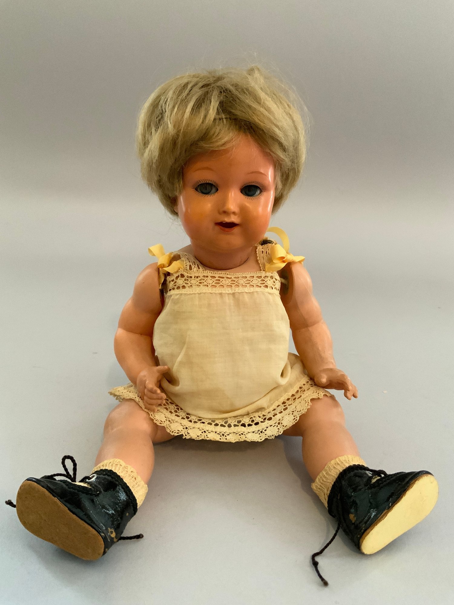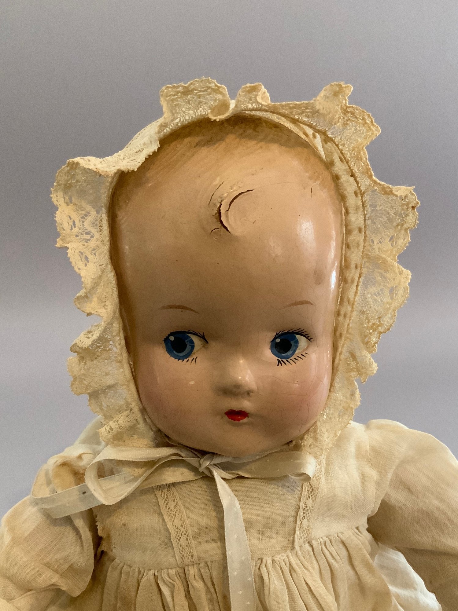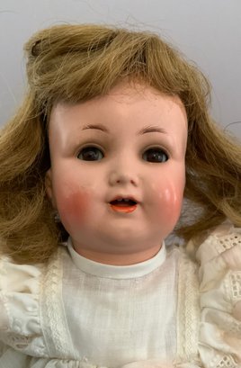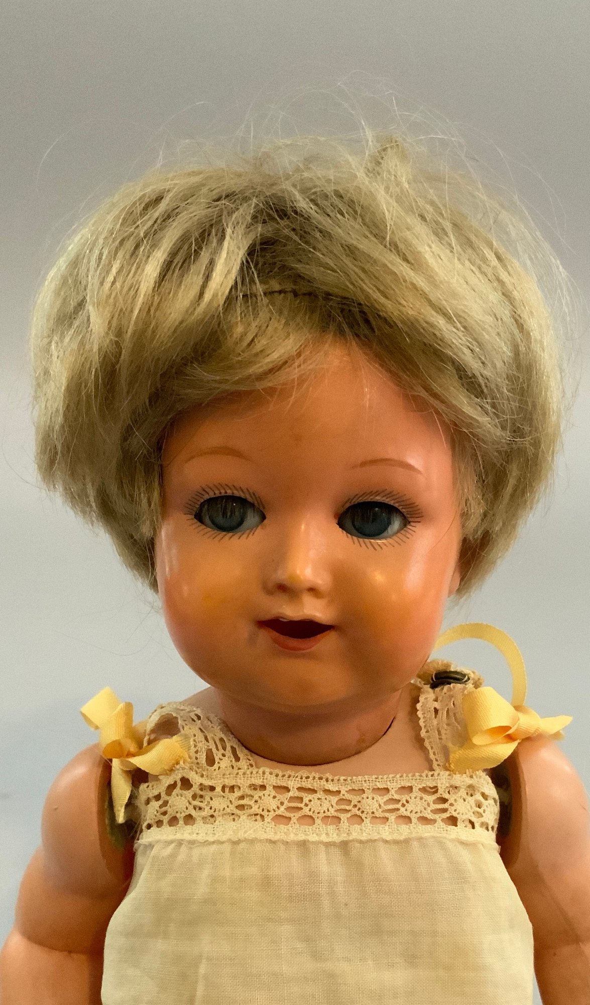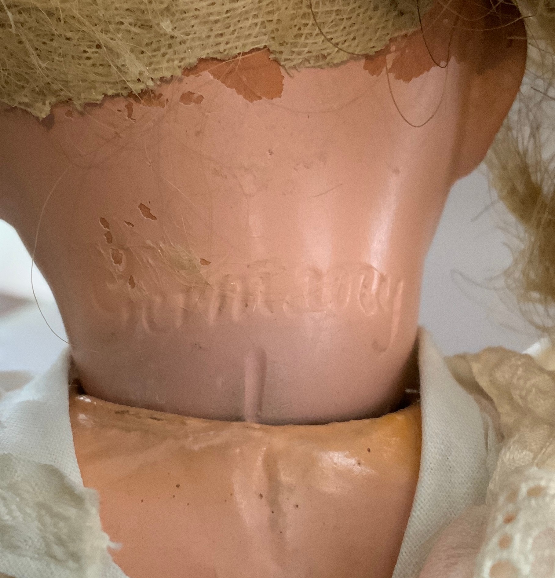 Lot of 4 dolls, 1 – 13” Bisque Ernst Heubach 312, blue glass sleep eyes, OM with teeth, red mohair wig, compo body, peach dress, 1 – 12 ½” painted bisque, brown glass sleep eyes, OM with teeth, blonde mohair wig, compo body, white dress (stains), 1 – 12” Celluloid 728 with K*R body, blonde mohair wig, (head cracks), & 1 – 14” Madame Alexander comp, painted features, cloth crier body, white dress (stains, head crazing)