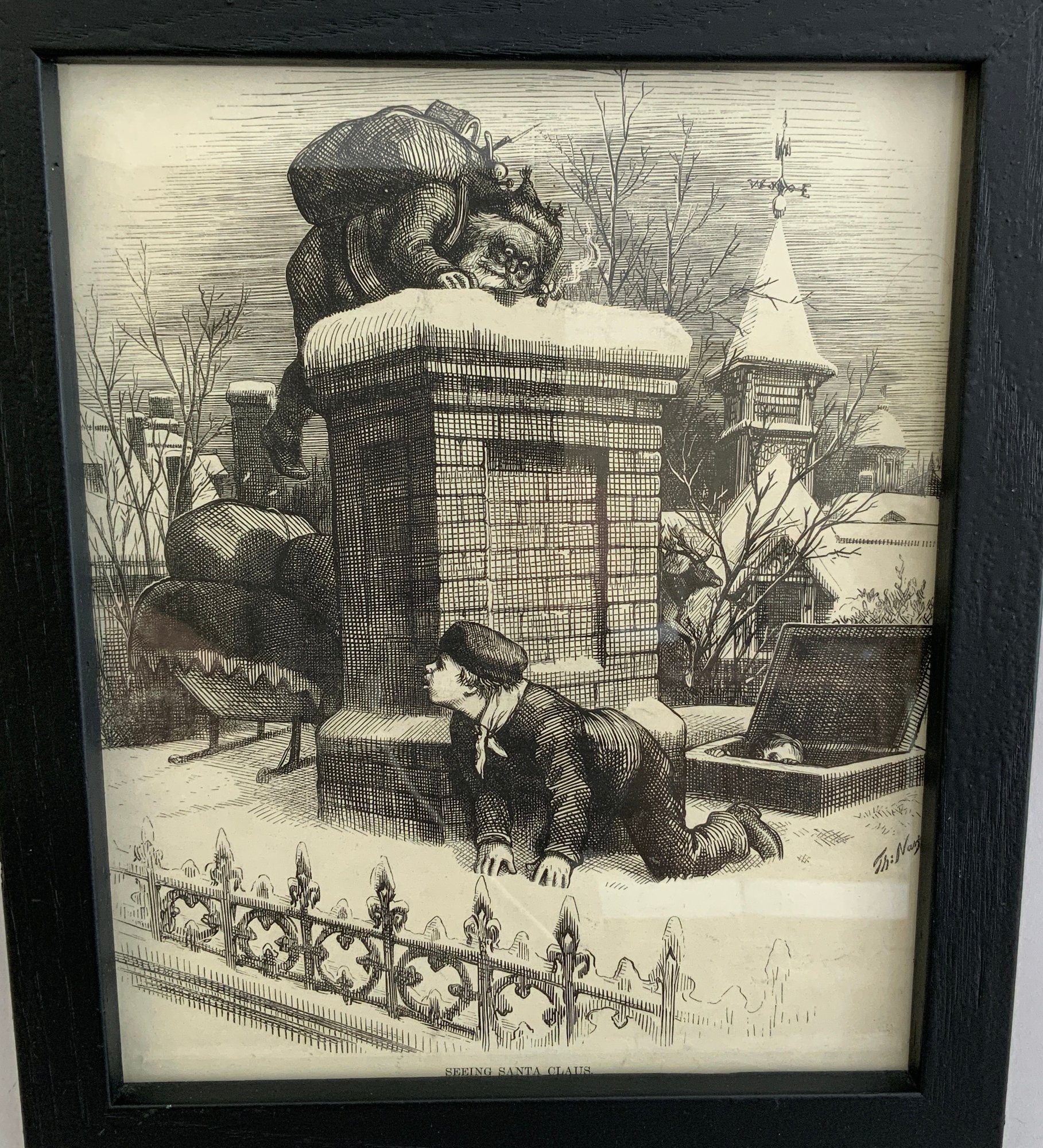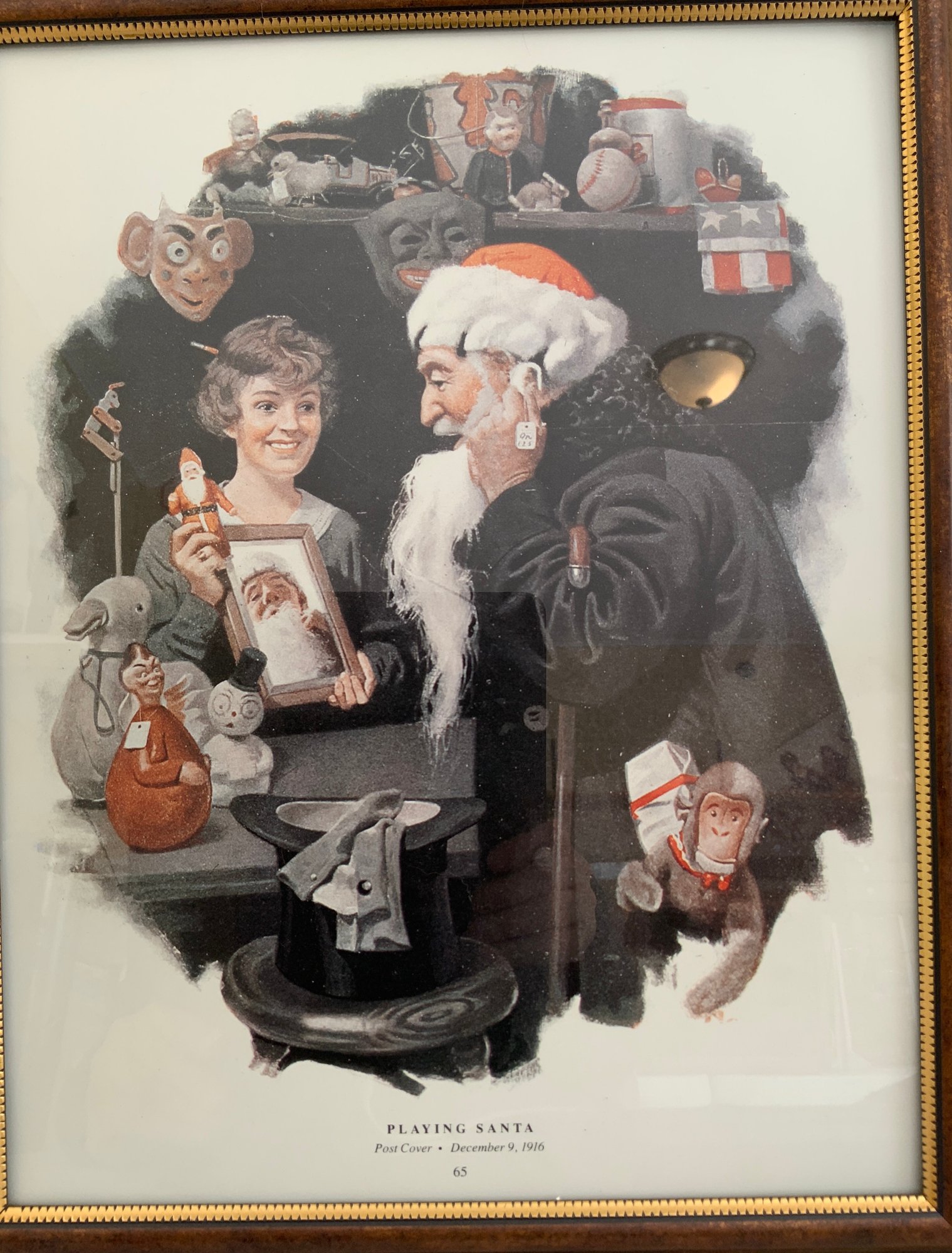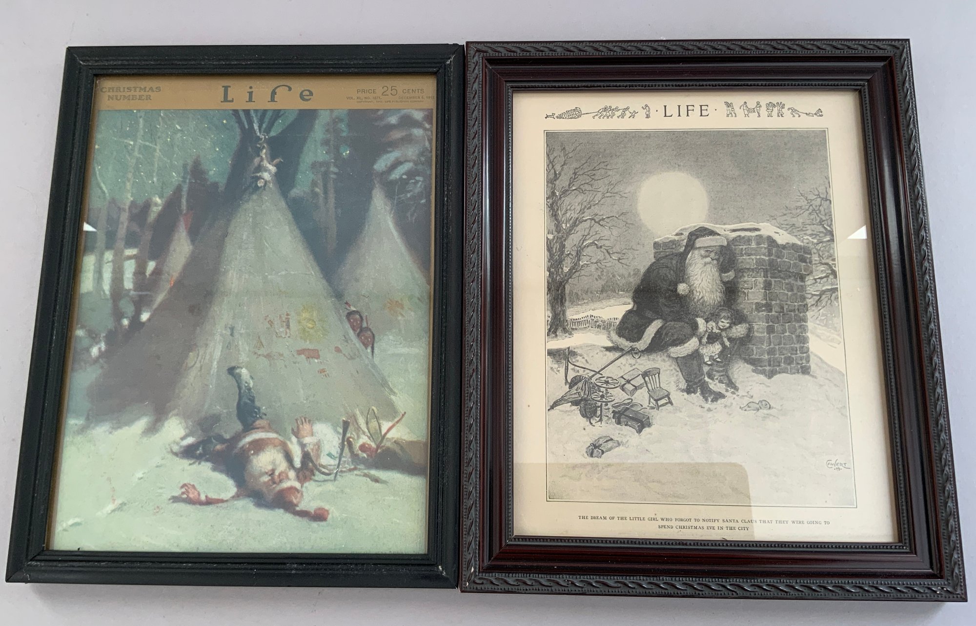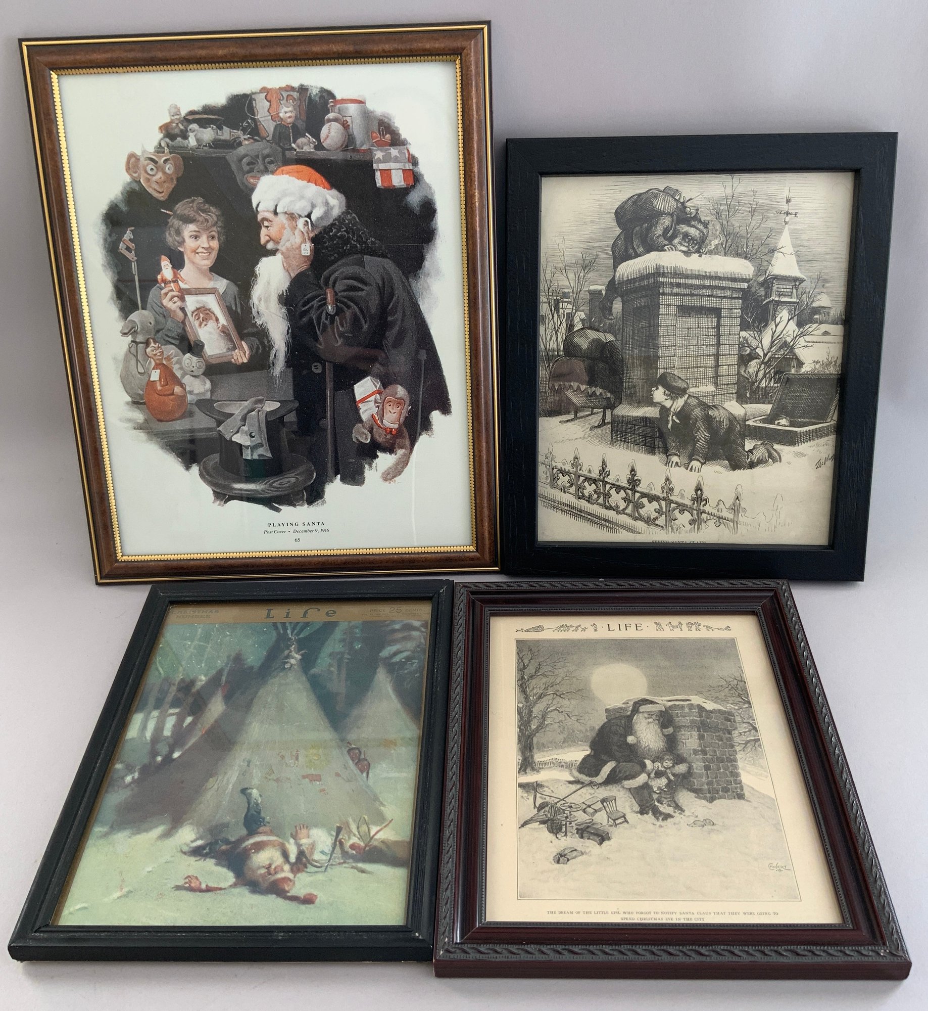 Lot of 4 framed Christmas/Santa items, 1 – 8” x 10 ½” “Life” magazine cover December 5, 1912, 1 – 8 ½” x 10 ½” Santa on Chimney print, 1 – 10 ½” x 13 ½” Post Cover “Playing Santa”, & 1 – 8” x 10” “Life” “The dream of the little girl who forgot to notify Santa Claus that they were going to spend Christmas eve in the city”