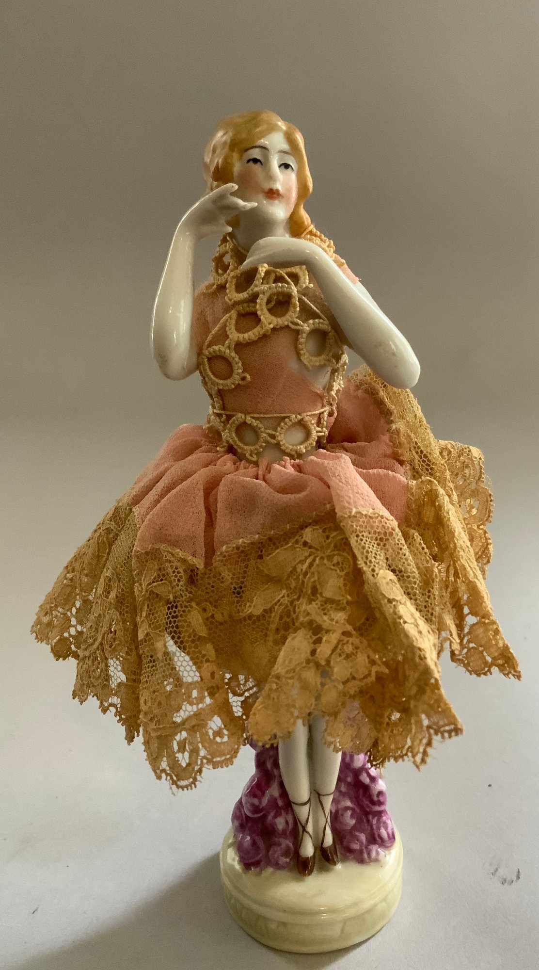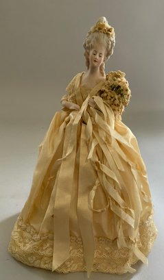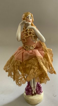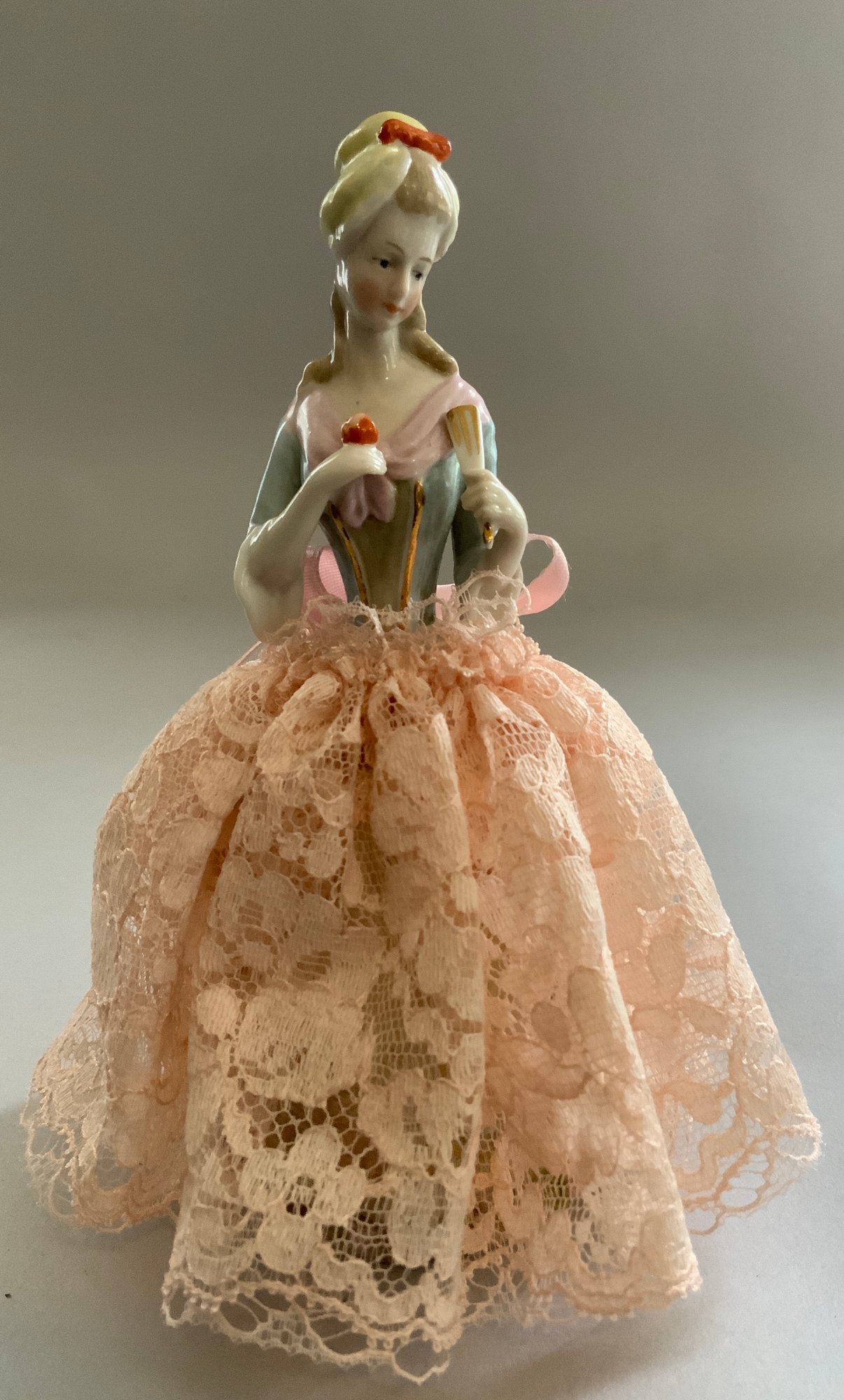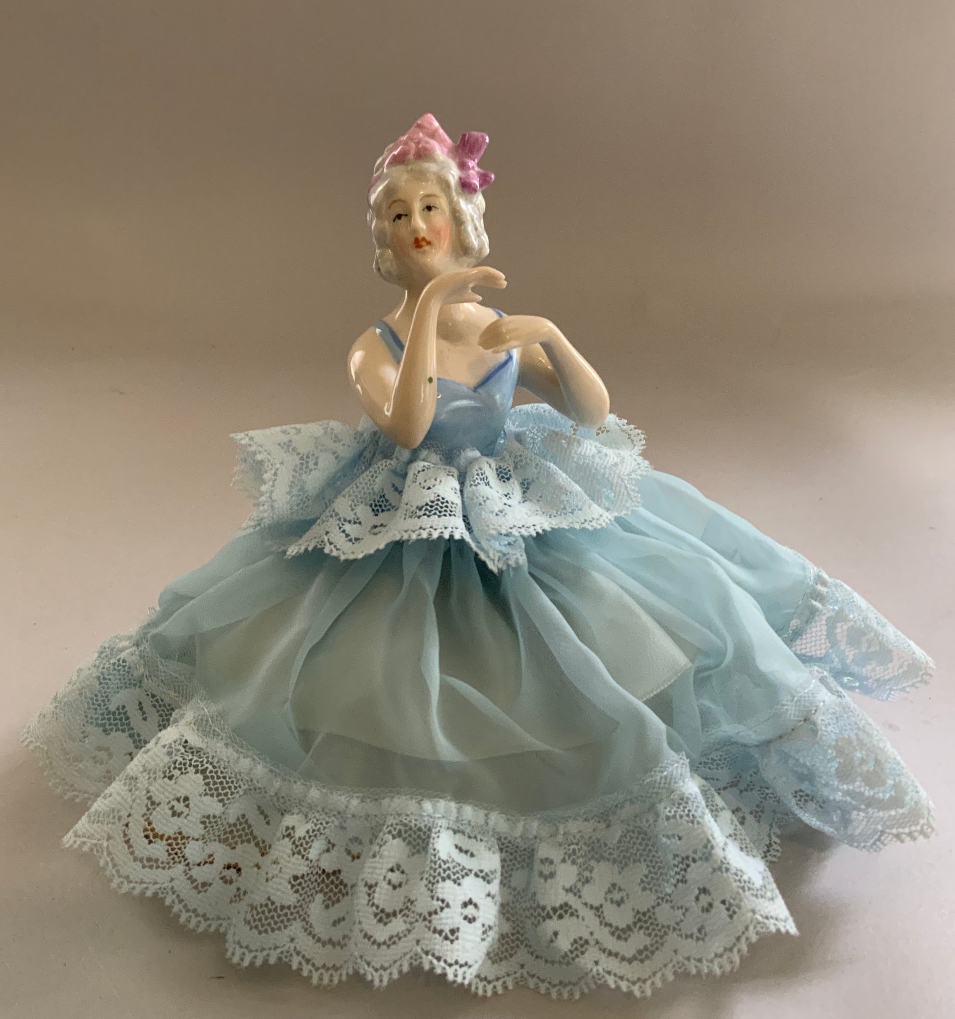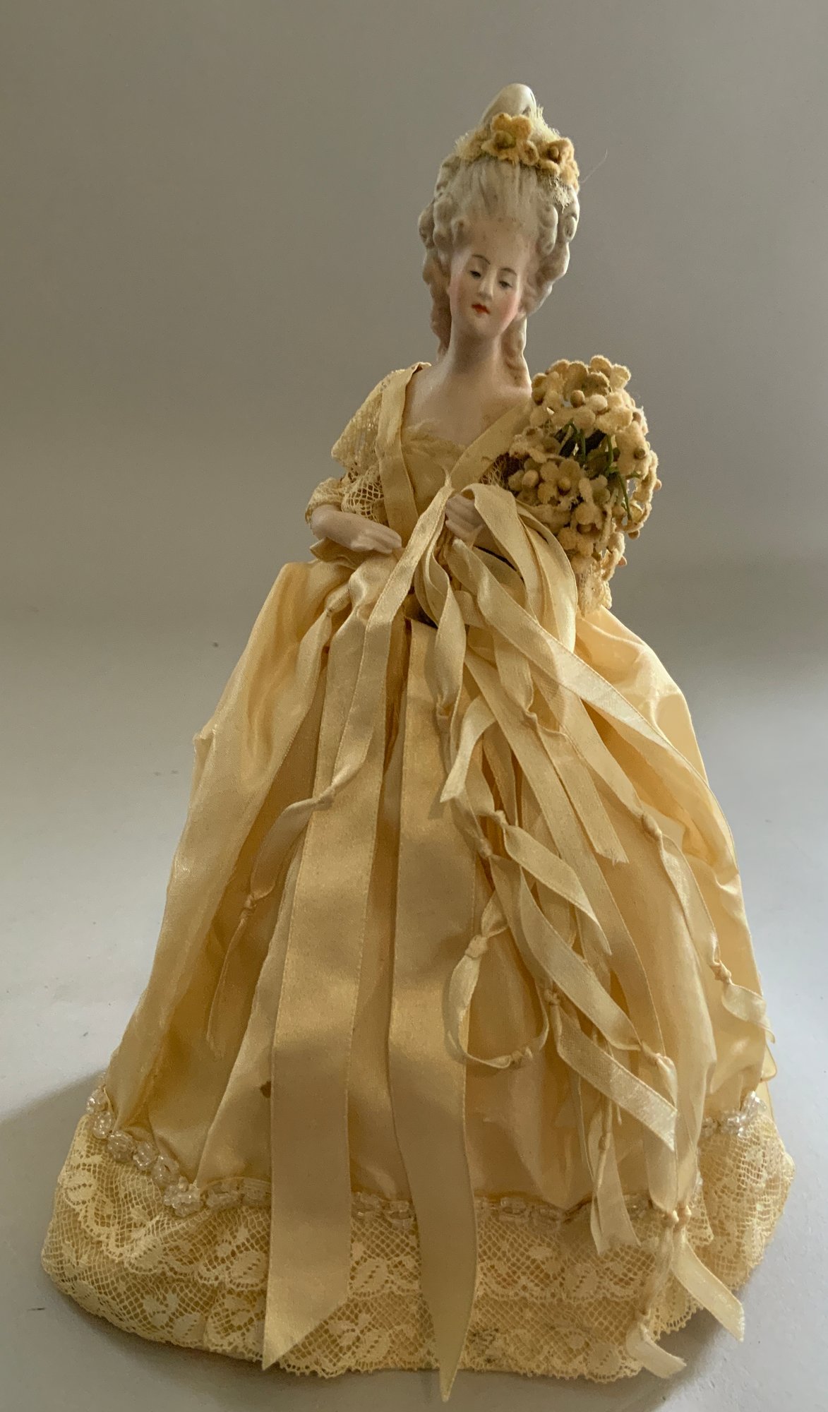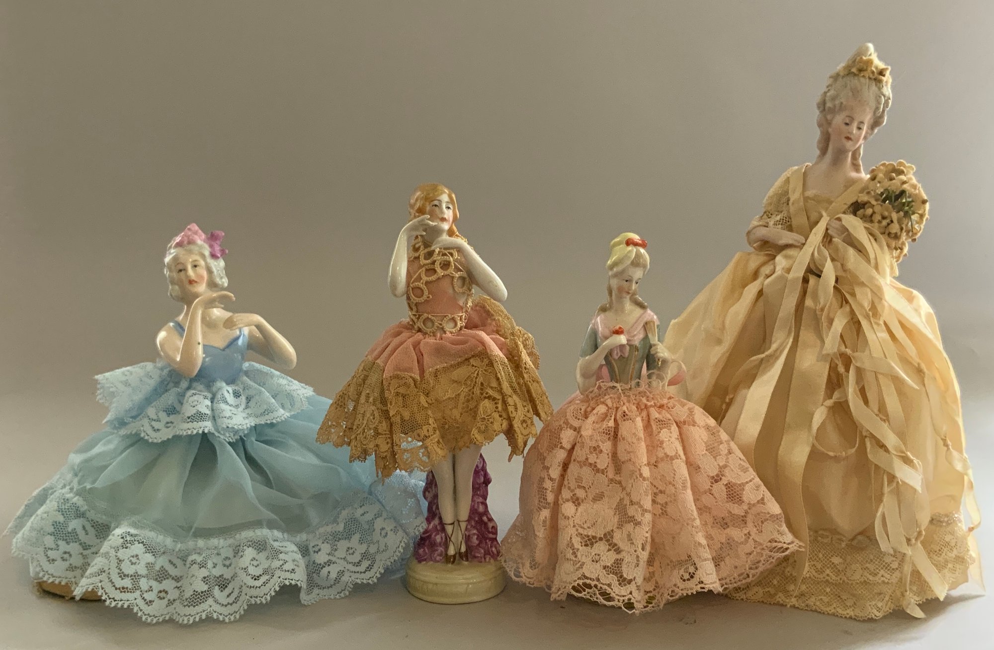 Lot of 4 – Half dolls with pincushions & dressed 6” – 9” tall, one with legs