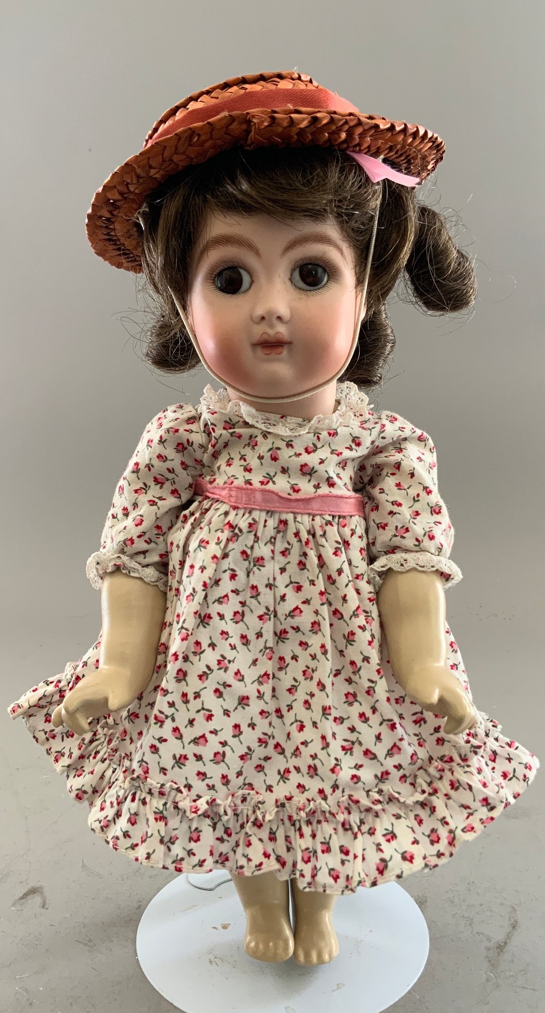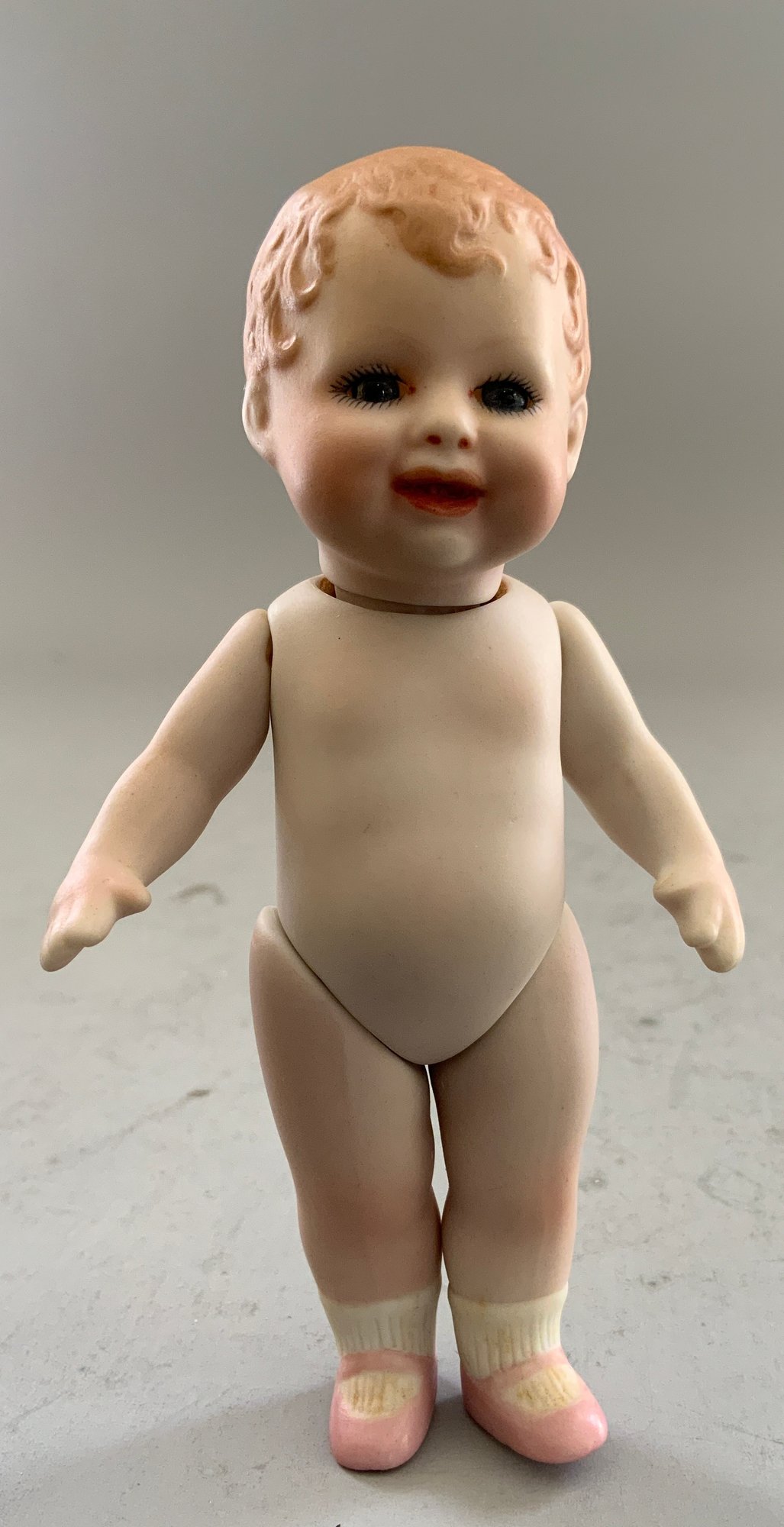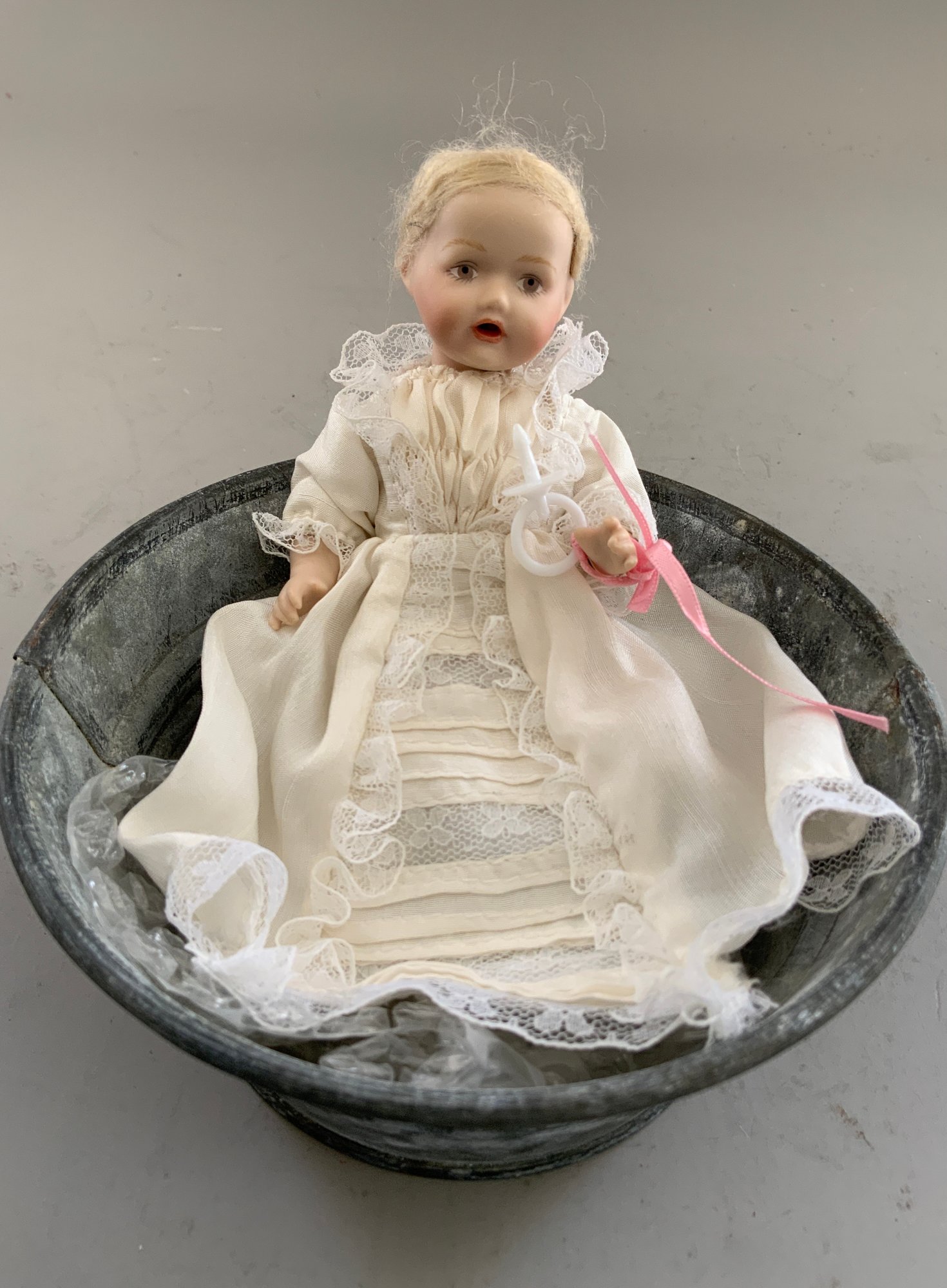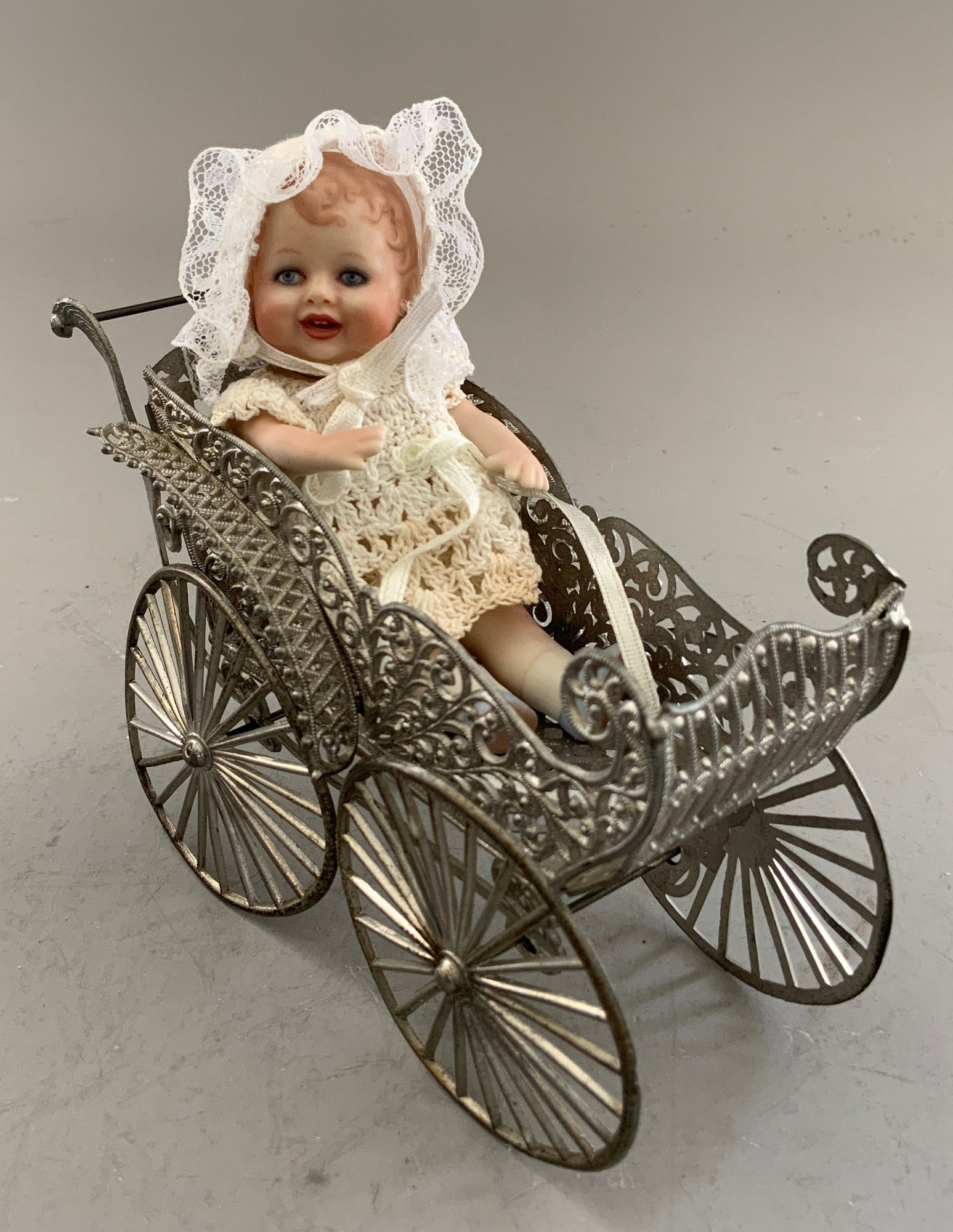 2 – Beverly Walter Bonnie Bebe artist dolls 4” & 5”, 1 – 5” artist doll, no name, all in small tub, 1 – 10” Sally Smith Cutts Googly-eyed artist doll (eyes need reset), & 1 – 6” white metal Marklin type carriage