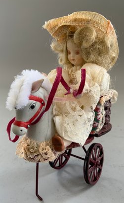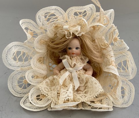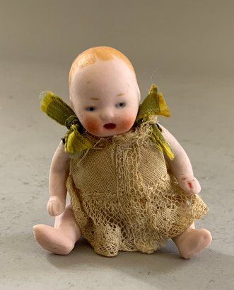 Lot of 4 Small dolls in party dress: 3 ½” All Bisque, glass eyes, mohair, strappy shoes, lace dress; 3 ½” all bisque baby, nursing mouth no bottle; and 2 repro bisque baby dolls