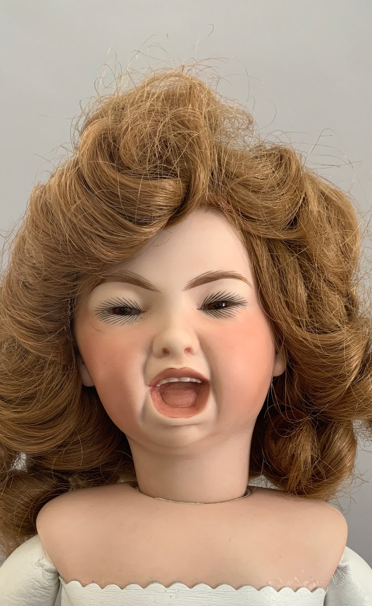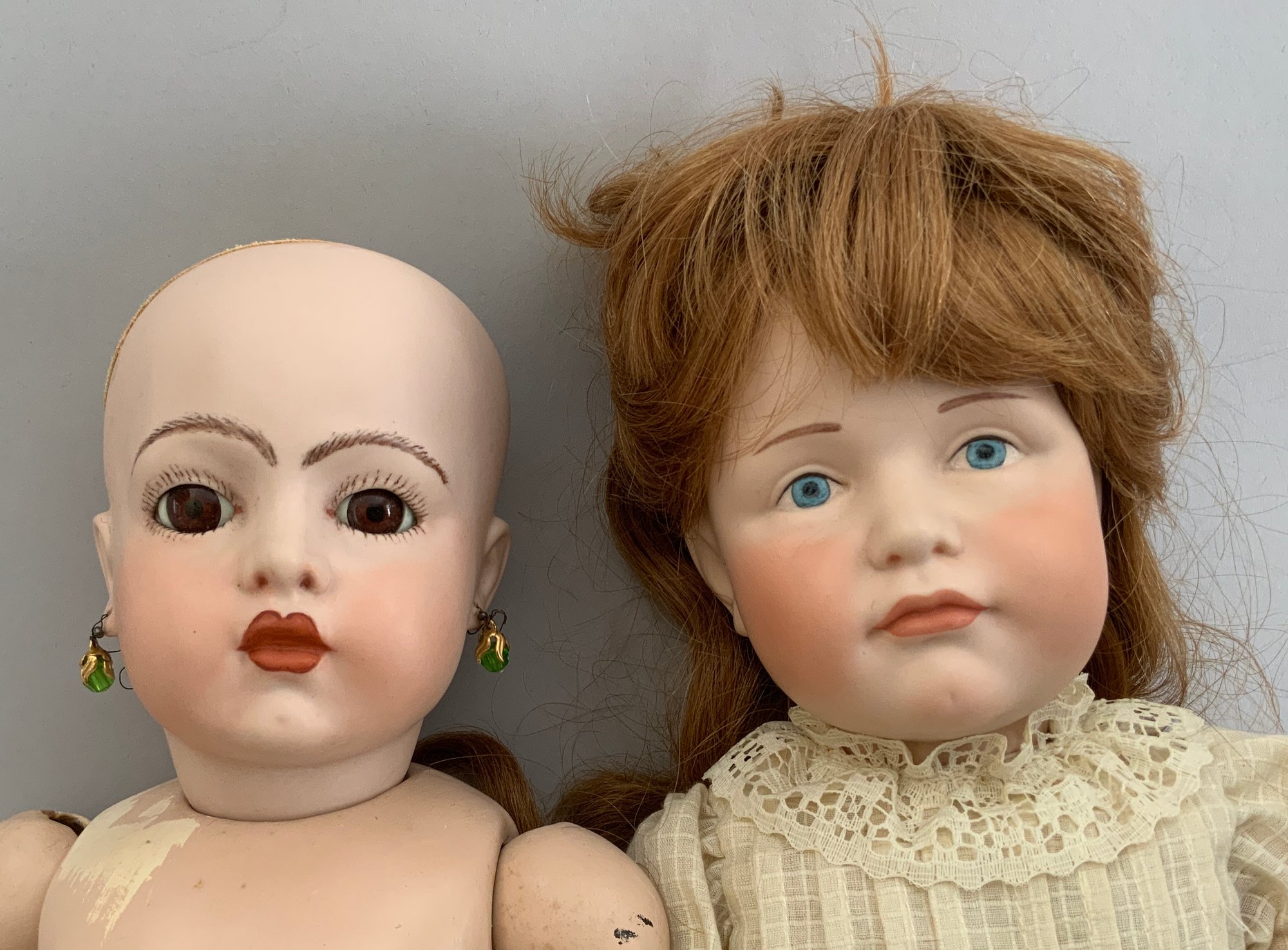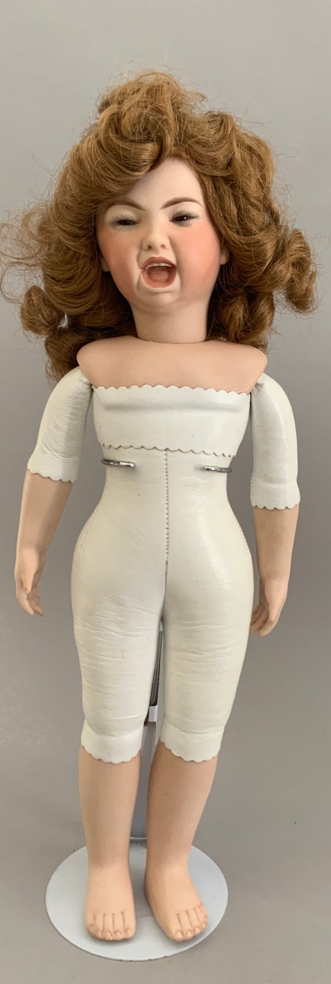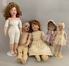 Lot of 5 artist dolls, 20” Bru Jne, no clothes, 21” K*R 114, white dress (missing left hand), 18” “Jackie” 72 girl, scowling face, 12” bisque Shirley Temple, 11” bisque Artie 152-3 girl doll