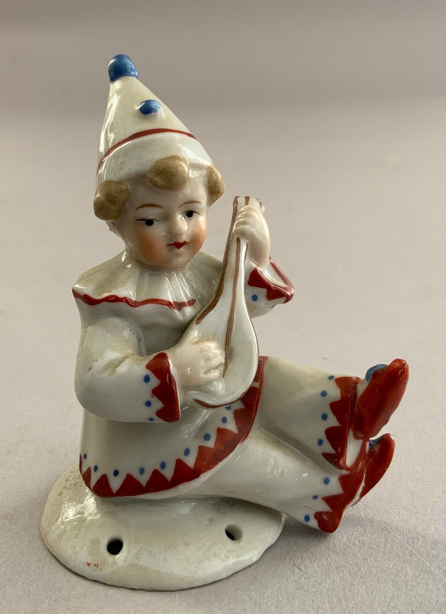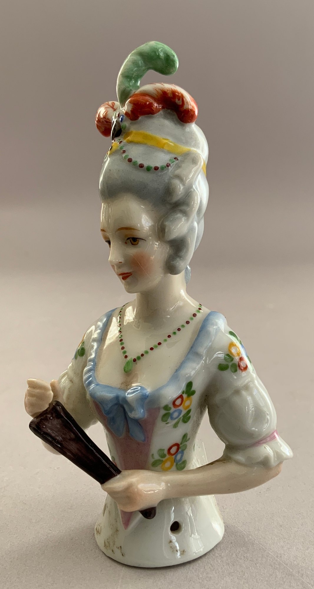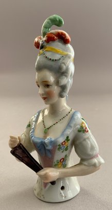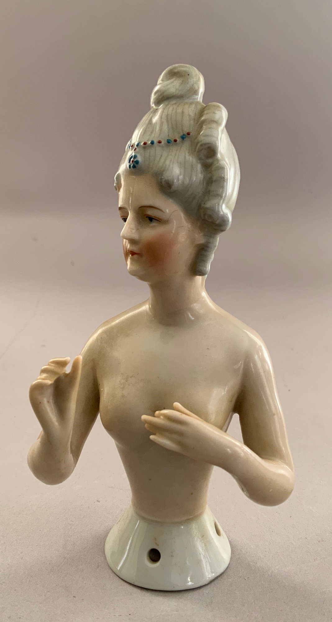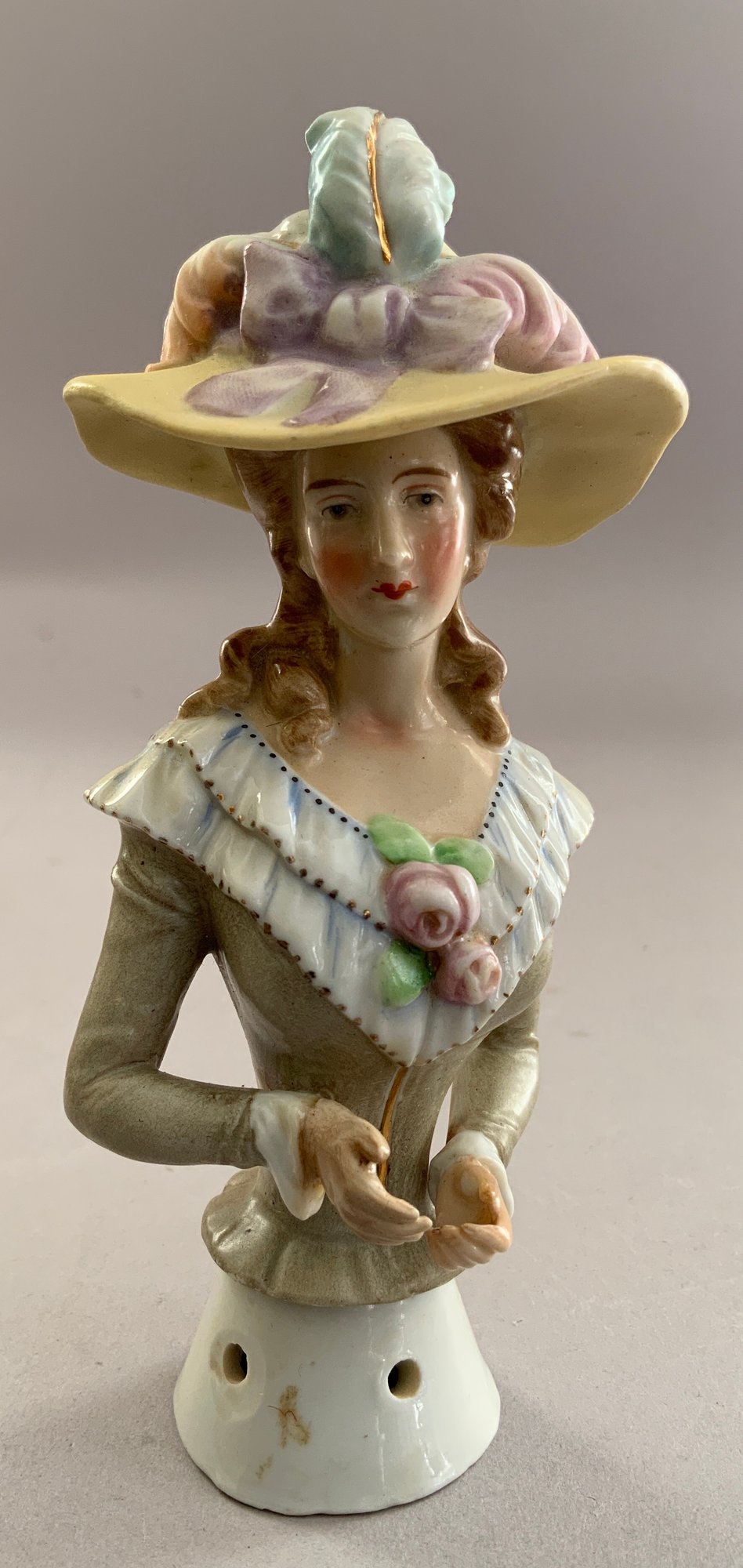 Lot of 5 asst Half Dolls: 5 ½” turned head w/ broad brim hat w/ molded plumes, Gray bodice, painted features; 5 ¾” doll marked Goebel Bavaria, nude, hair is up-swept w/ molded blue beads, arms away; 4” w/ floral bodice, holding a feather fan, upswept hair w/ molded plumes, beads & ribbons; and a 3” figurine of child dressed as a clown playing a mandolin, has stringing holes for a base