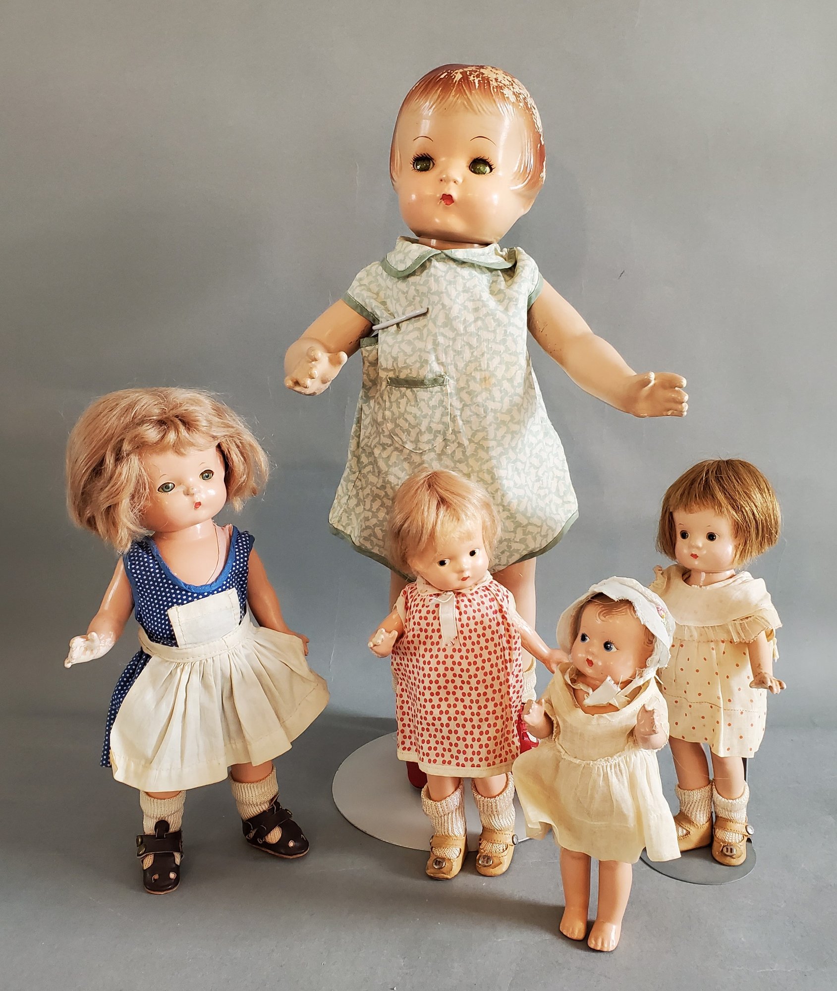 LOT OF 5 EFFANBEE COMPOSITION DOLLS - 8" - 19", MINOR PAINT FLAKING & CRAZING NOTED