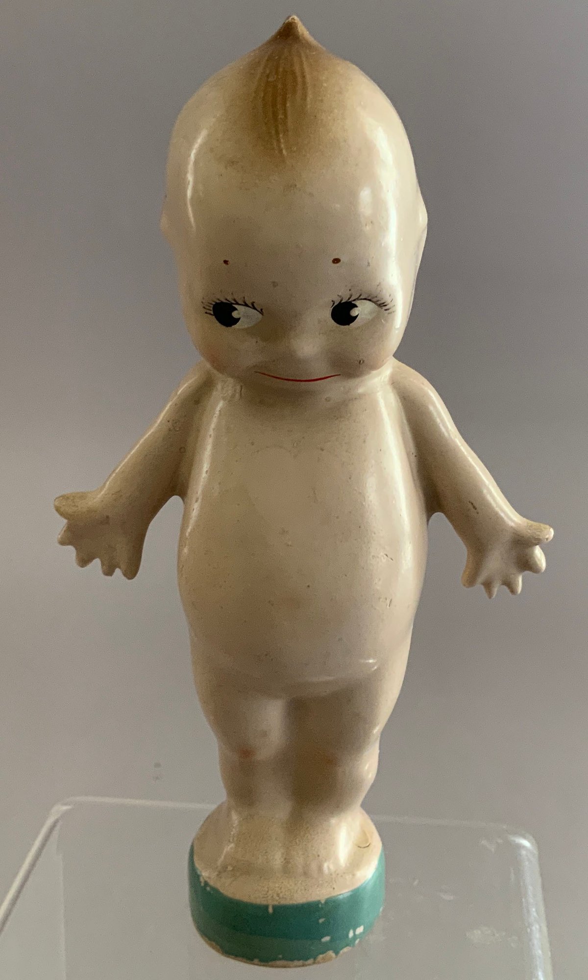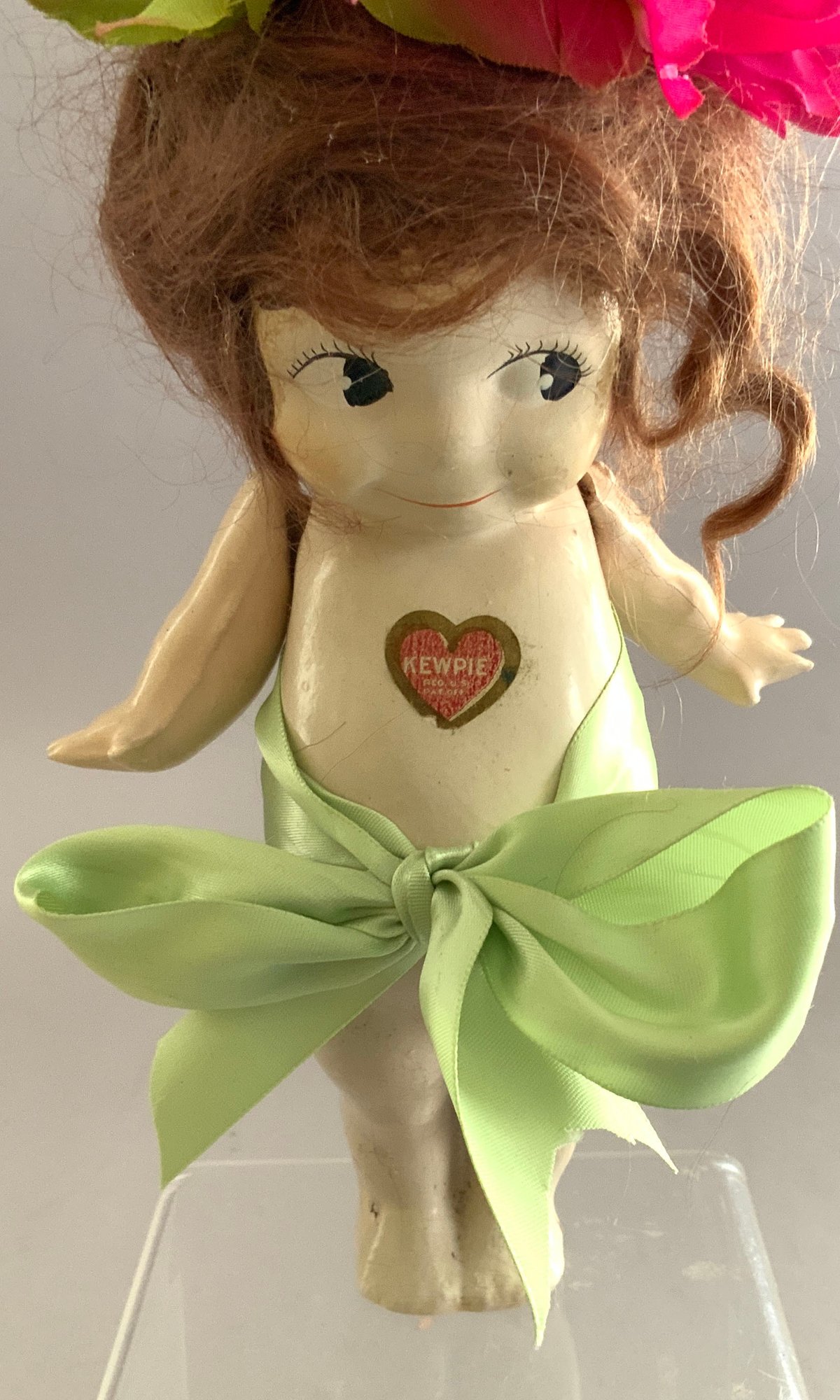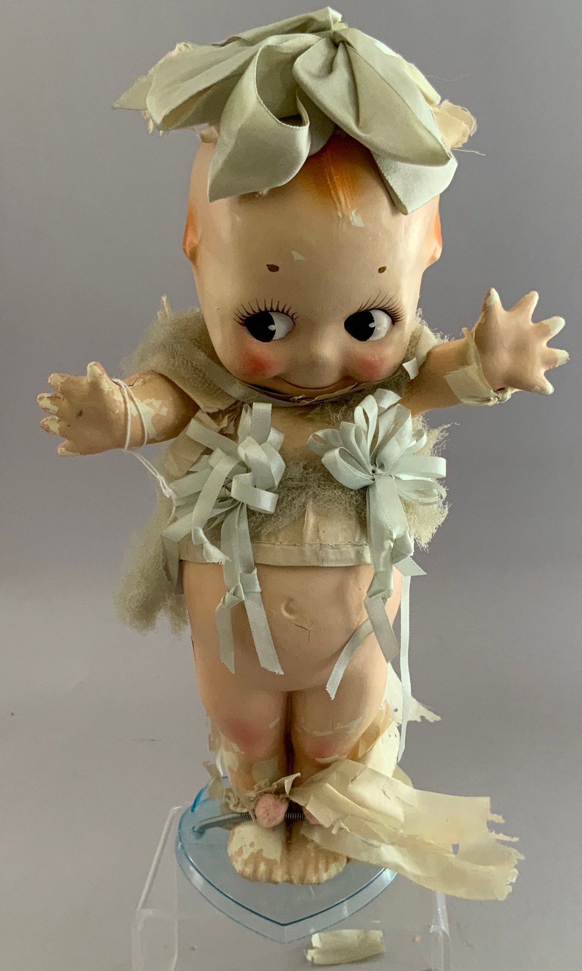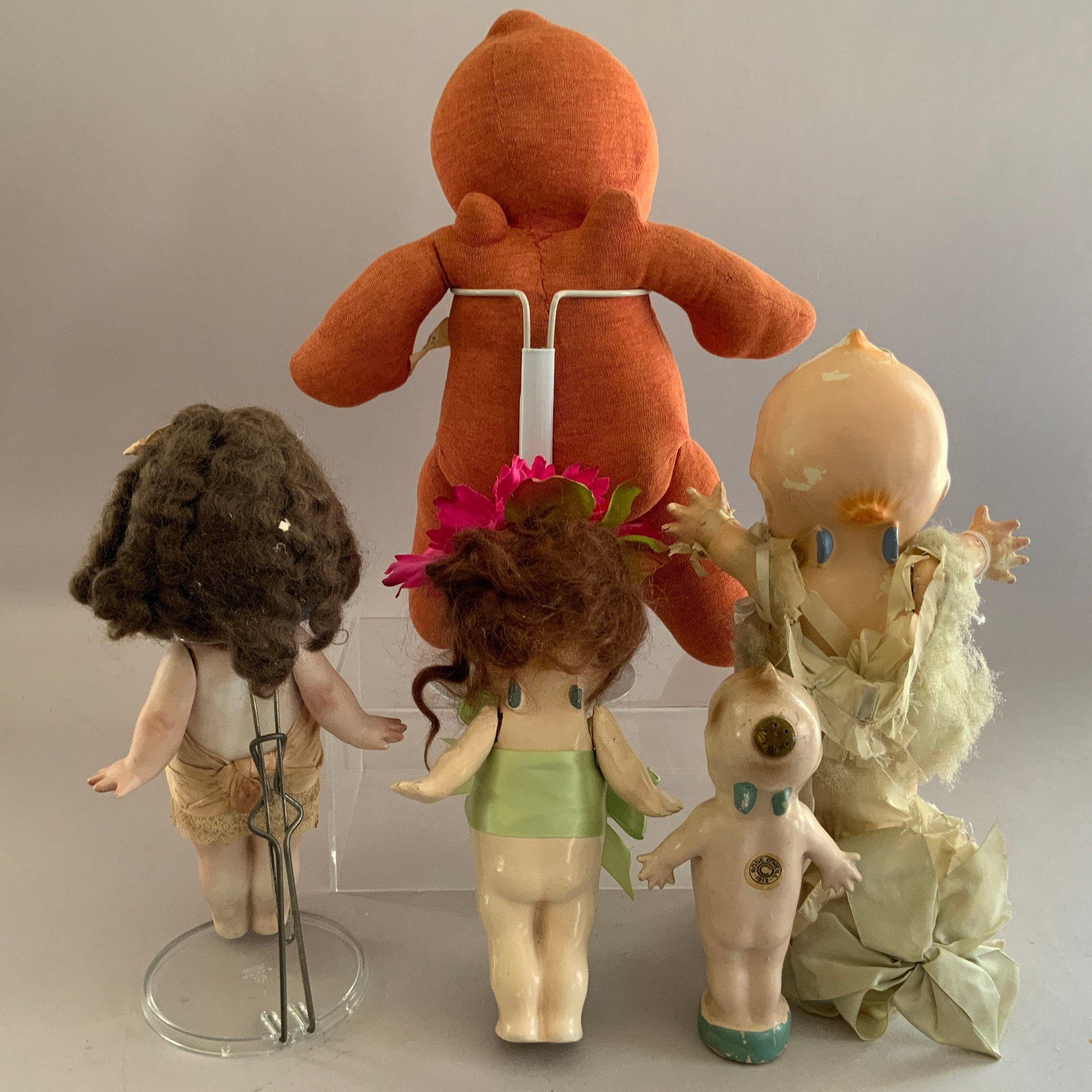 Lot of 5 Kewpies of all kinds: 14” Cloth Cuddle Kewpie, faded red, stockinette body, w/ mask face, side-glancing eyes, lumps on shoulders for wings, comes with a blue calico romper & hat (not original to the doll); 12” Compo Kewpie. body has a lot of flaking, jointed arms only, blue wings, molded top knot has crack on belly & head, black side-glancing eyes, wearing original outfit of silk, ribbons & tulle (melting), (hole in the right foot); 11” All bisque Kewpie, blue wings, (no Label), wears silk & lace (melting), wig glued down; 10”Compo Kewpie, blue wings, arms jointed at shoulders, has Kewpie Heart Label on chest & a Rose O’Neill label, Pat.1913 on the feet, (wig heavily glued down), wears ribbon & a flower in her hair and a 7 ½”Compo Talcum powder doll dispenser, 1913 Rose O’Neill label on the back, blue wings, not jointed, brass “shaker” on back of head, side-glancing eyes, surface is good, (blue paint scuffed), (no cork)