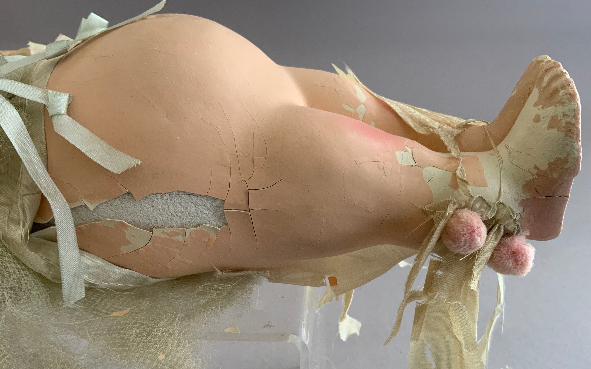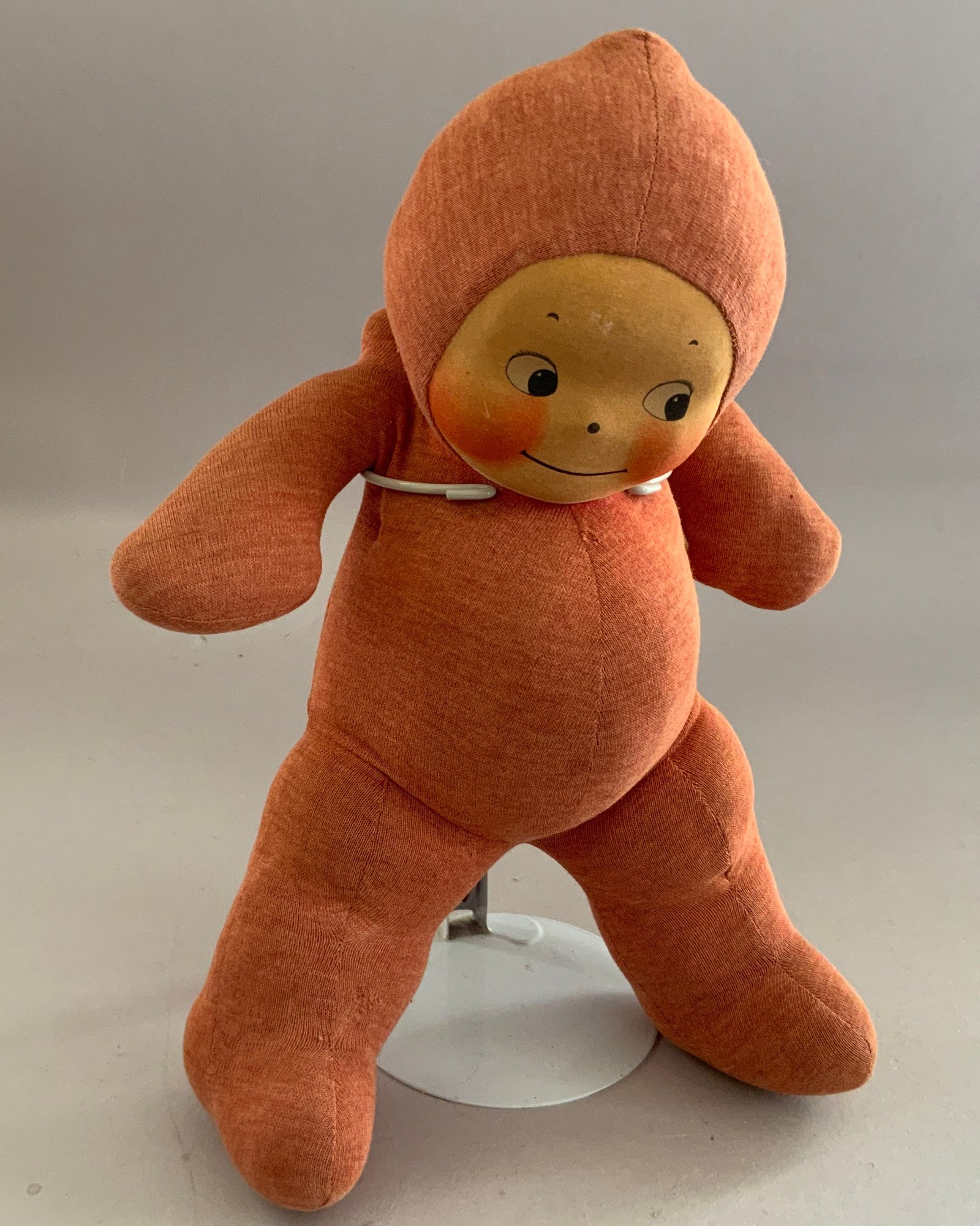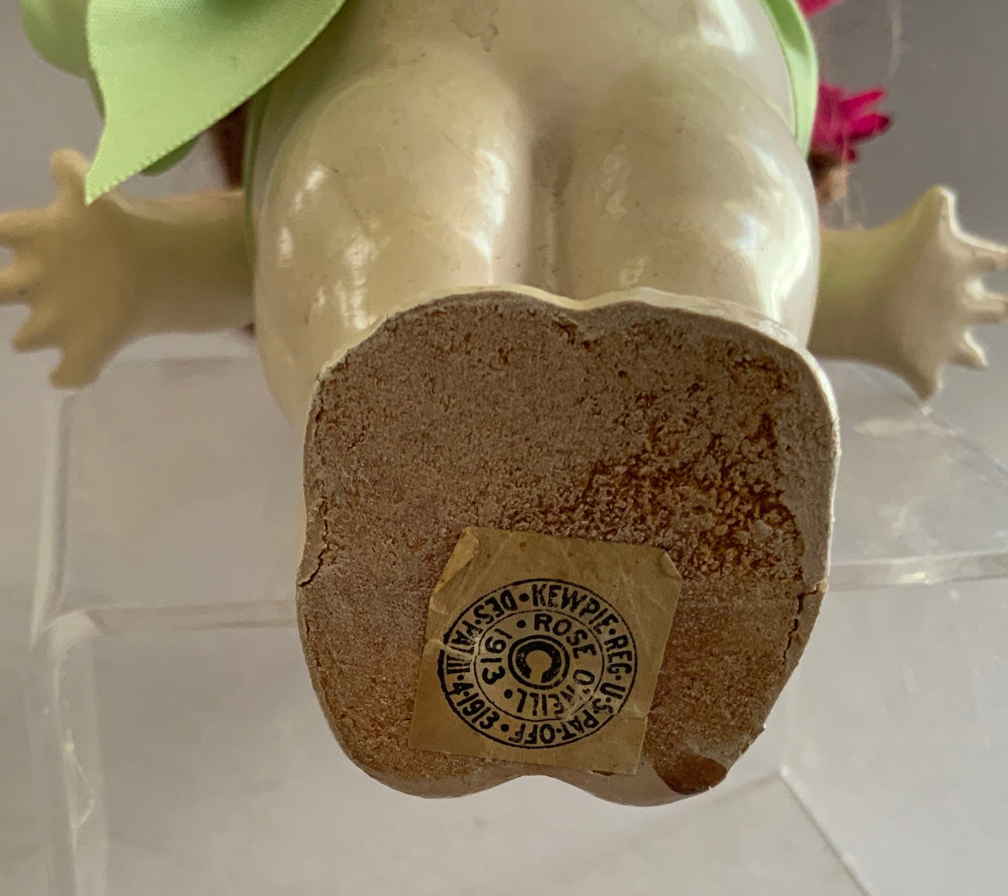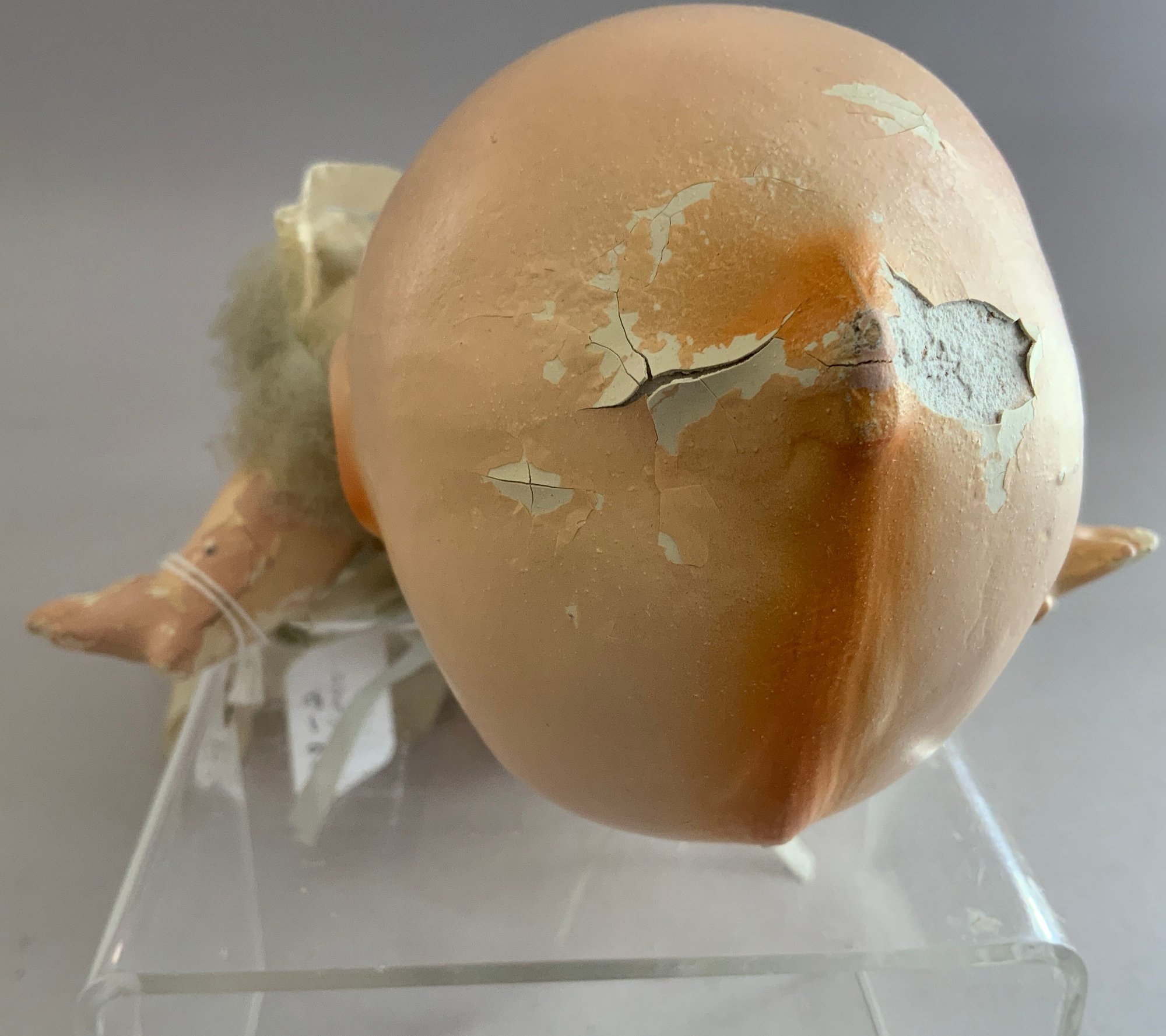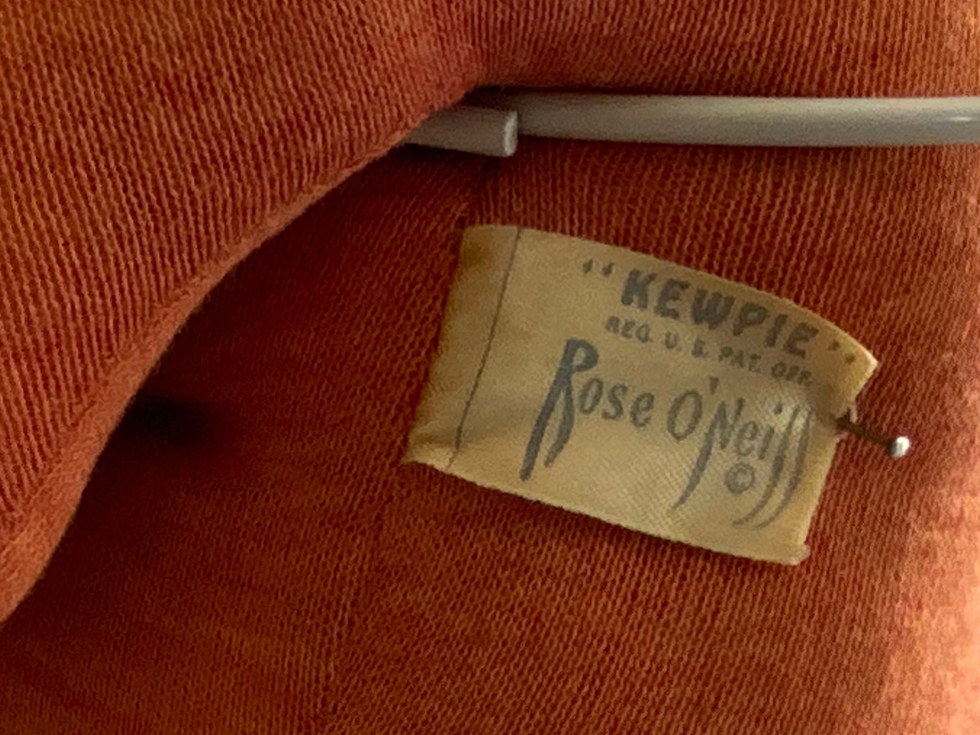 Lot of 5 Kewpies of all kinds: 14” Cloth Cuddle Kewpie, faded red, stockinette body, w/ mask face, side-glancing eyes, lumps on shoulders for wings, comes with a blue calico romper & hat (not original to the doll); 12” Compo Kewpie. body has a lot of flaking, jointed arms only, blue wings, molded top knot has crack on belly & head, black side-glancing eyes, wearing original outfit of silk, ribbons & tulle (melting), (hole in the right foot); 11” All bisque Kewpie, blue wings, (no Label), wears silk & lace (melting), wig glued down; 10”Compo Kewpie, blue wings, arms jointed at shoulders, has Kewpie Heart Label on chest & a Rose O’Neill label, Pat.1913 on the feet, (wig heavily glued down), wears ribbon & a flower in her hair and a 7 ½”Compo Talcum powder doll dispenser, 1913 Rose O’Neill label on the back, blue wings, not jointed, brass “shaker” on back of head, side-glancing eyes, surface is good, (blue paint scuffed), (no cork)