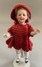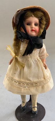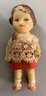 Lot of 5 small dolls: 3” rubber doll in romper (as is), 4 ½” all bisque, glass eyes, o/c mouth, mohair in crochet outfit; 5 ½” ptd. bisque, glass eyes, closed mouth mohair wears straw hat, compo limbs strap shoes; & 1 301/2” all bisque 5-pc bisque body, glass eyes, velvet coat, & 2 ½” all bisque, mohair in a lace dress
