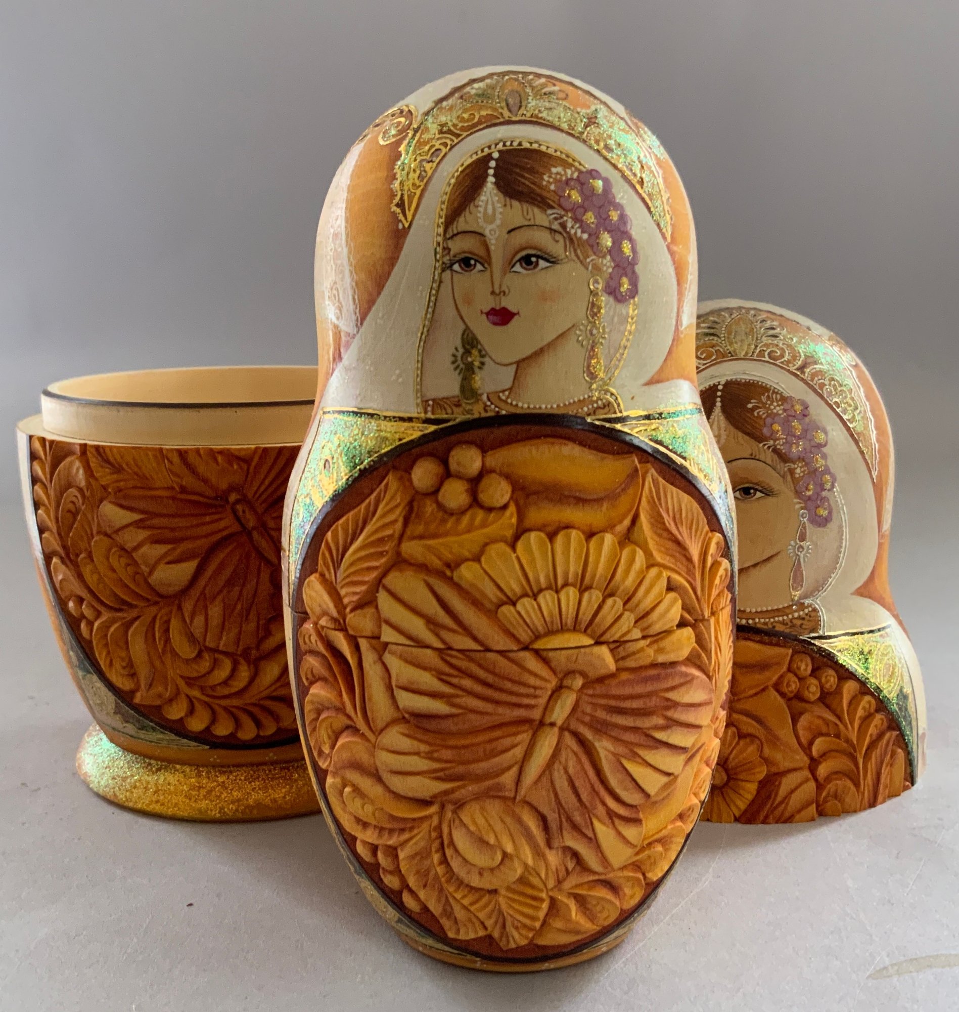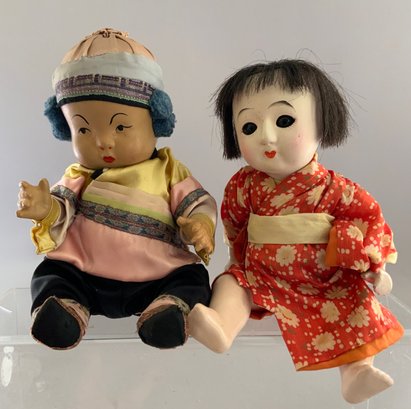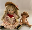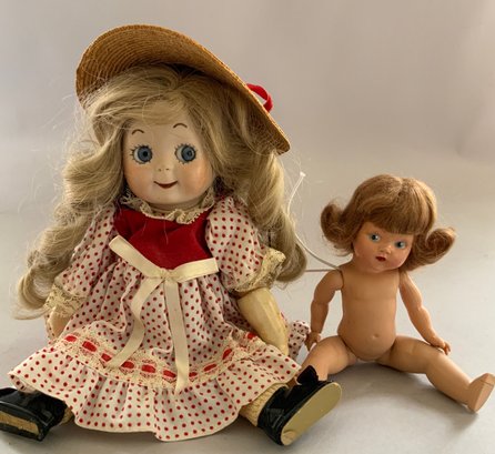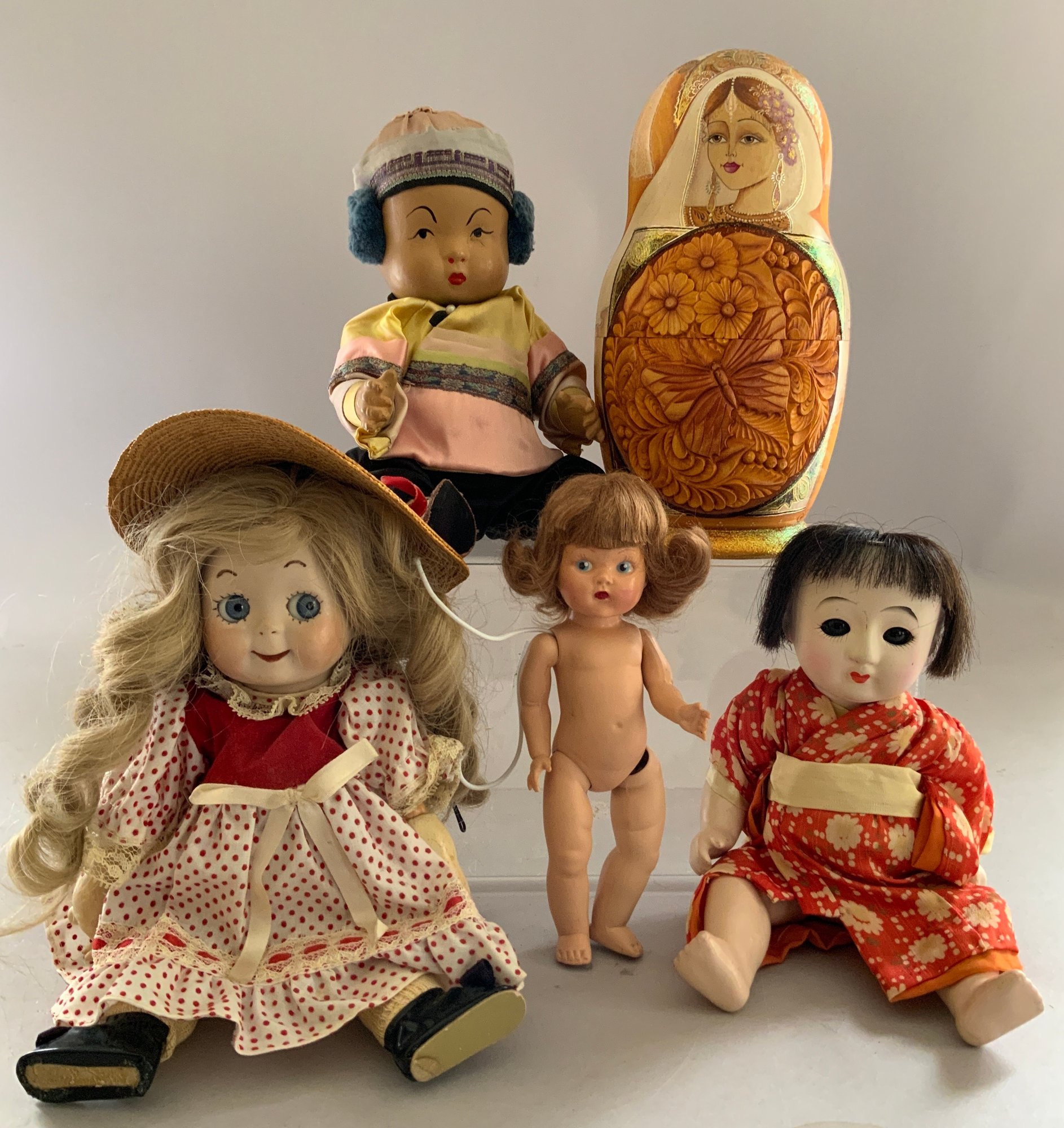 Lot of 5 Small dolls:12” 221 Googly artist-made “1977 Dreher”; red pin-dot dress; 8” Painted-eye Ginny in original pink box (no clothes);