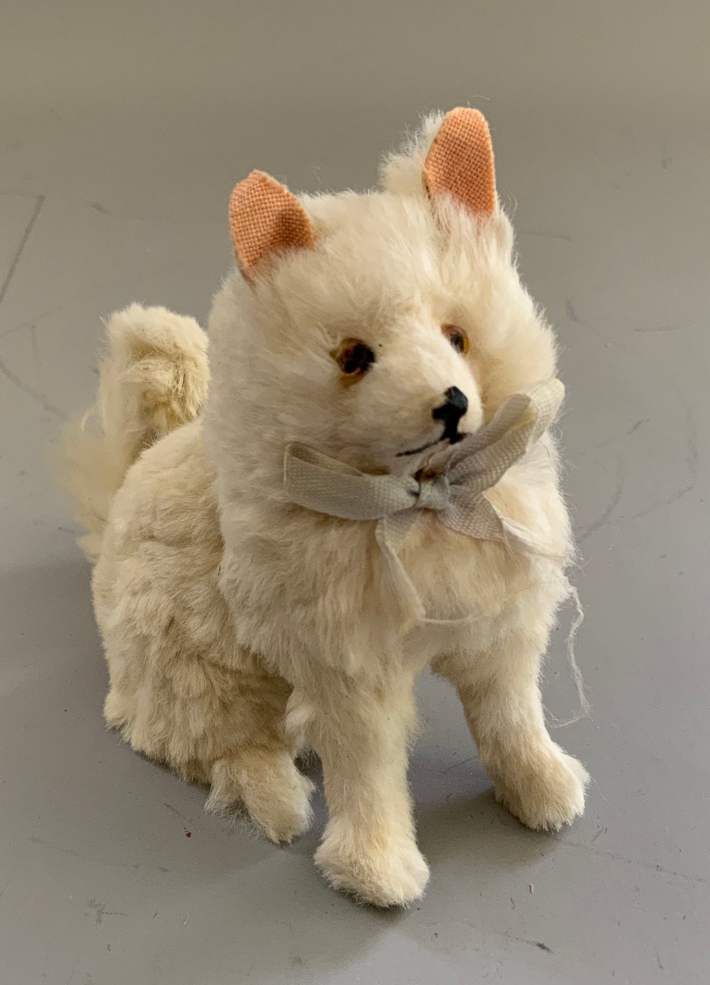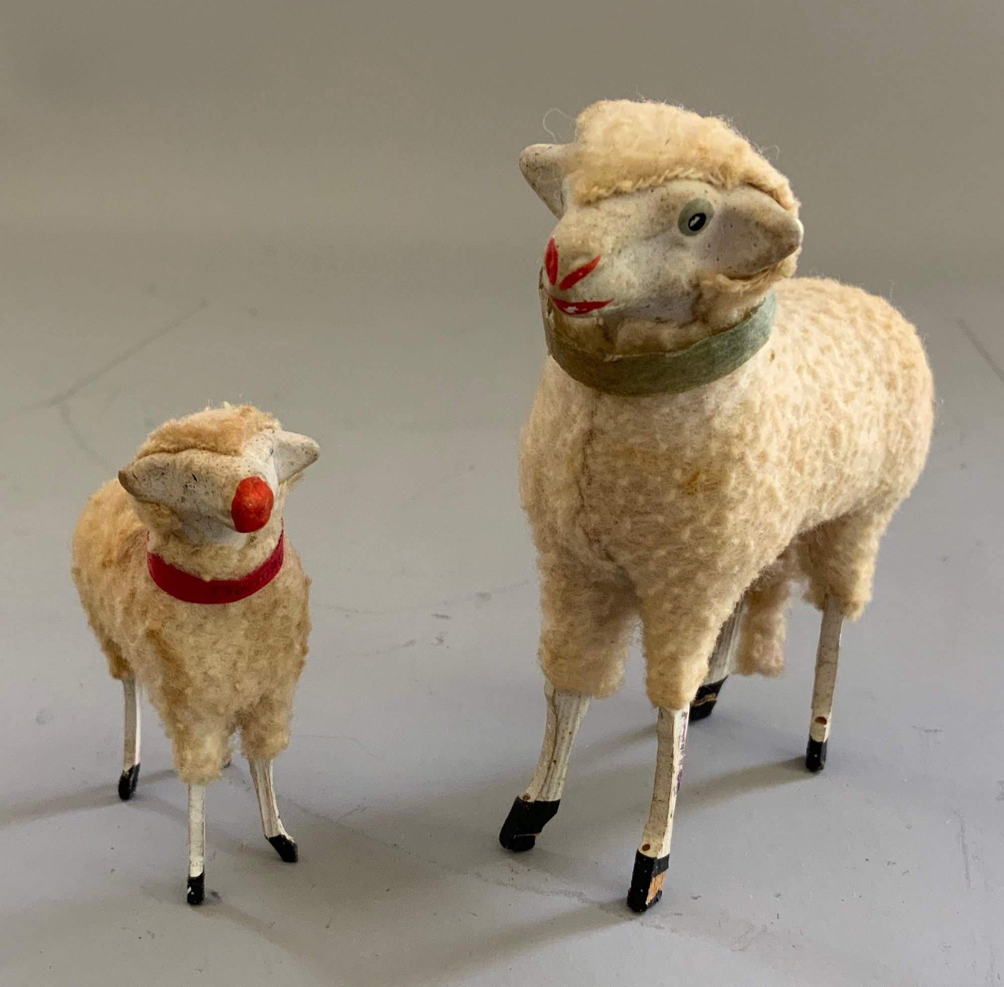 Lot of 5 small fur covered wood leg sheep 2” – 3 ½” tall (1 broken foot), & 1 – 3 ½” tall rabbit fur covered dog