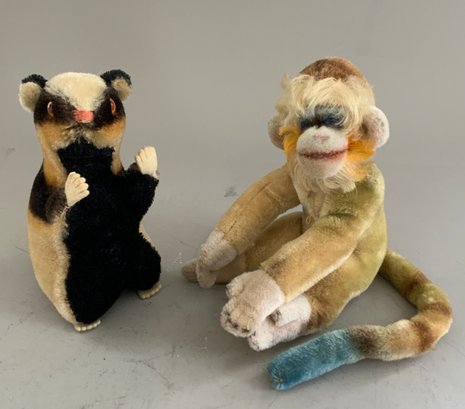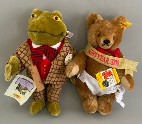 Lot of 5 Steiff animals, Wind in the Willows toad, Badger (no button), monkey (no button), goat (no button), & New Year 2000 Teddy Bear 10” tall