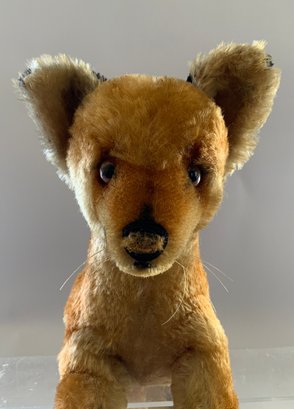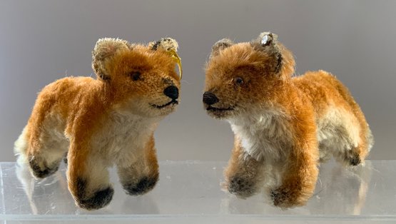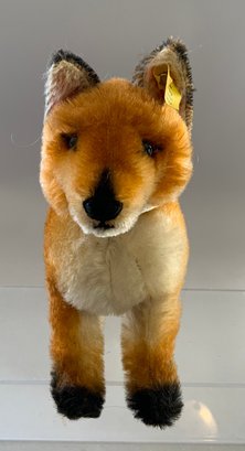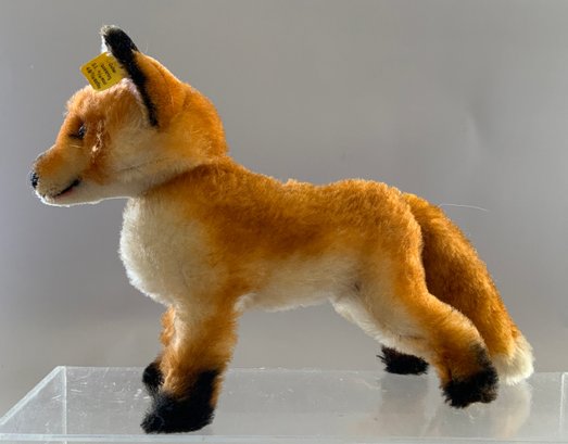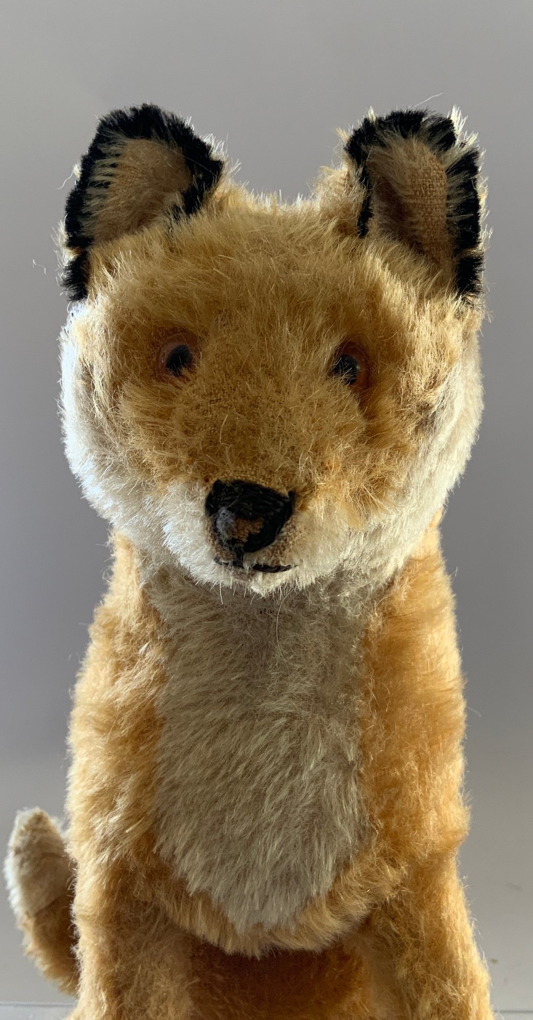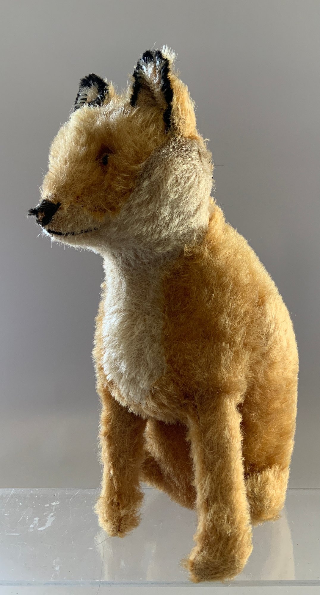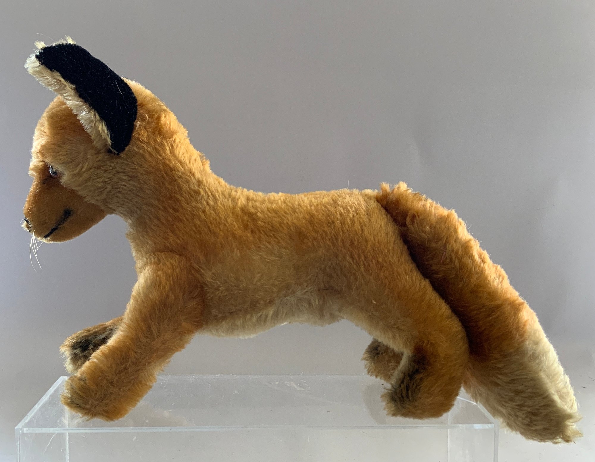 Lot of 5 Steiff foxes, 1 – 12” running fox no button, 1 – 9 ½” sitting fox no button, 1 – 8 ½” standing fox button & US Zone tag, 2 – 6” standing foxes buttons, all played with condition