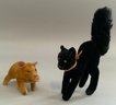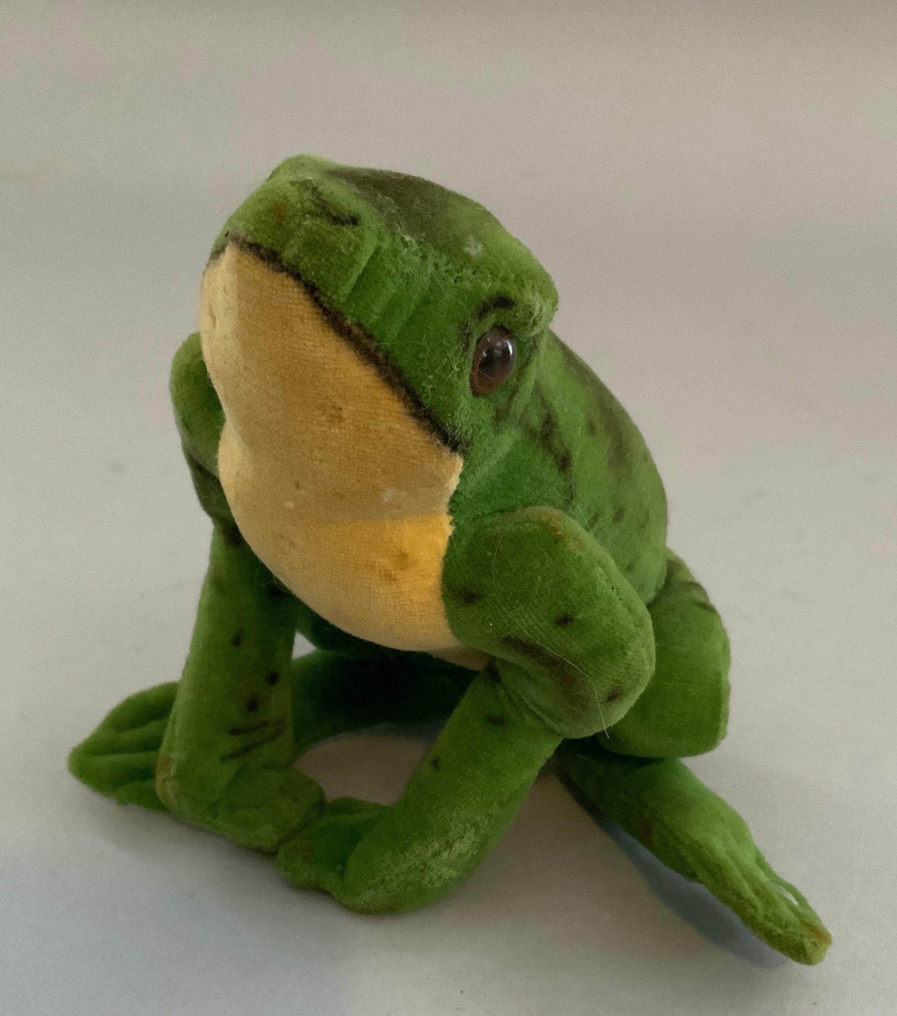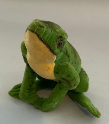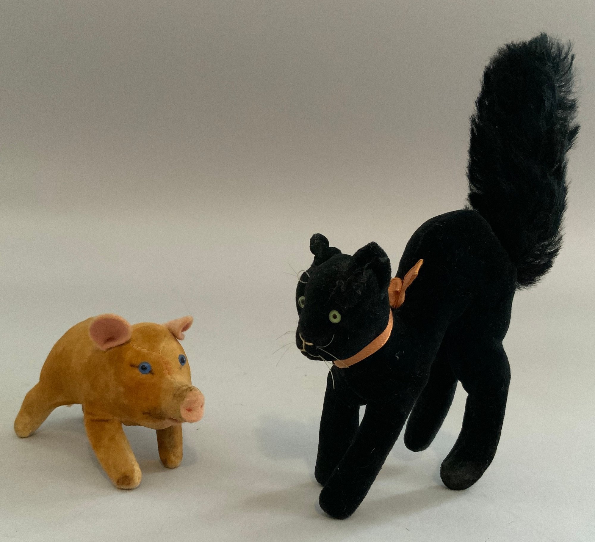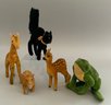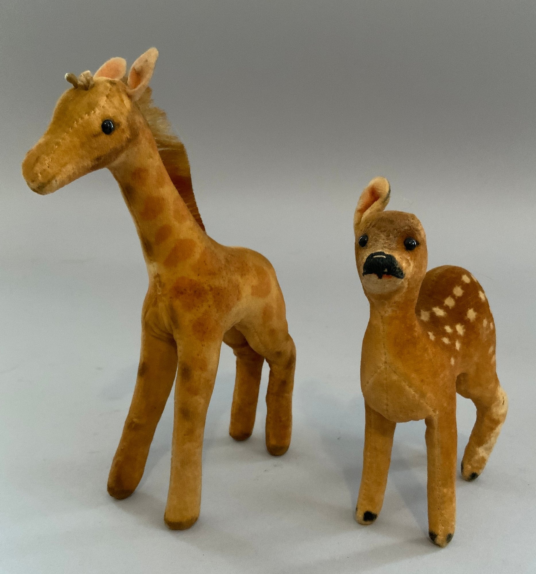 Lot of 5 Steiff velveteen animals, 4 ½” tall frog with button, 6” T black cat, 4” L pig, 6” tall giraffe, & 4 ½” fawn no tail, all played with condition