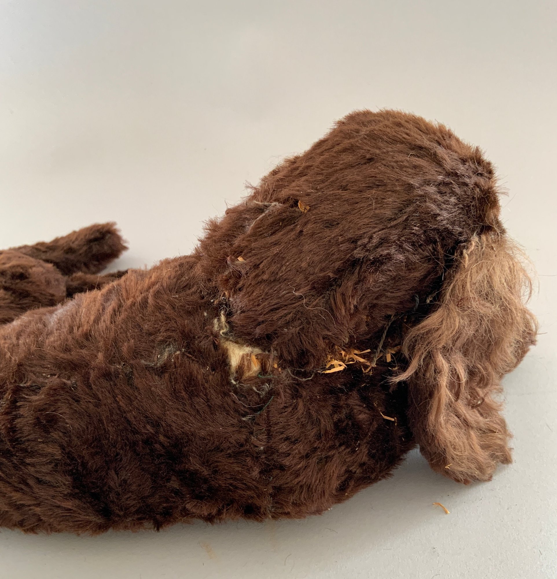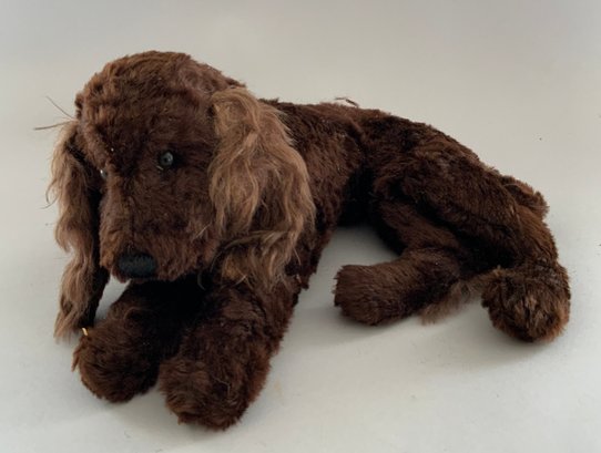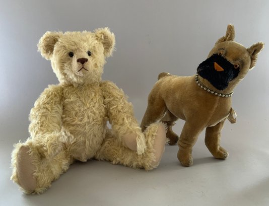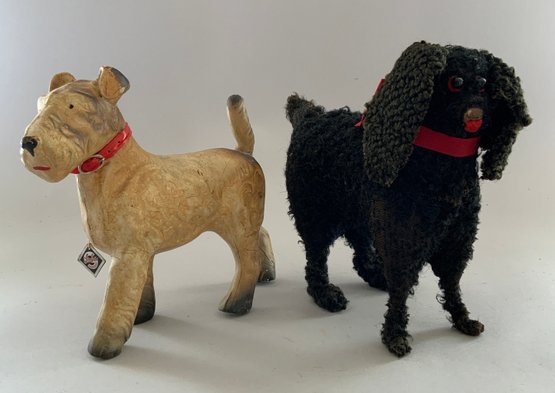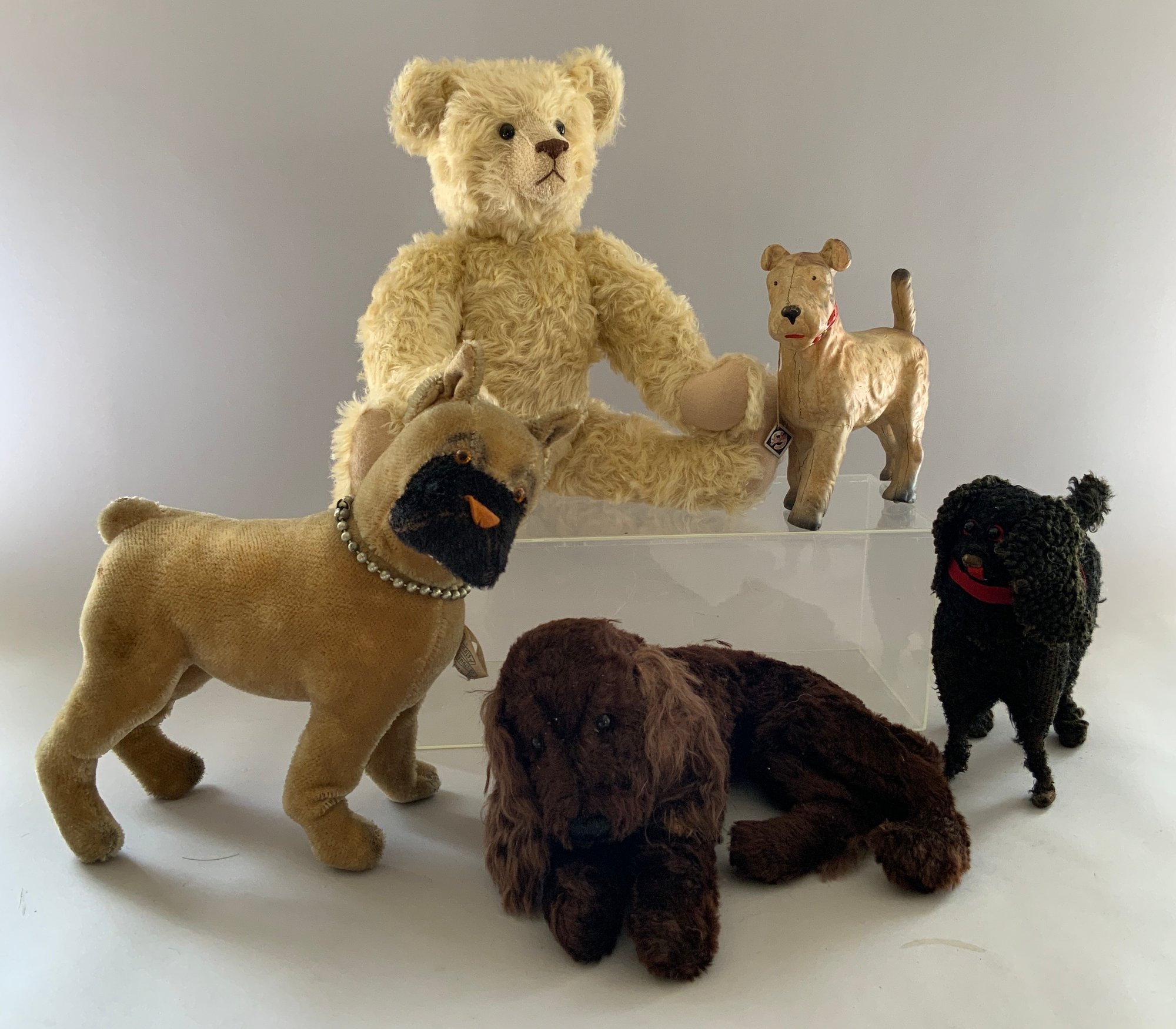 Lot of 5 toy animals, 1 – 18” Diana Lind blonde mohair bear, Hillsboro NH, 1 – 8” long German Steha terrier on rollers with tag, (crazing), 1 – 14” long Knickerbocker Boxer dog with tag, light stains, 1 - 10” black mohair poodle, heavy wear, & 1 – 12” English Jungle toy cocker Spaniel “Dash” with tag, dark brown heavy wear