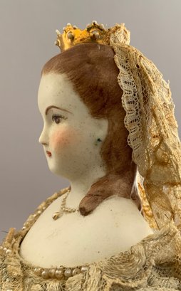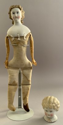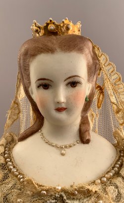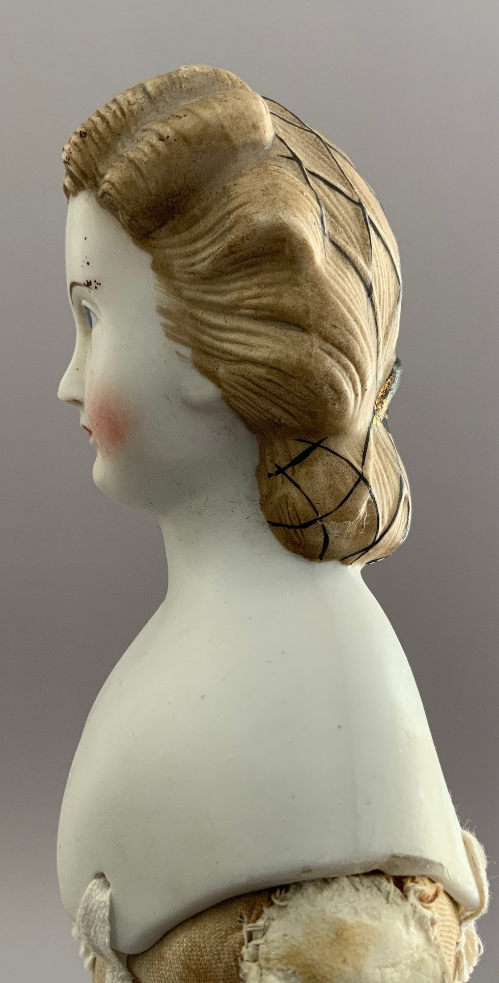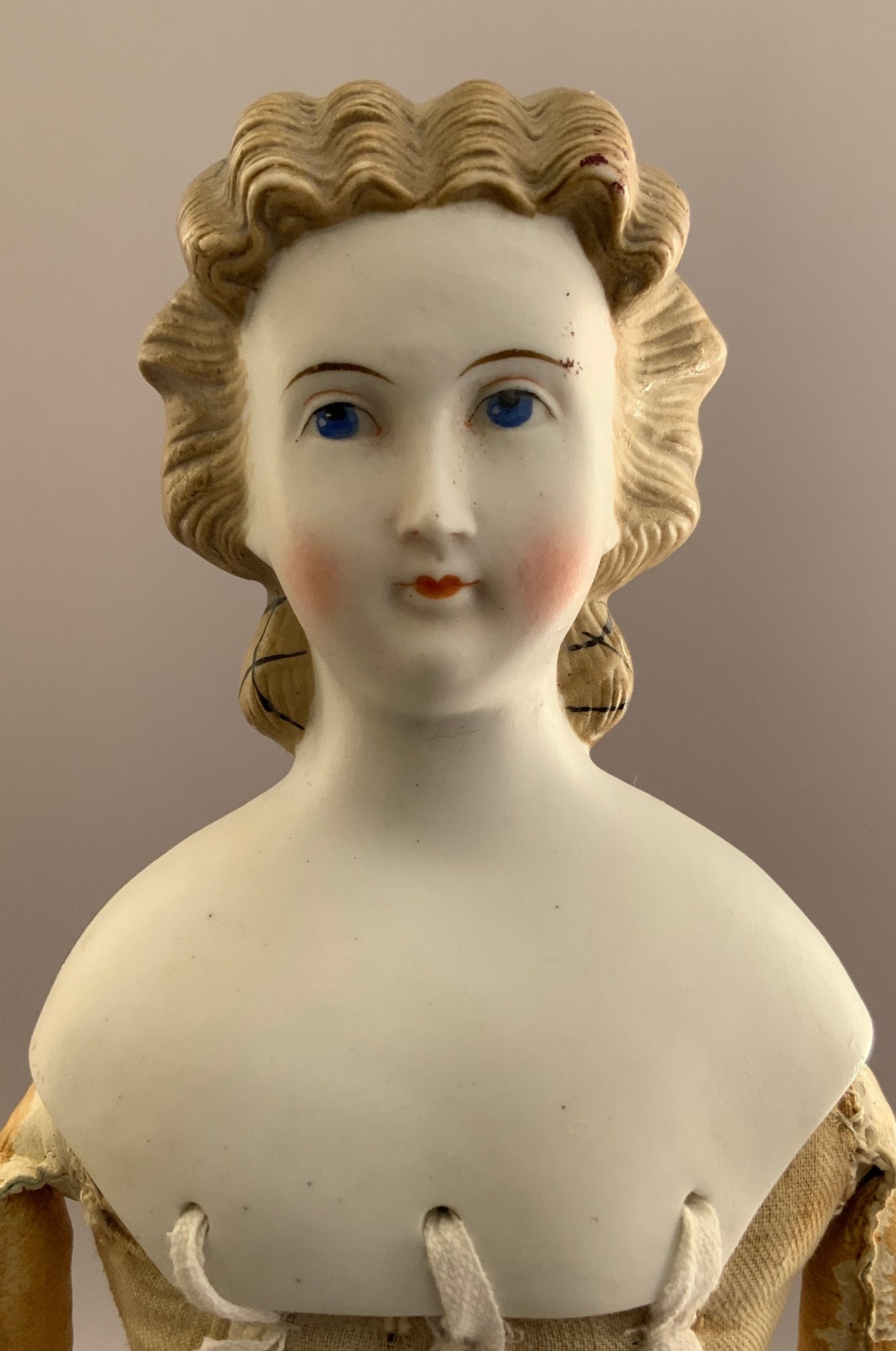 Lot of 6 assorted parian dolls/head of various sizes, 1 – 15” artist doll by Manni in lace dress, 1 – 16” blonde hair parian no clothes, 3 – 6” parian dolls, no clothes, 1 – 3 ½” blonde hair parian head