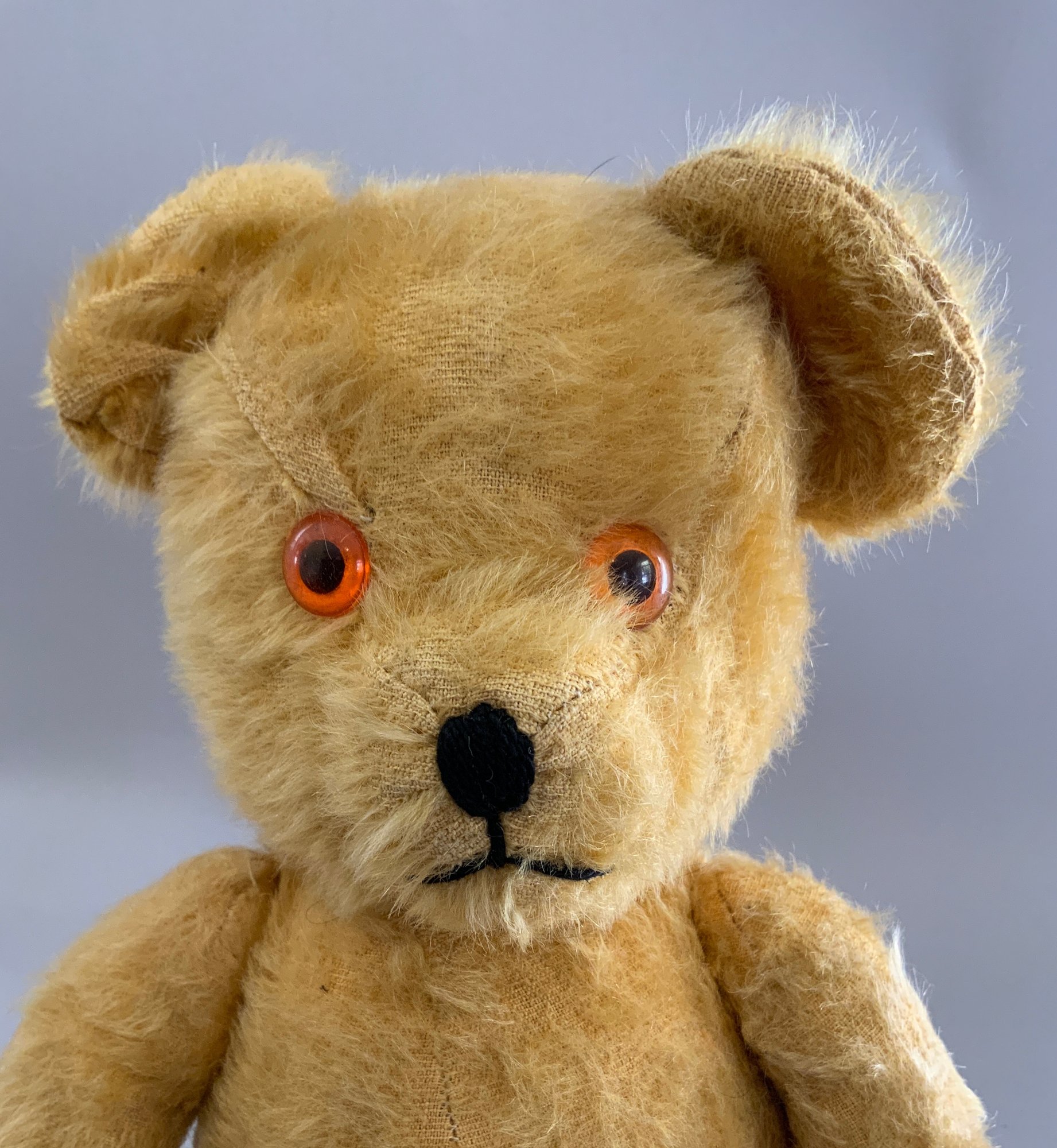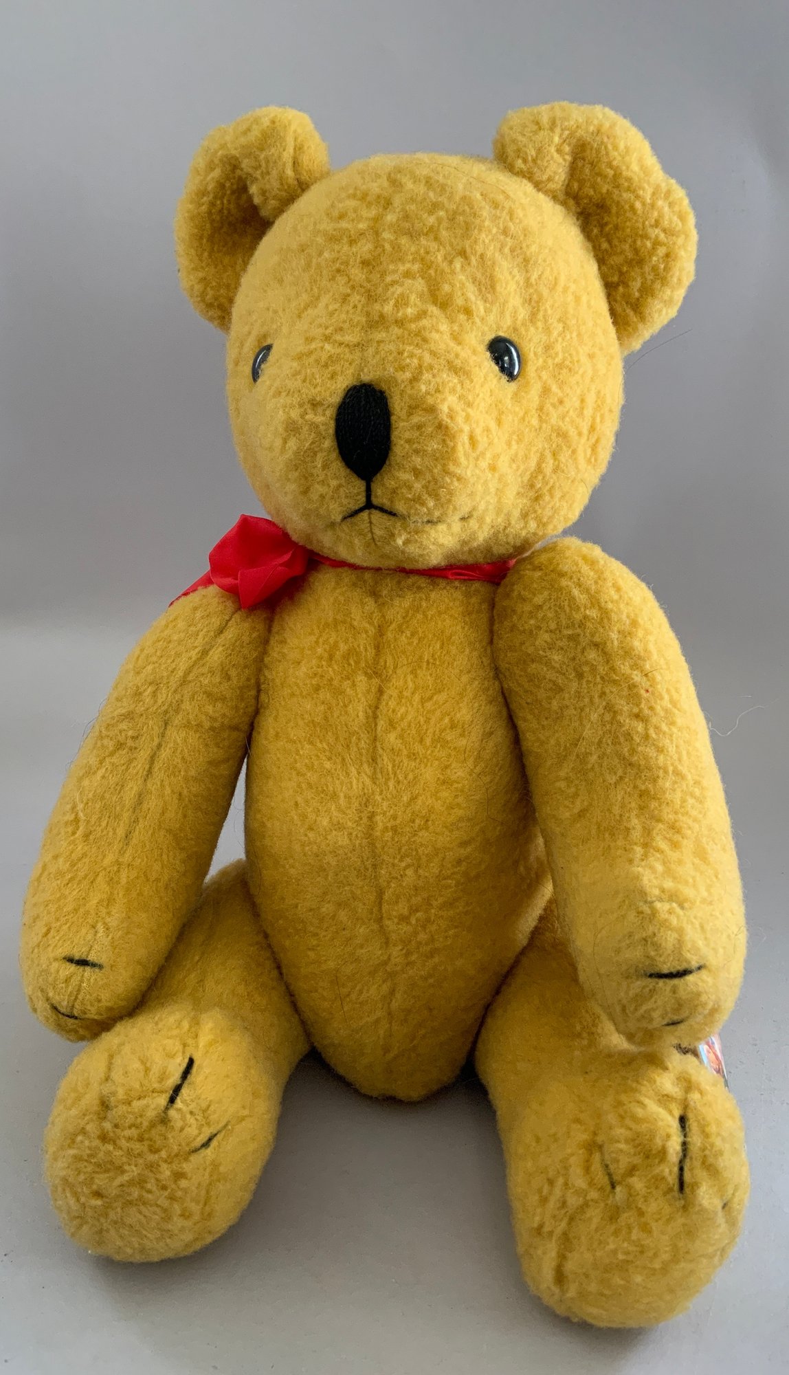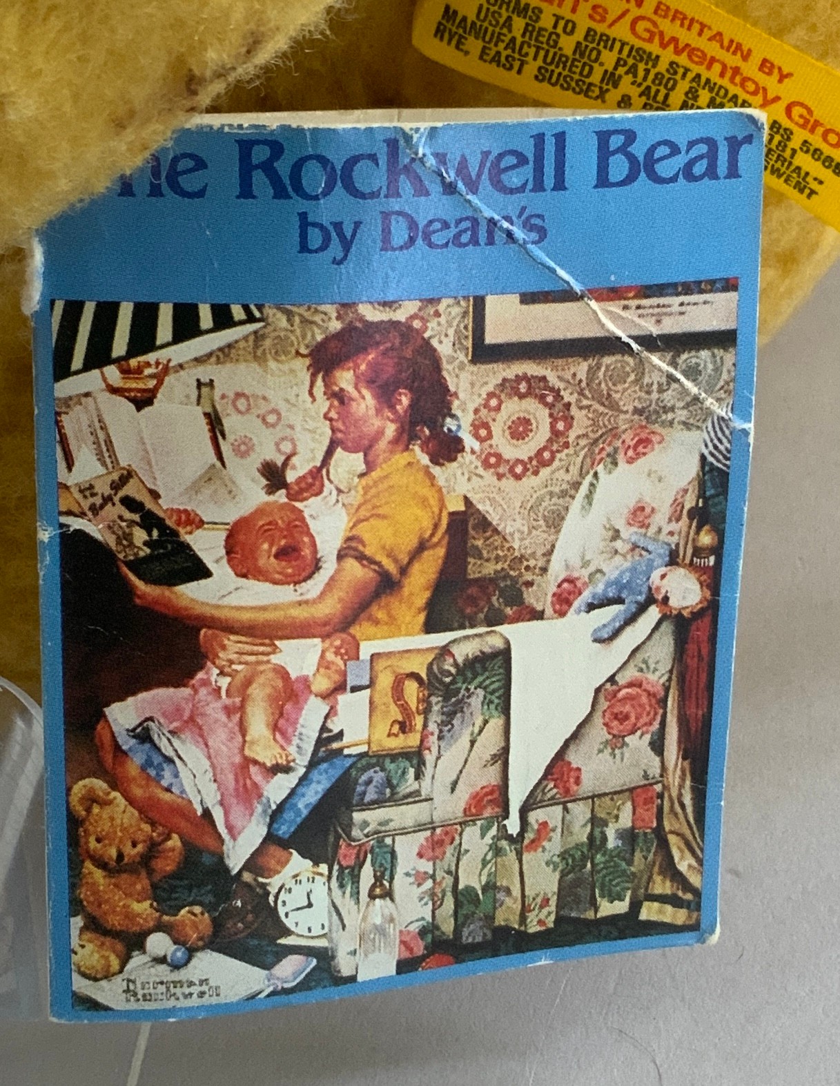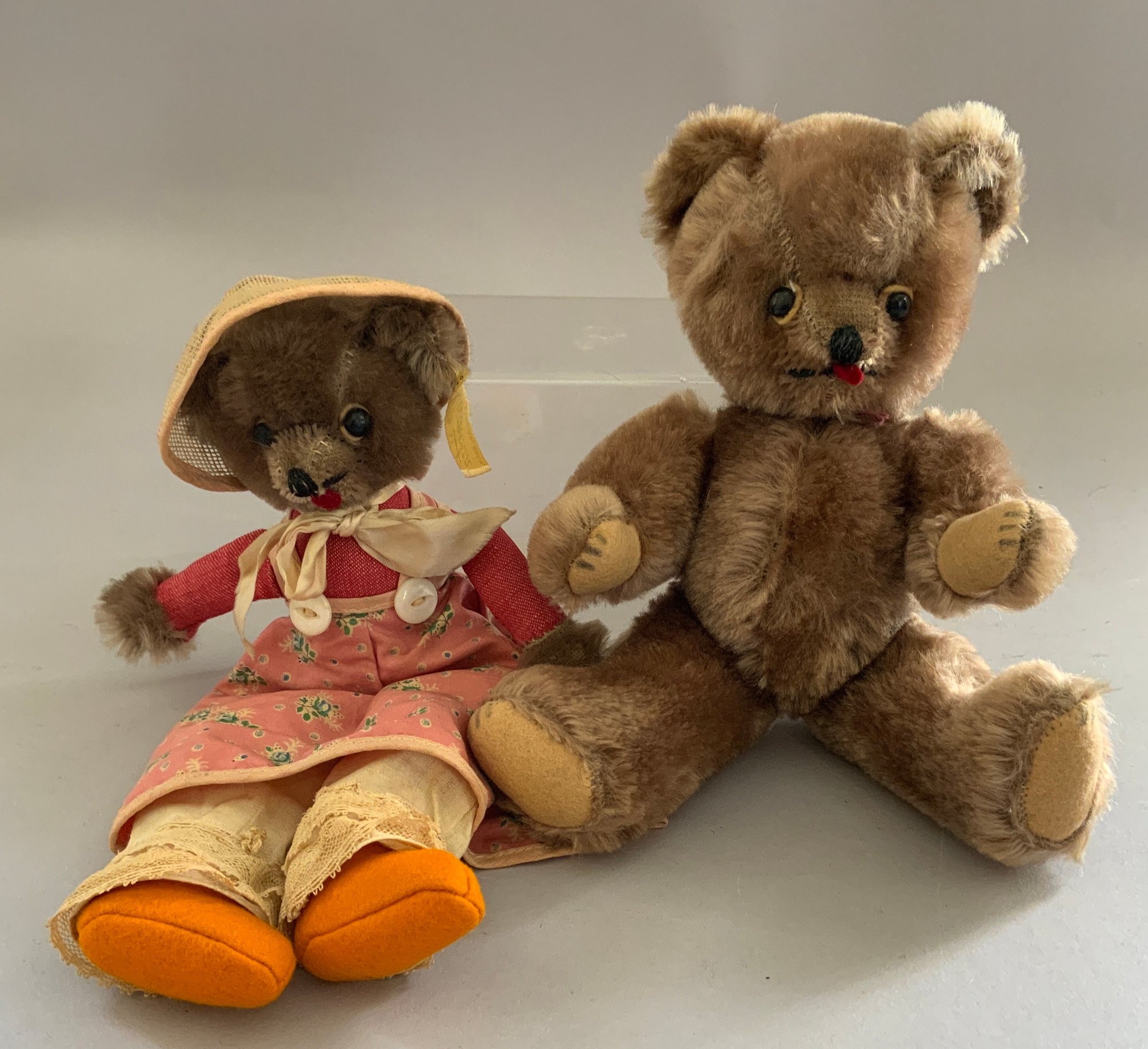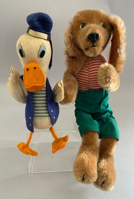 Lot of 6 asst. animals: 17” Dean’s Rockwell Bear, 17” Mohair Gold Bear (worn), 10” cocoa bear, 11” Character bear, Norwalk, CT, 12”Googly-eyed Hound & 9”Felt Sailor Duck (as-found)