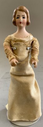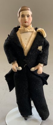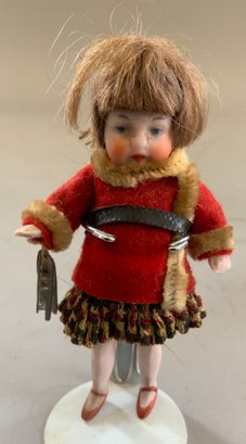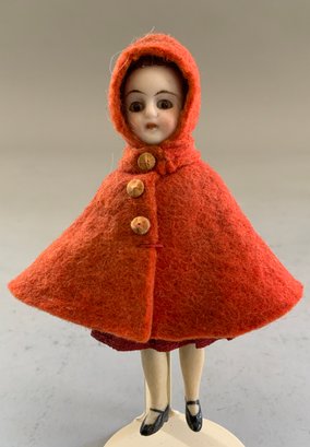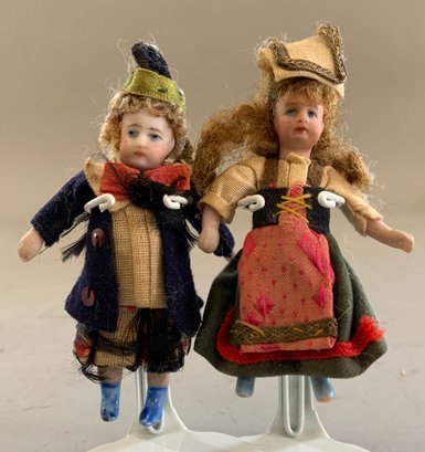 Lot of 6 Doll House Dolls: 5” Bride & Groom in formal attire ; 3 ½” flapper girl , pleated skirt w/ skates; 4” Red Riding Hood, glass eyes; & a 3” pair all bisque Dolls, all original, swivel necks, mohair, regional costumes (French?)