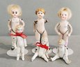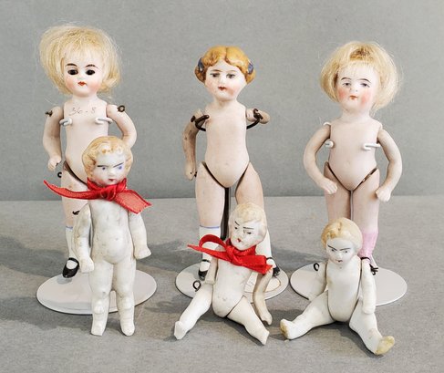 LOT OF 6 GERMAN ALL BISQUE DOLLS - 2 1/4" - 3 1/2", ALL HAVE JOINTED ARMS, 4 HAVE JOINTED LEGS, 1 DOLL IS MISSING PART OF THE LEFT ARM & HAS A CHIP AT BOTH HIPS, 1 DOLL W/ RED RIBBON IS MISSING PART OF RIGHT ARM & LEFT FOOT