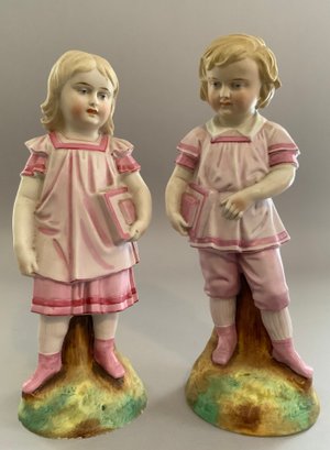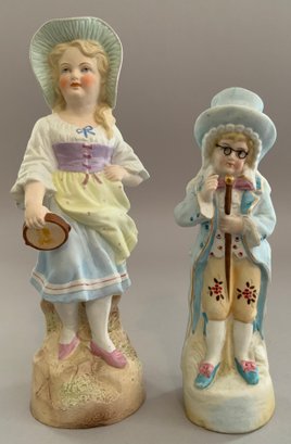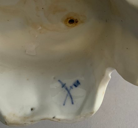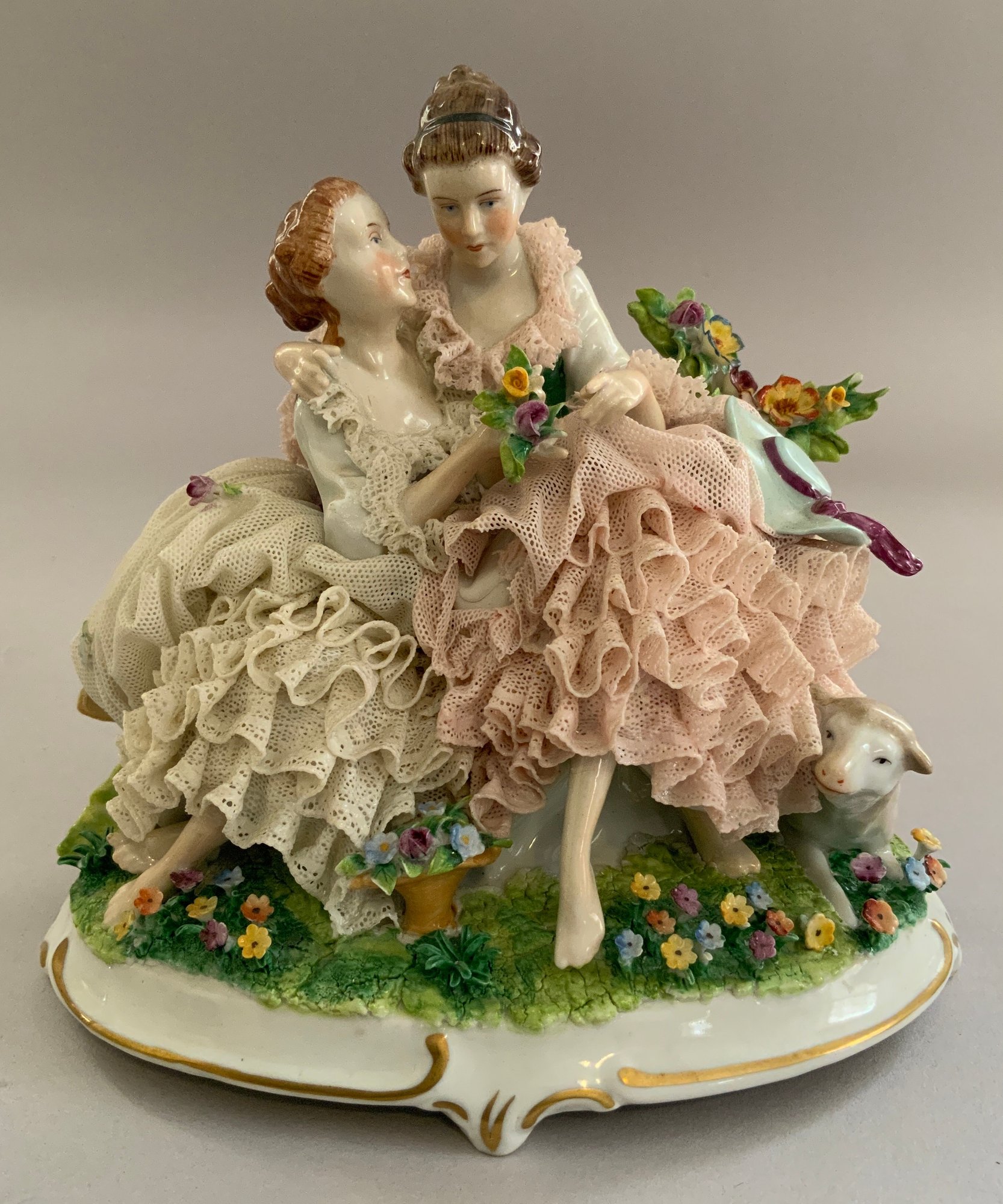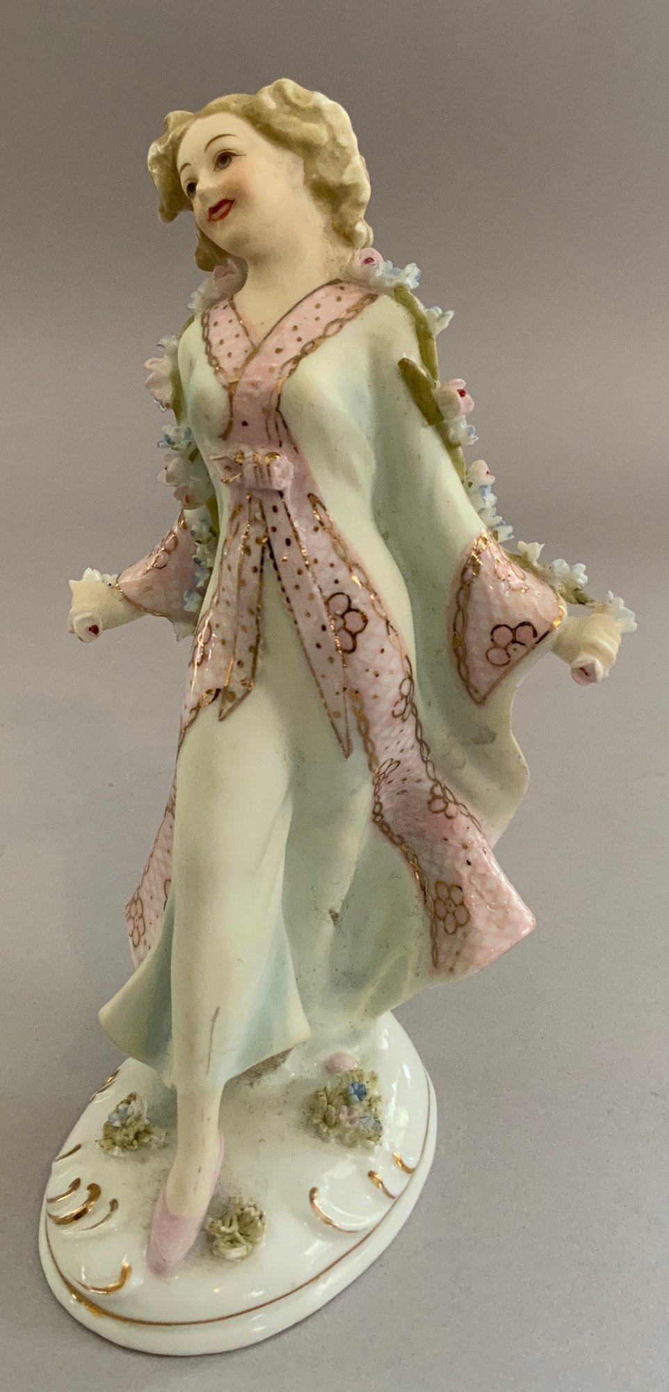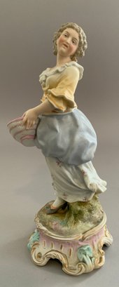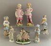 Lot of 7 – figures/figurines, 1 – 7 ½” long Unter Weiss Bach Dresden lace, 2 woman & a sheep on floral base (damage to pink lace), 2 – porcelain 12 ½’ figures of boy & girl in pink holding books, probably German, (nick to 1 base), 2 – 10” porcelain figures of woman, 1 holding a wash tub (cross sword base mark), 1 – 7 ½” Lefton china lady, & 1 – 8 ½” porcelain lady dresses like a man