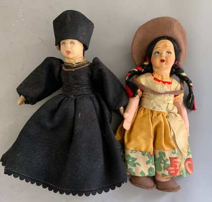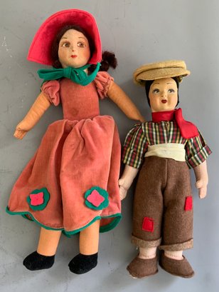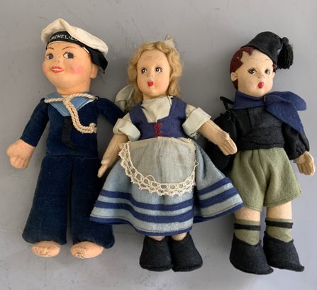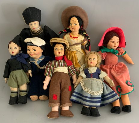 Lot of 7 molded felt cloth dolls 7” – 11” tall, painted features, Lenci type & Norah Wellings sailor, all in original outfits