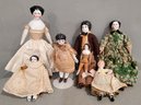 LOT OF 7 SMALL GERMAN CHINA HEAD DOLLS - 3 1/4" - 7", CHINA SHOULDER HEADS, CLOTH BODIES W/ CHINA / BISQUE LOWER ARMS & LEGS, MULTIPLE BREAKS TO ARMS & LEGS, 1 HEAD IS MISSING FRONT SHOULDER HEAD