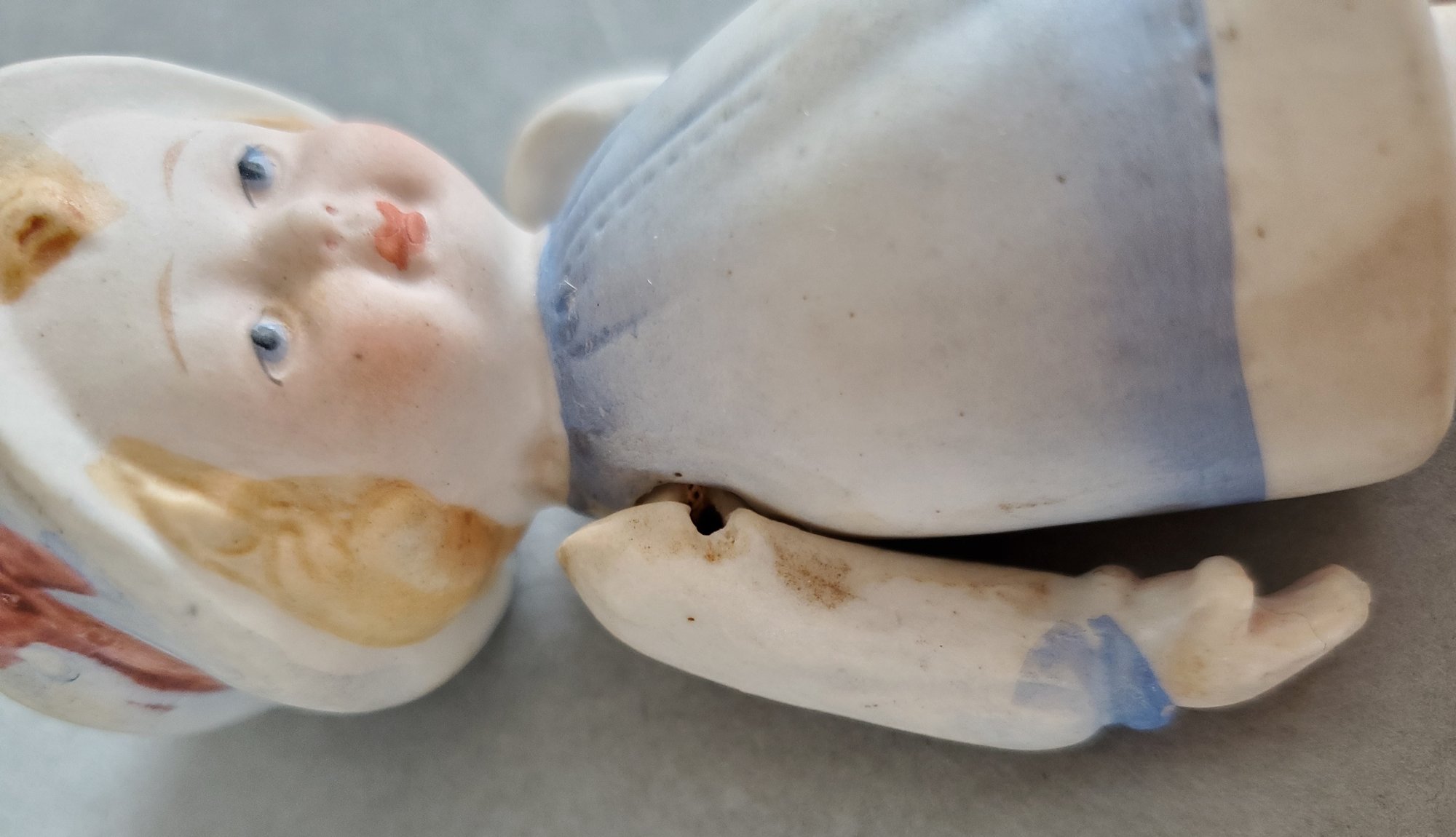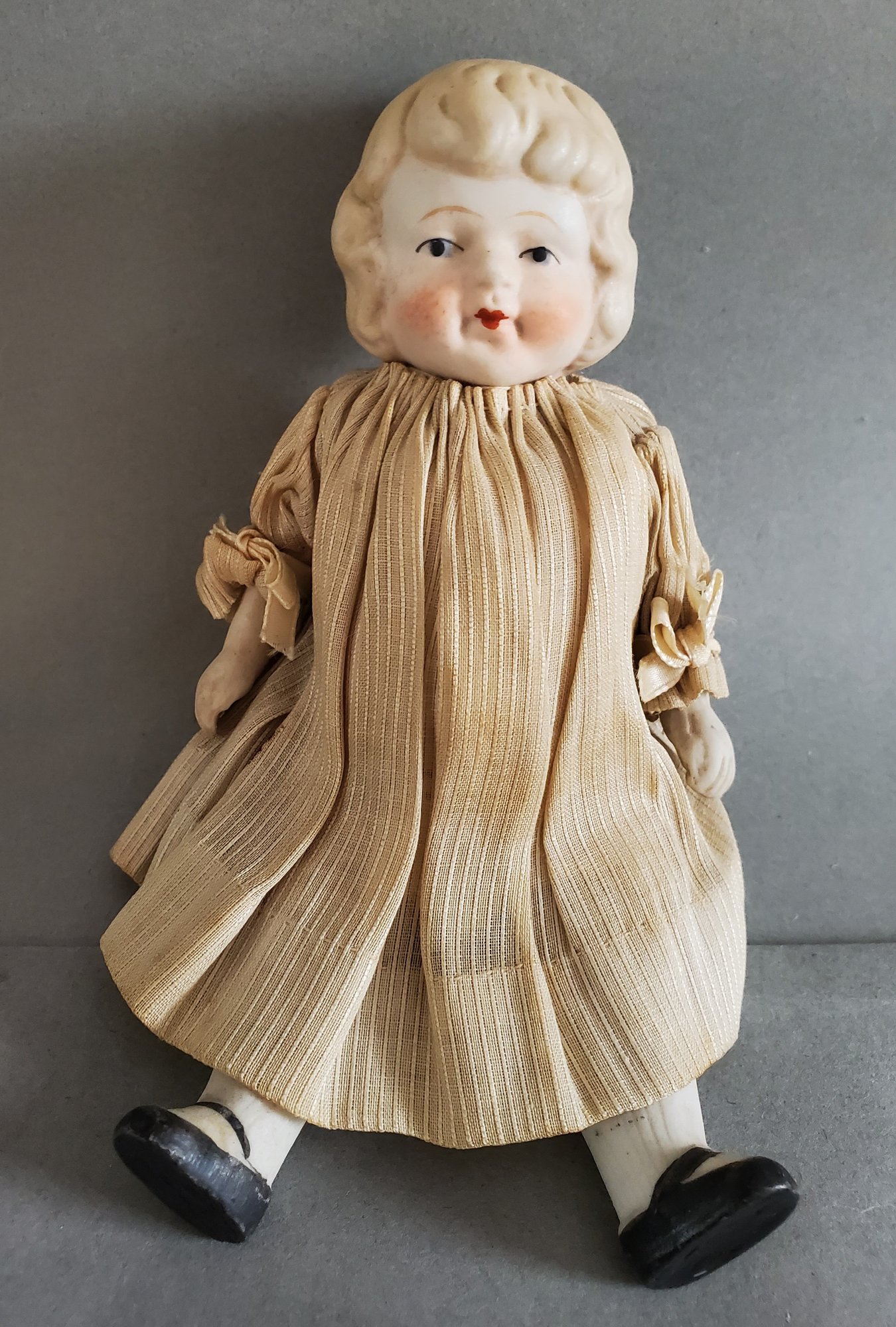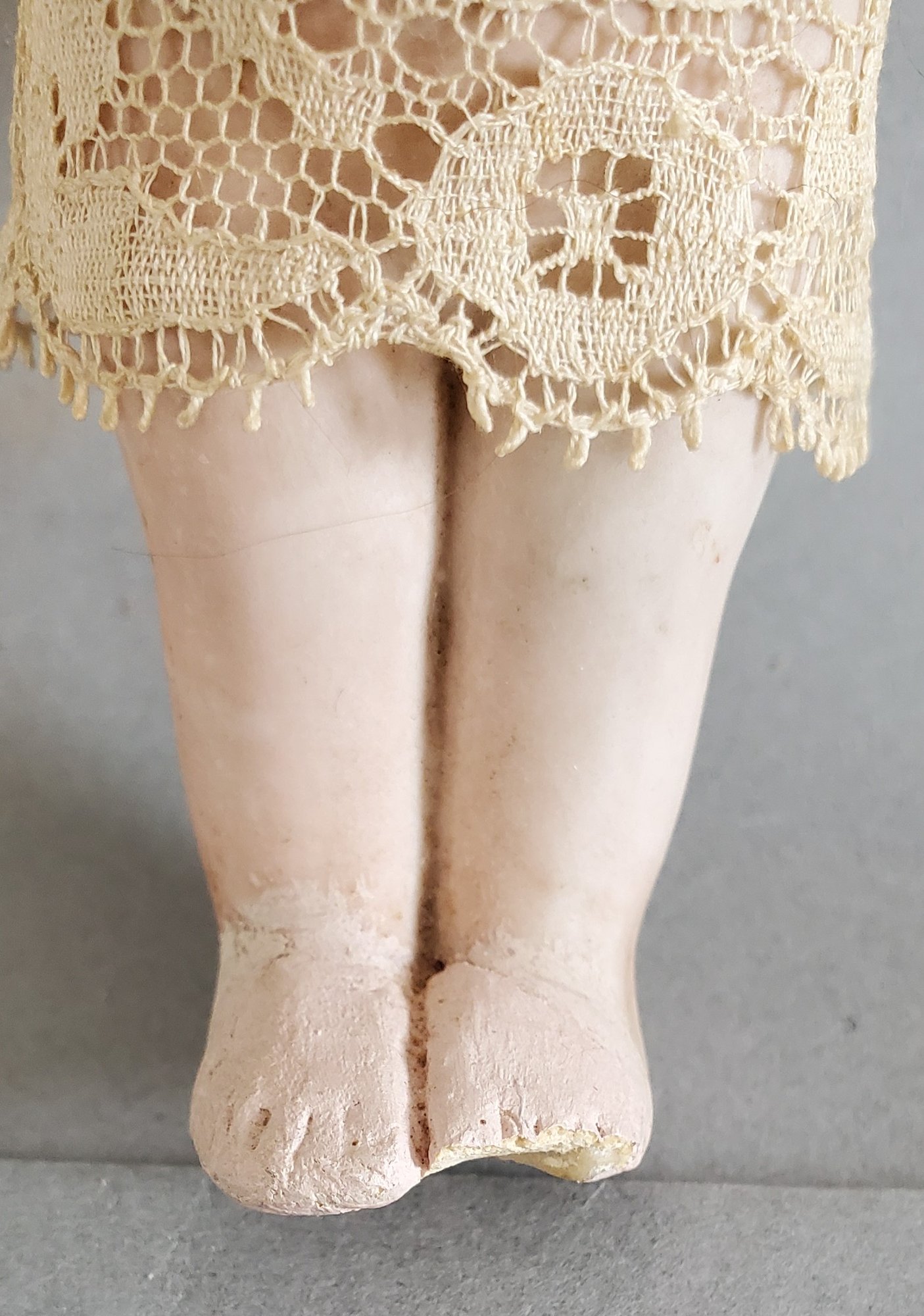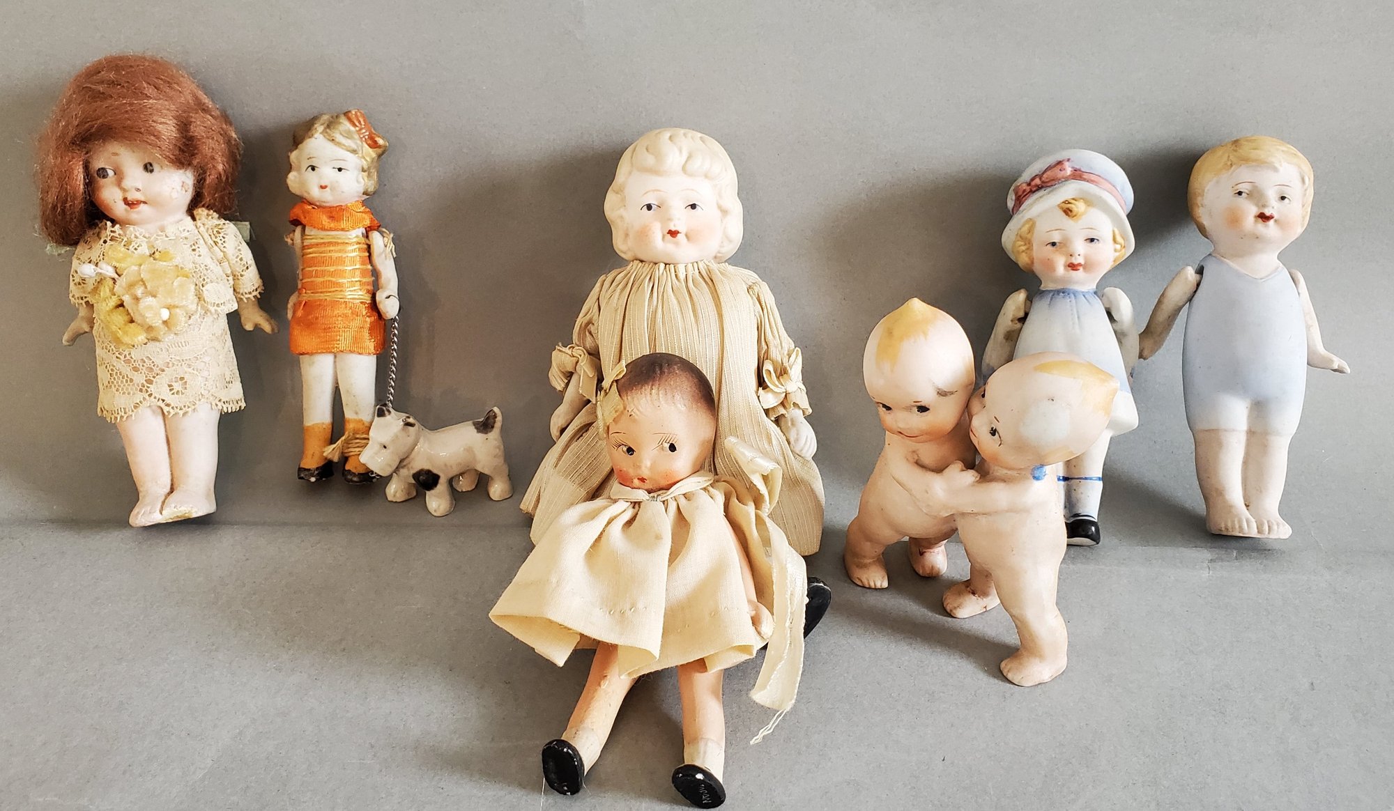 LOT OF 7 VINTAGE JAPANESE ALL BISQUE DOLLS - 3 1/2" - 6 1/2", FIRING FLAW TO KEWPIE FEET, DOLL W/ WIG HAS A REPAIR TO HER FEET
