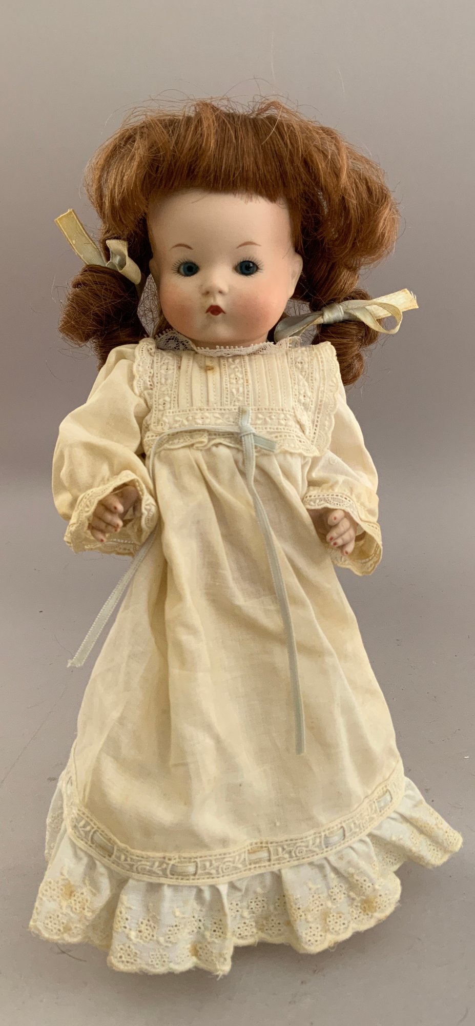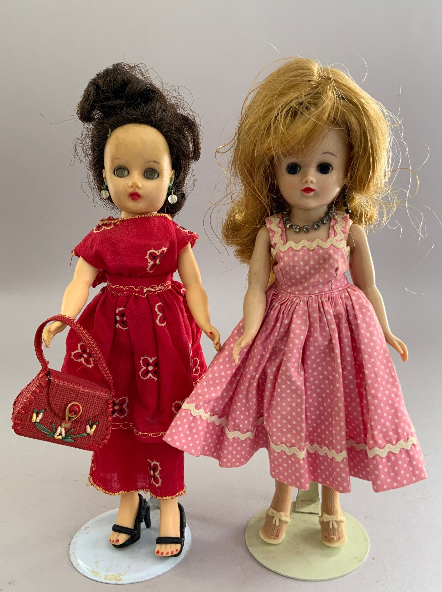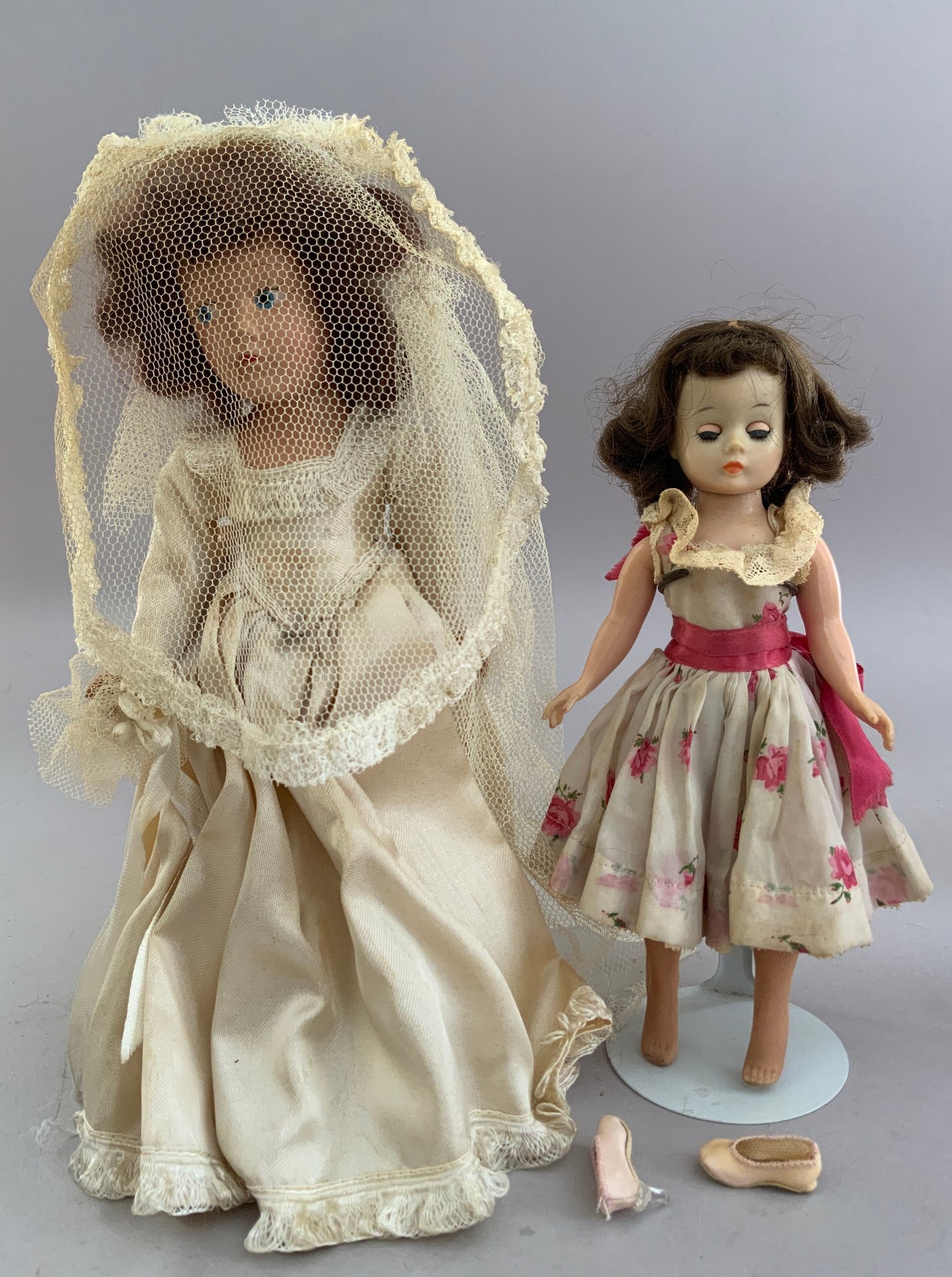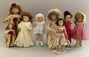 Lot of 8 Asst. dolls: 211” Jills, an 11” Bride in old box, a 9” Betsy McCall- type, 2 “Just Me” artist dolls (AM 310 repro} & a Vogue “Just Me” in original package, a compo big sister & little sister dressed alike