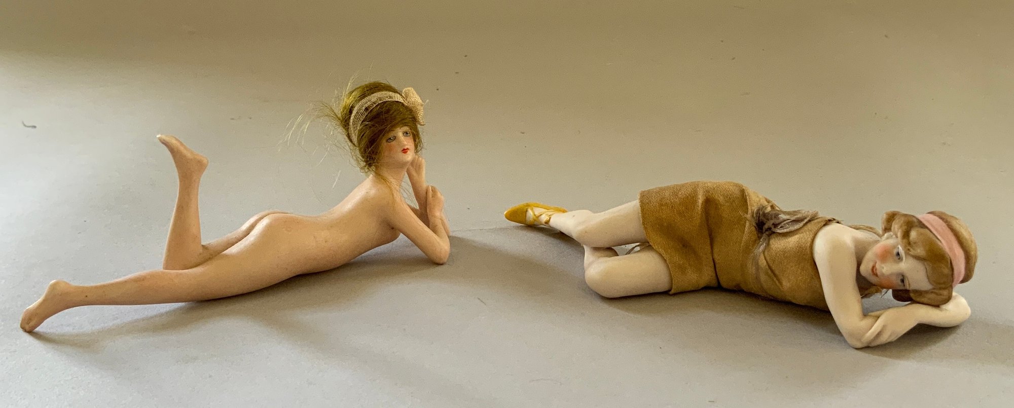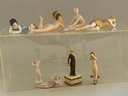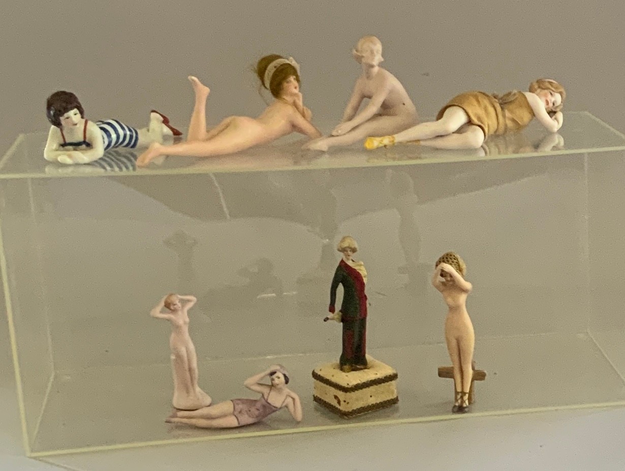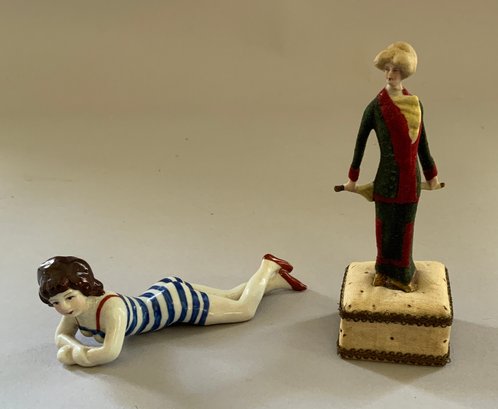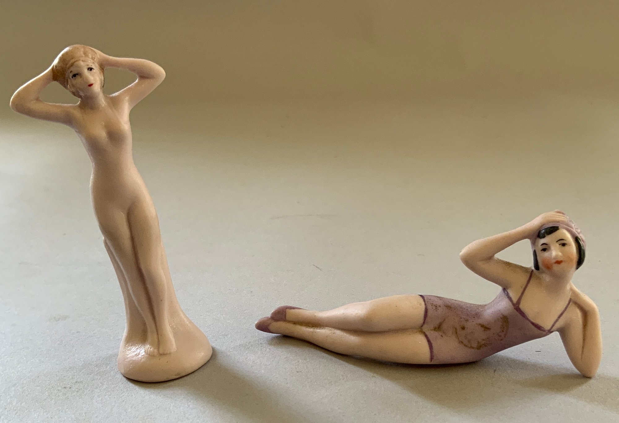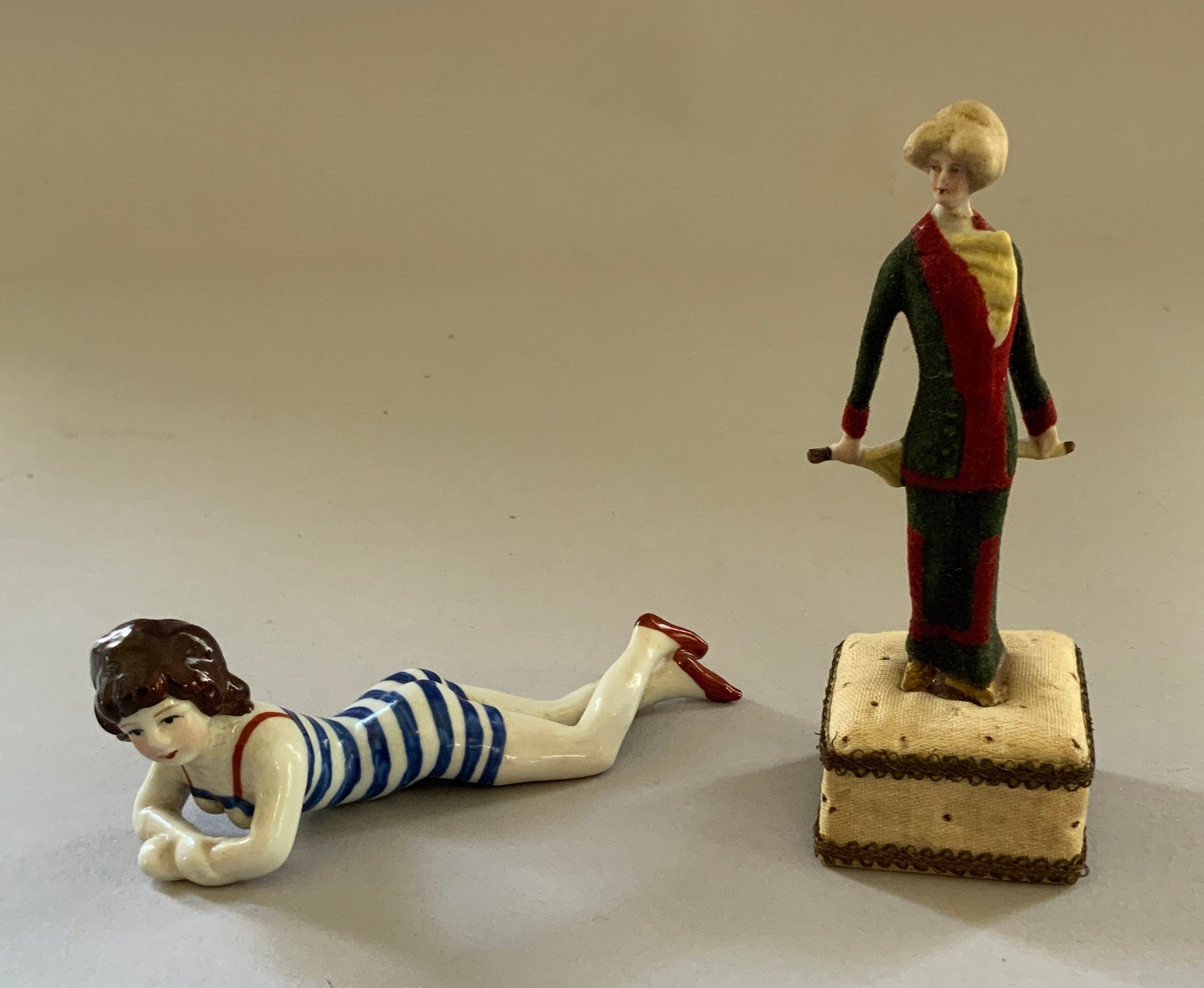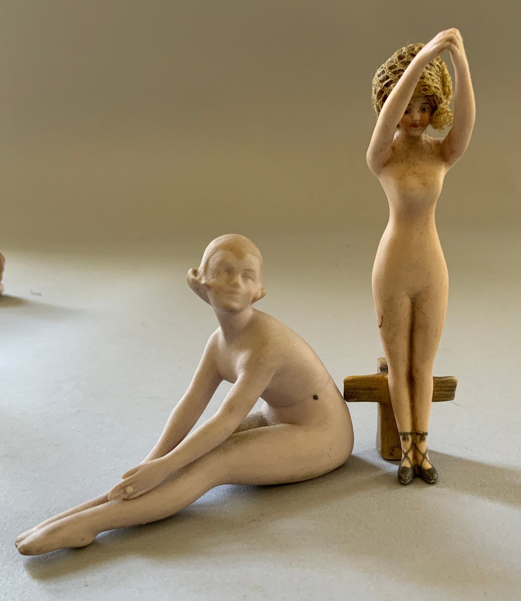 Lot of 8 items, 7 – Bathing beauties 3” – 6” long, all bisque & 1 china, various poises & 1 – 4 ½” all bisque figure on a pin cushion